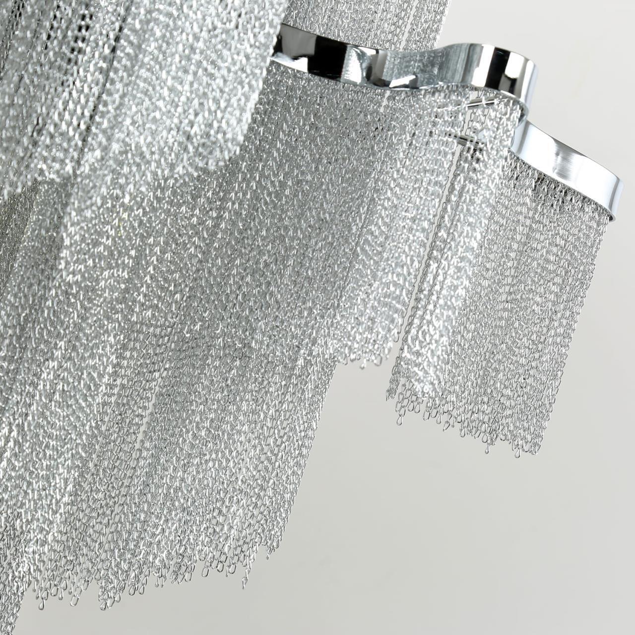 Металлический хромированный каркас, декор из серебристых цепочек, регулируемая высота, сменная лампа, цоколь Е14.