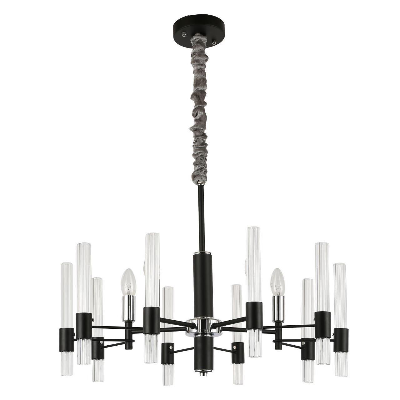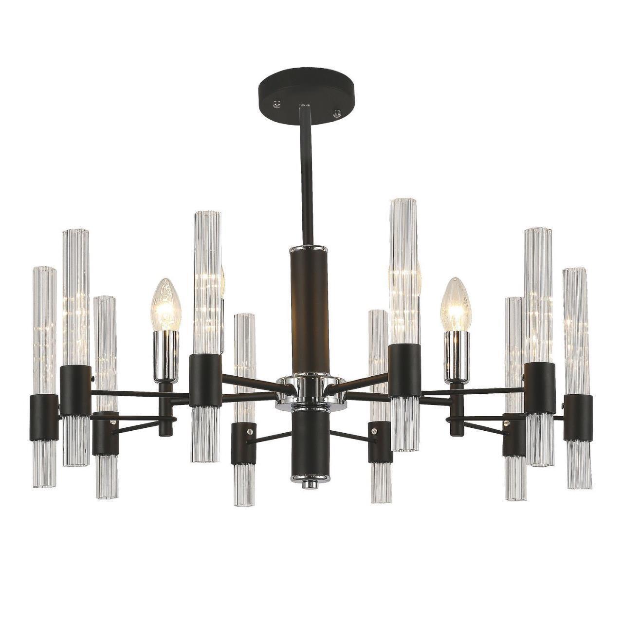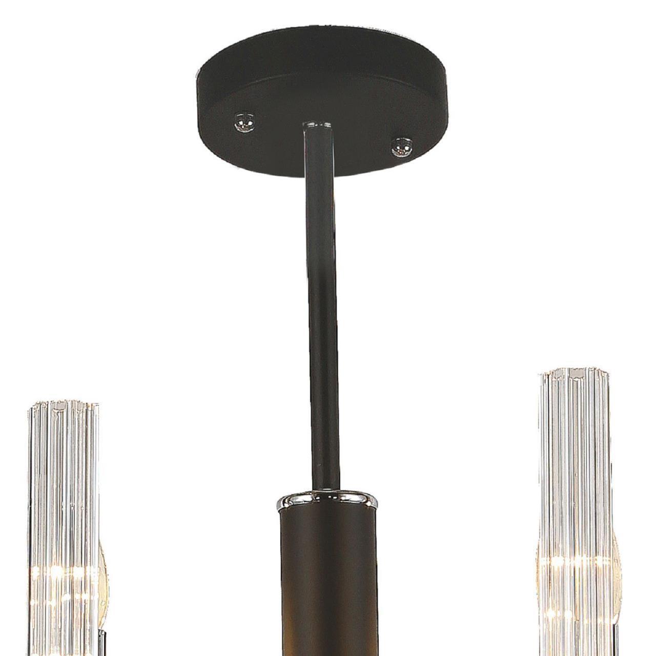 Металлический каркас черного цвета, хромированный декоративный элемент, рифленые плафоны из прозрачного стекла.