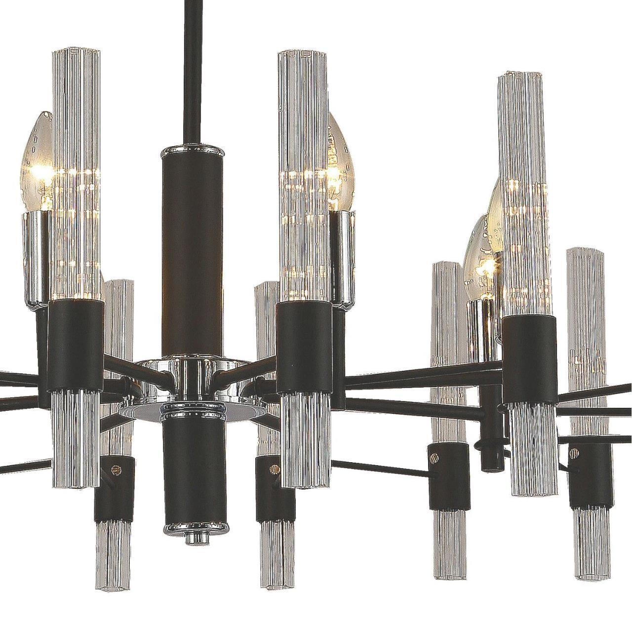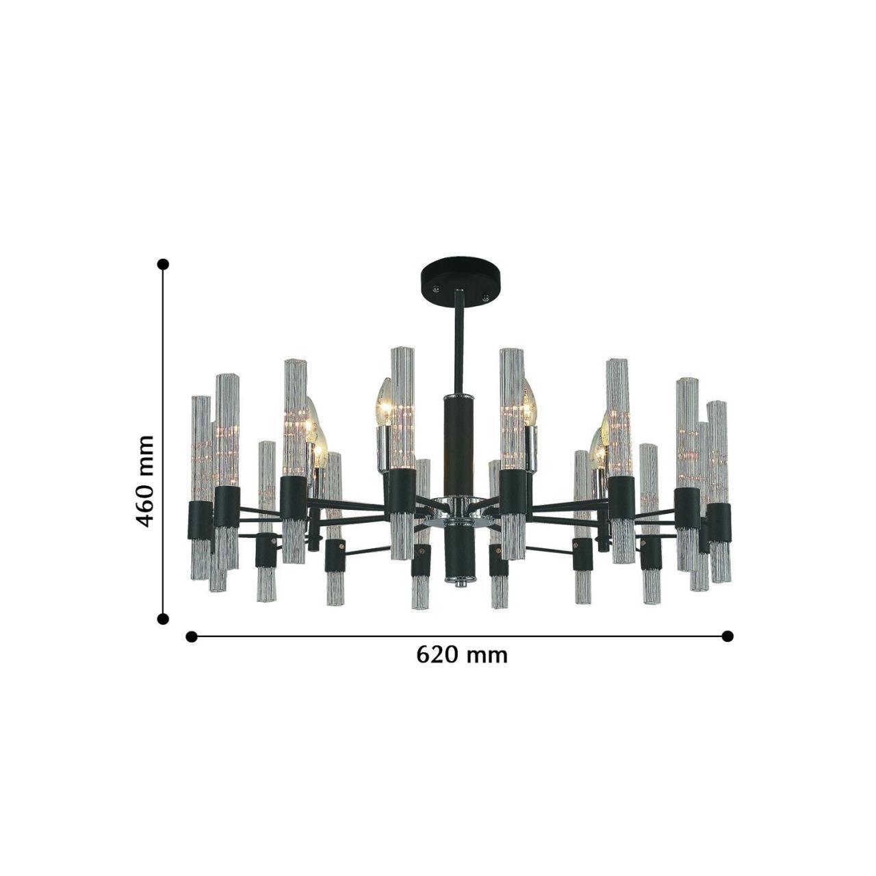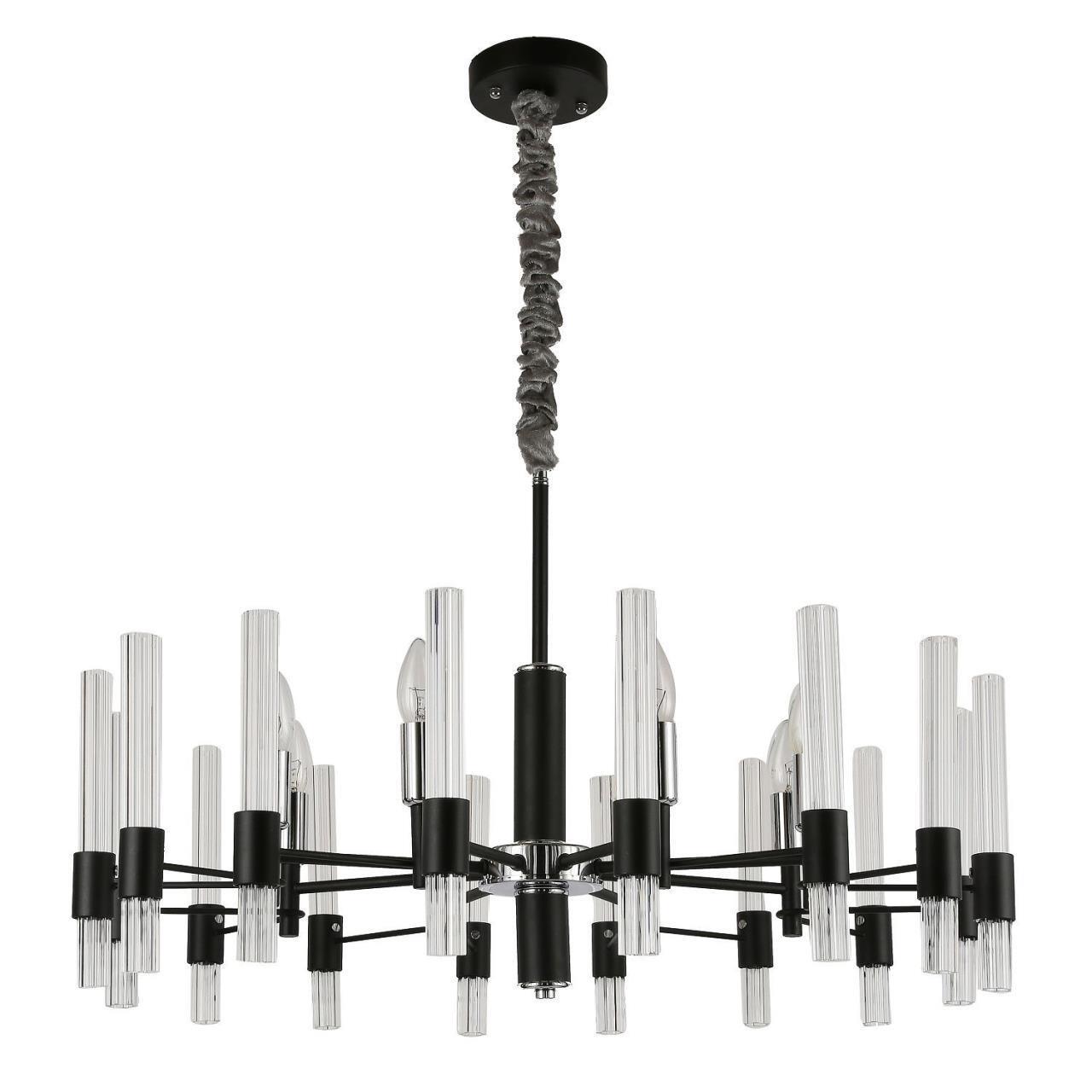 Металлический каркас черного цвета, хромированный декоративный элемент, рифленые плафоны из прозрачного стекла.
