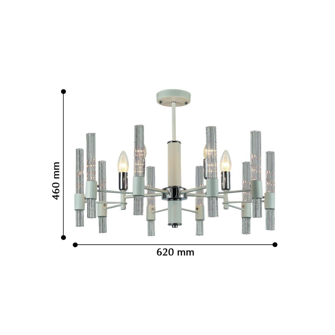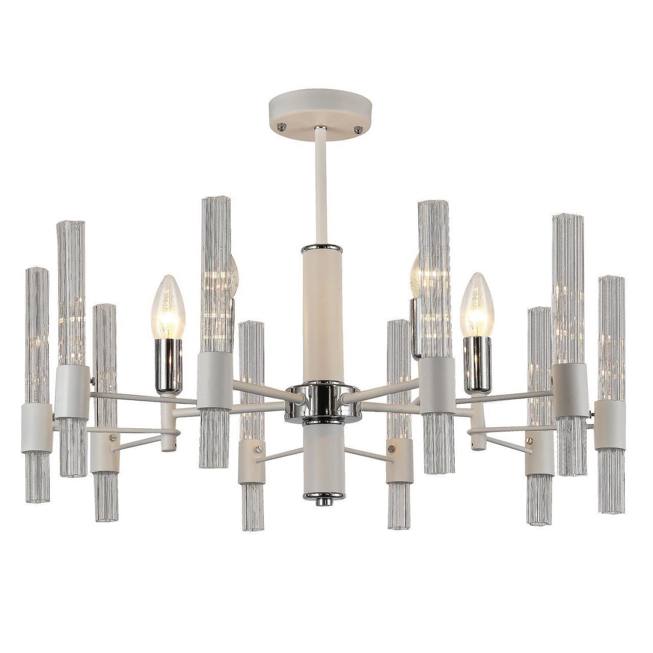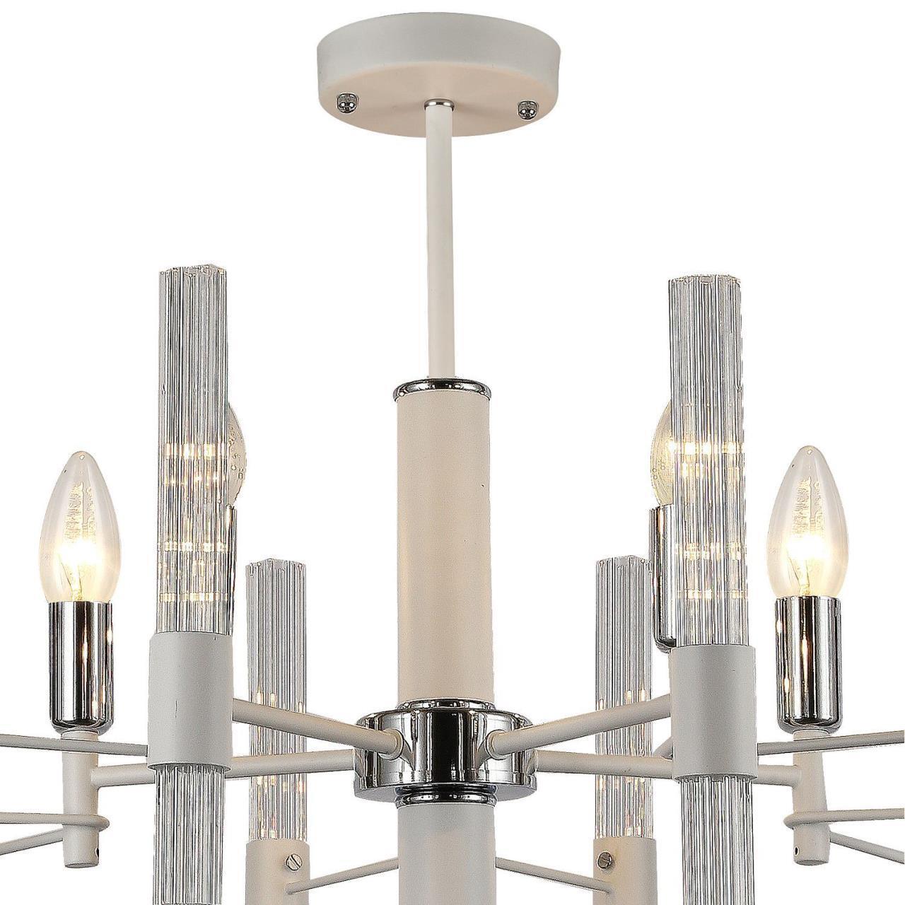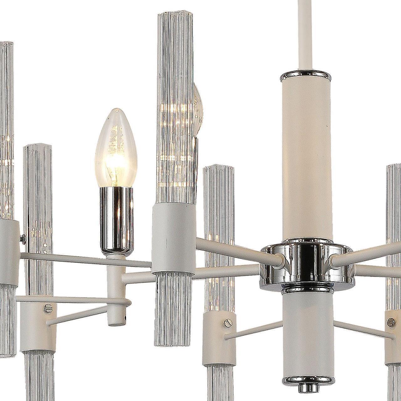Металлический каркас белого цвета, хромированный декоративный элемент, рифленые плафоны из прозрачного стекла.