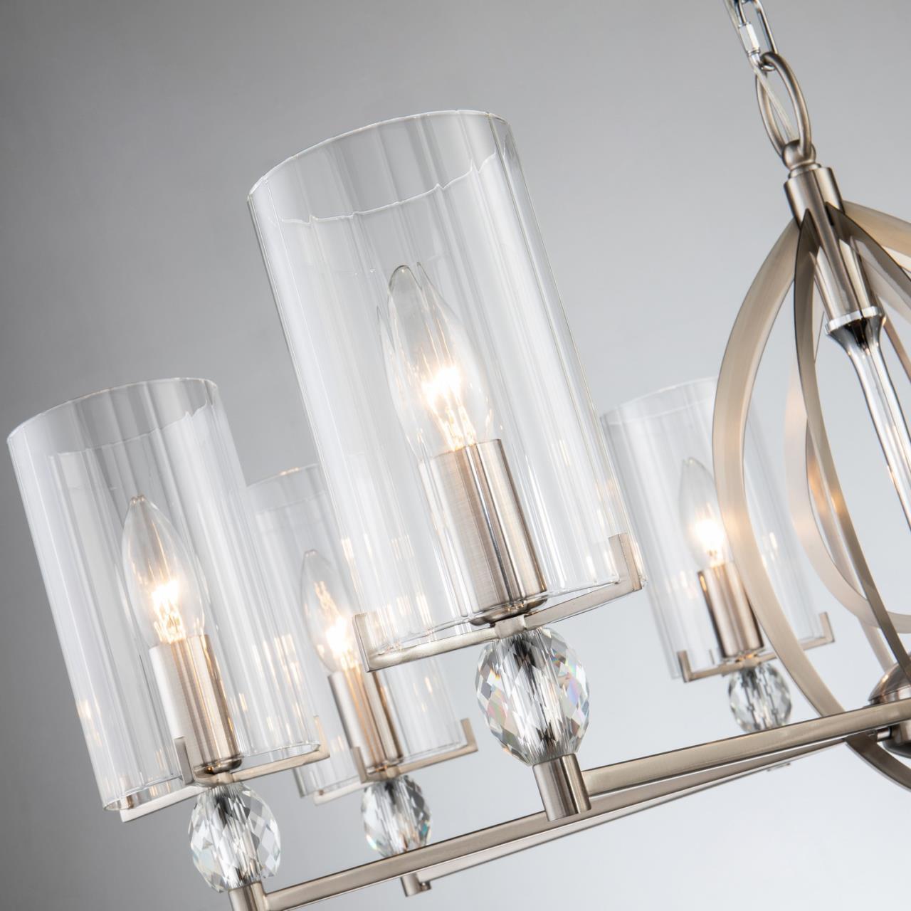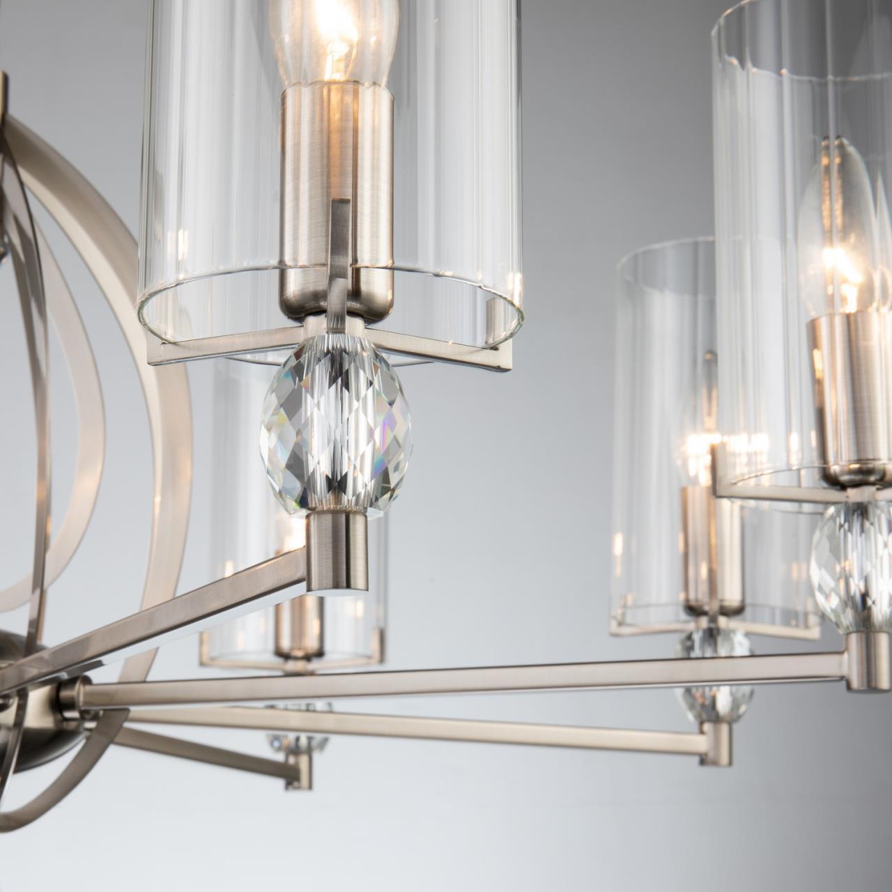 Каркас цвета никель, плафоны из прозрачного узорного стекла, декоративные элементы из прозрачного хрусталя.
