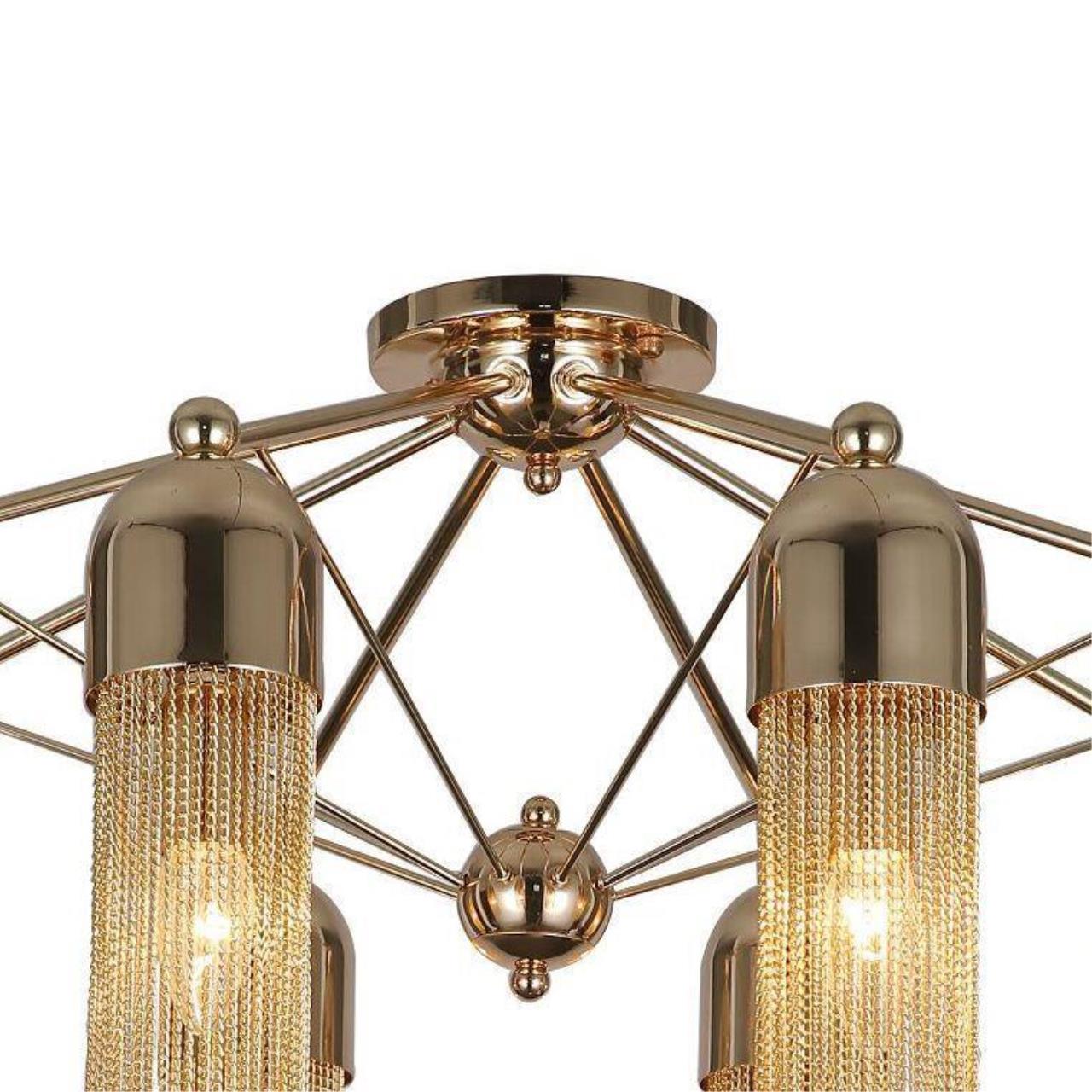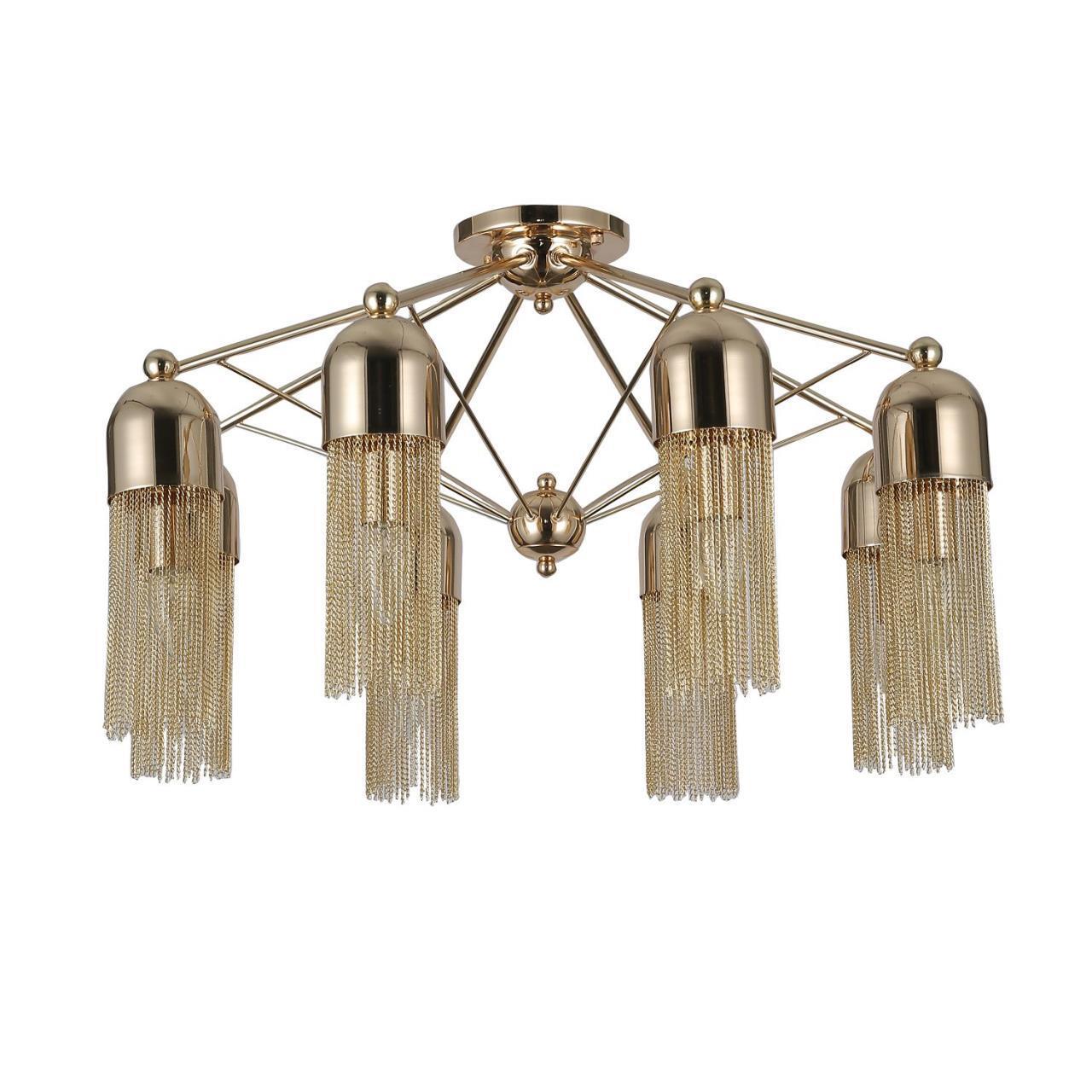 потолочная люстра золотого цвета, купол плафонов украшен каскадом тонких золотых цепочек, которые создает оригинальный световой эффект.