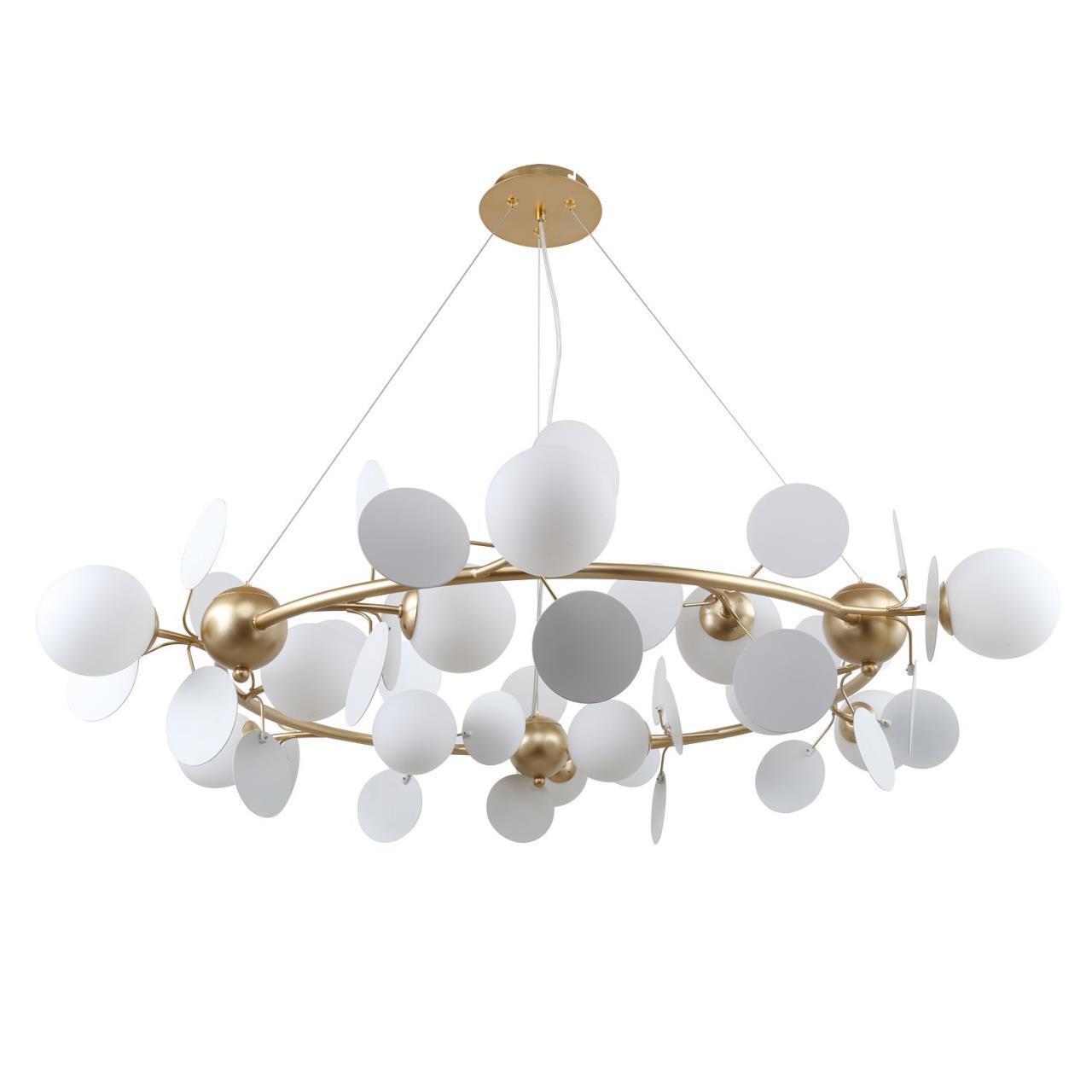 Металлический каркас золотого цвета, круглые стеклянные плафоны молочного цвета, декоративные круглые белые пластины, декоративные золотые шары, регулируемая высота.
