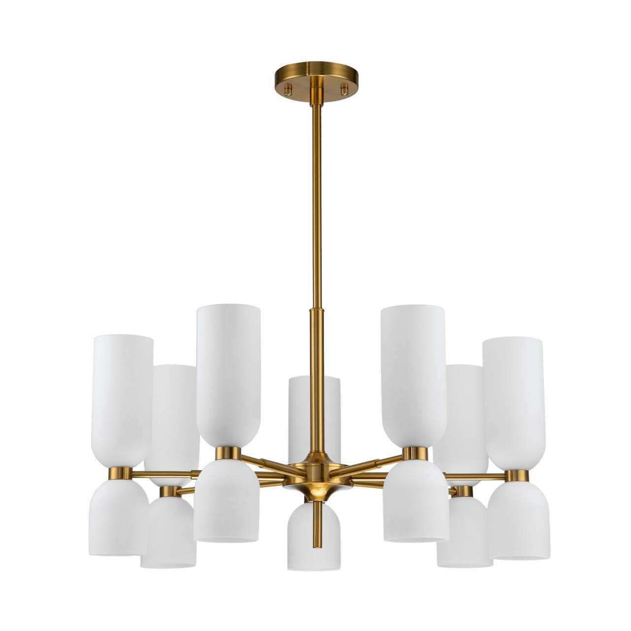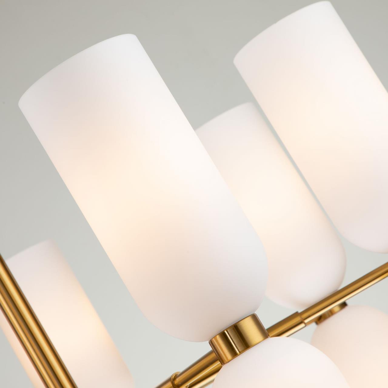Металлический каркас цвета латунь, плафоны из белого стекла.