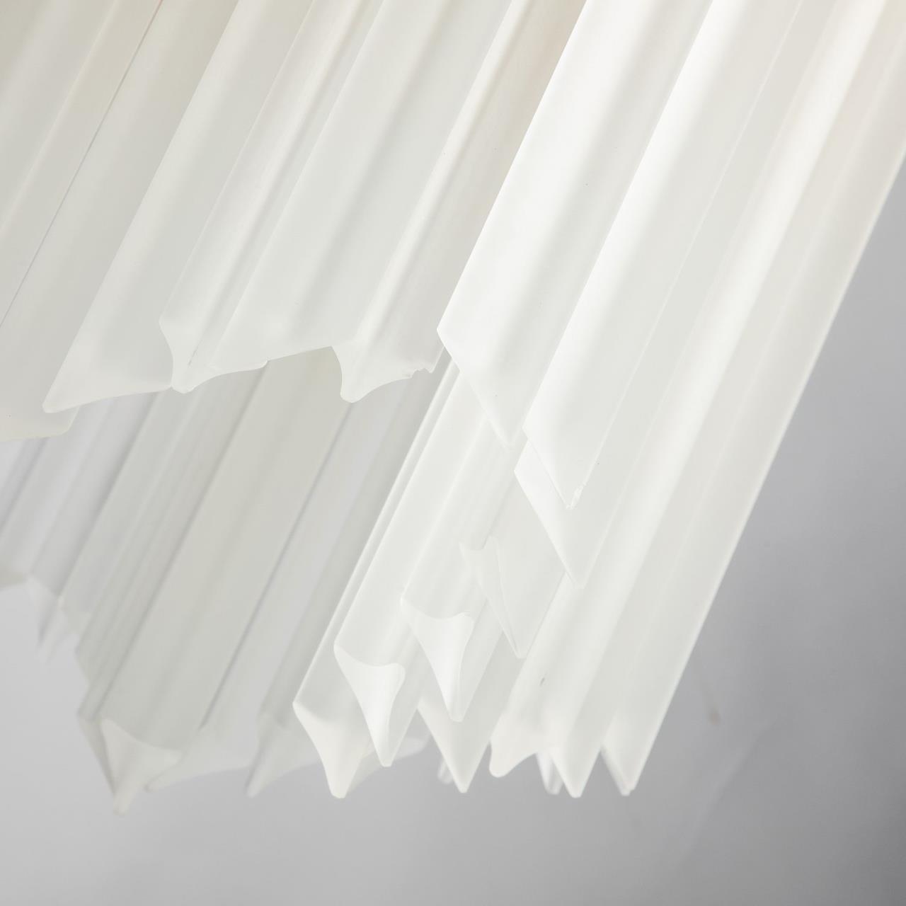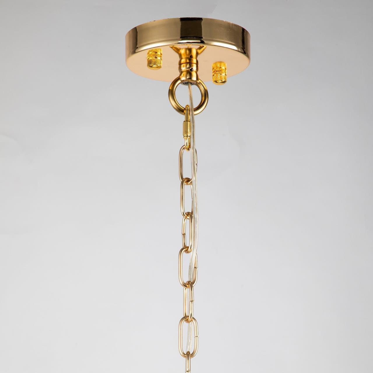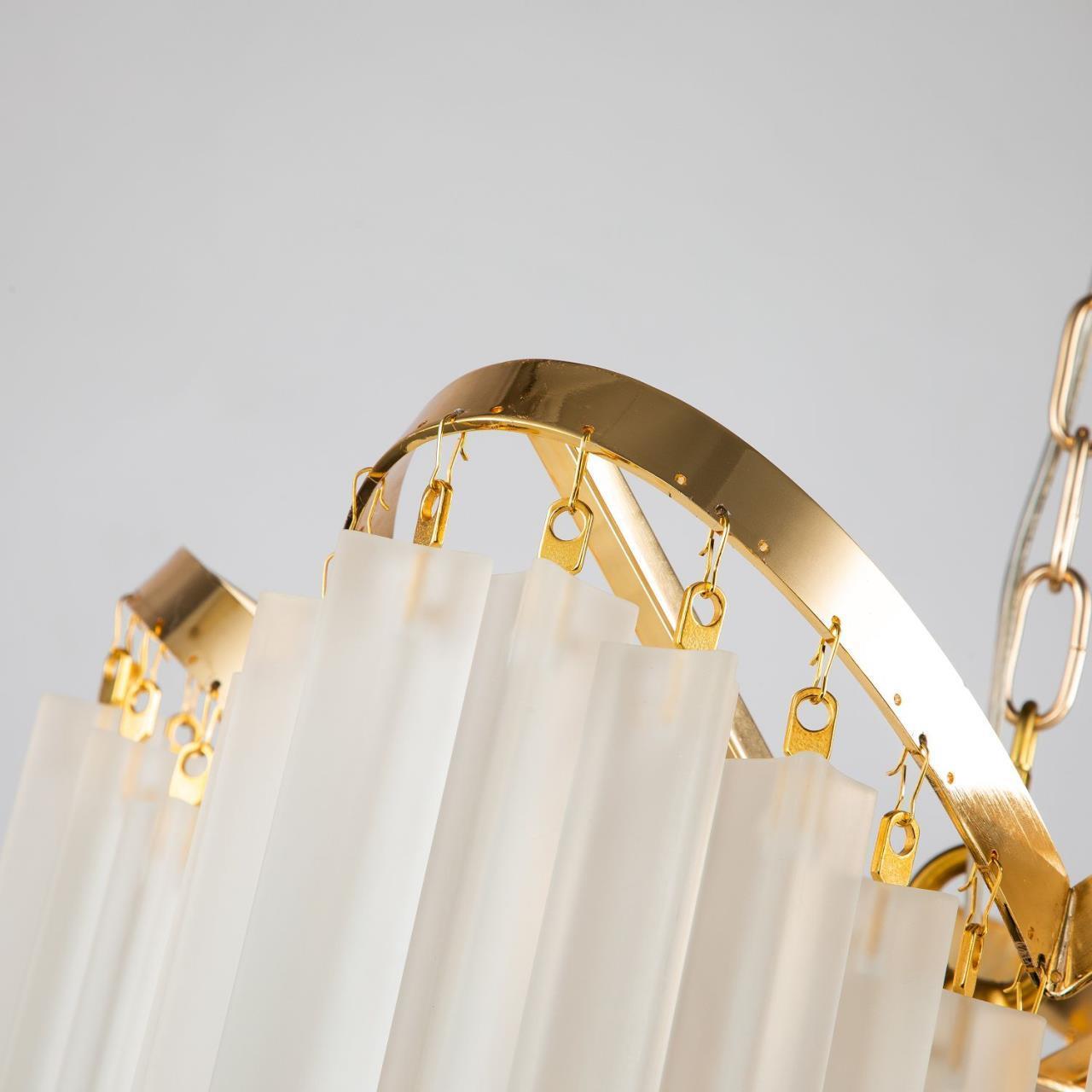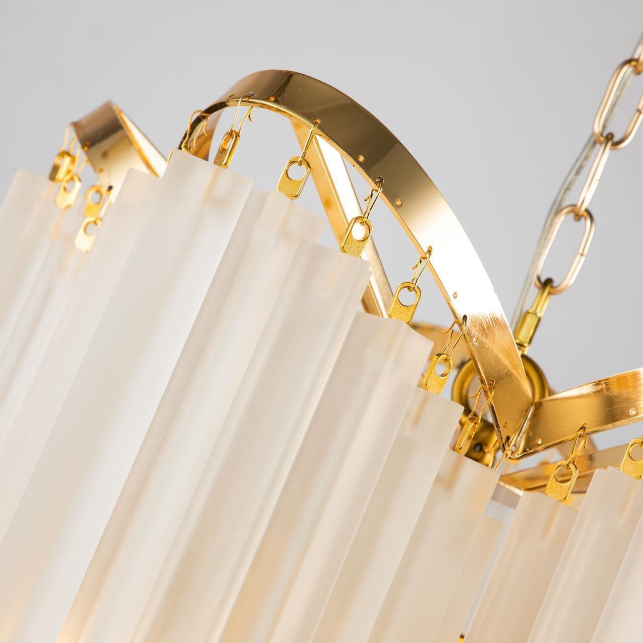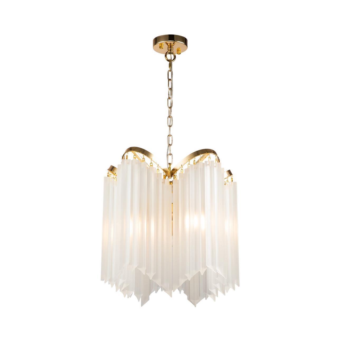 Каркас золотого цвета, подвески из стеклянных пластин белого матового цвета, регулируемая высота.
