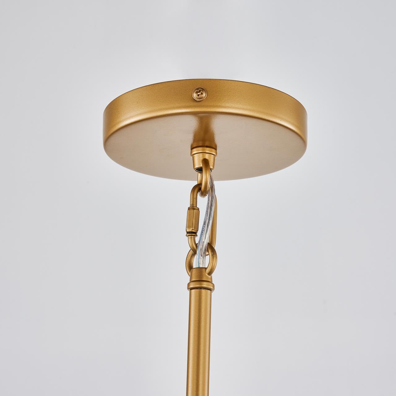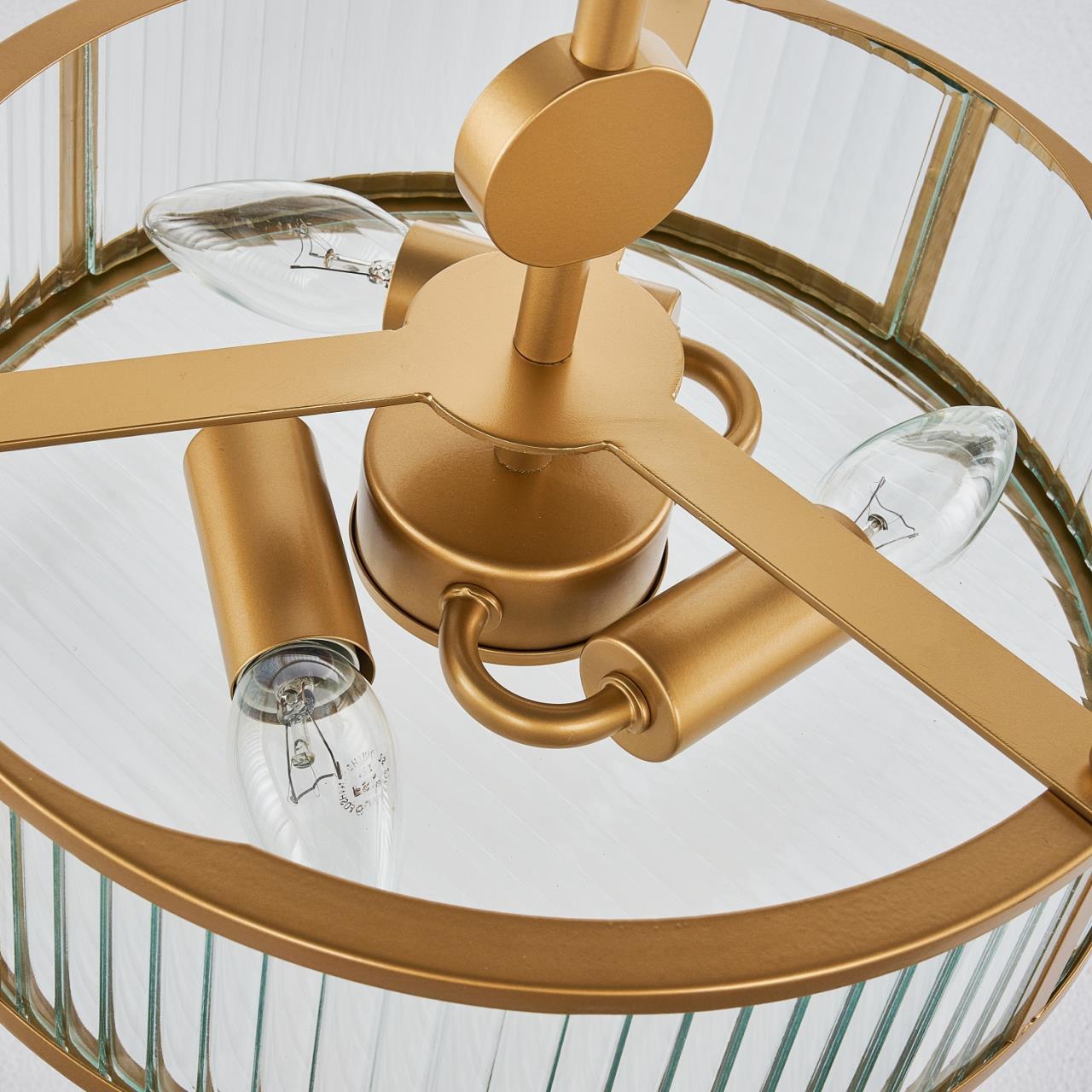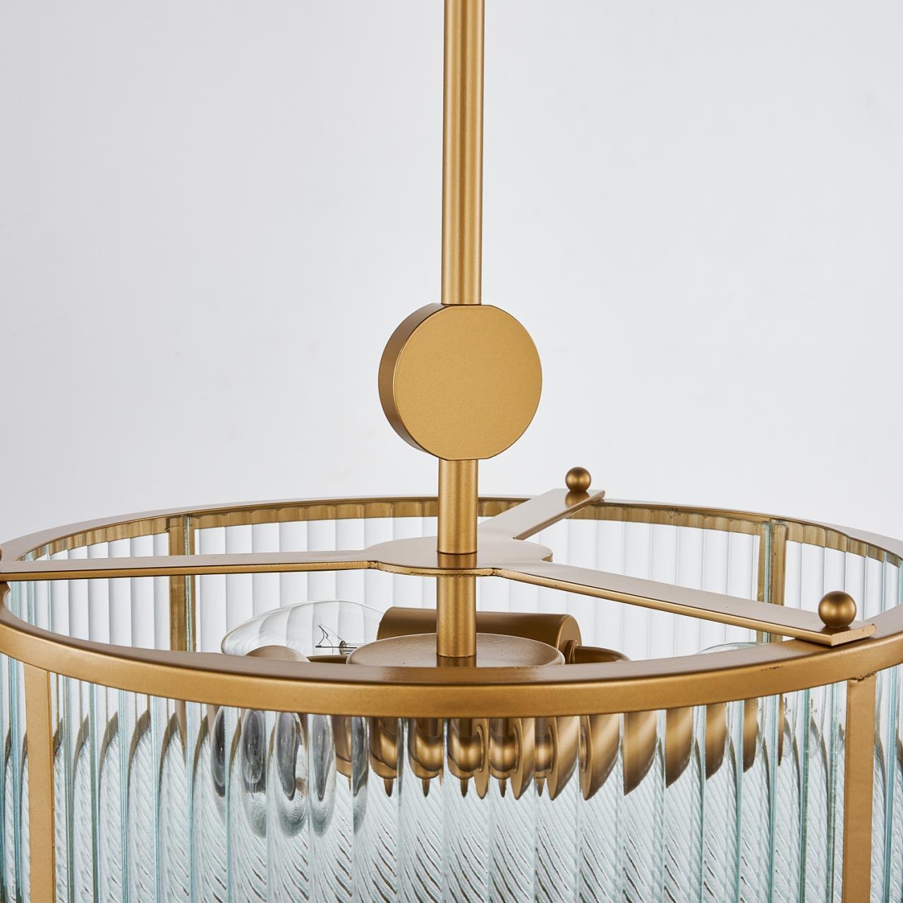 Каркас золотого цвета, плафон из прозрачного рельефного стекла, круглый декоративный элемент золотого цвета.
