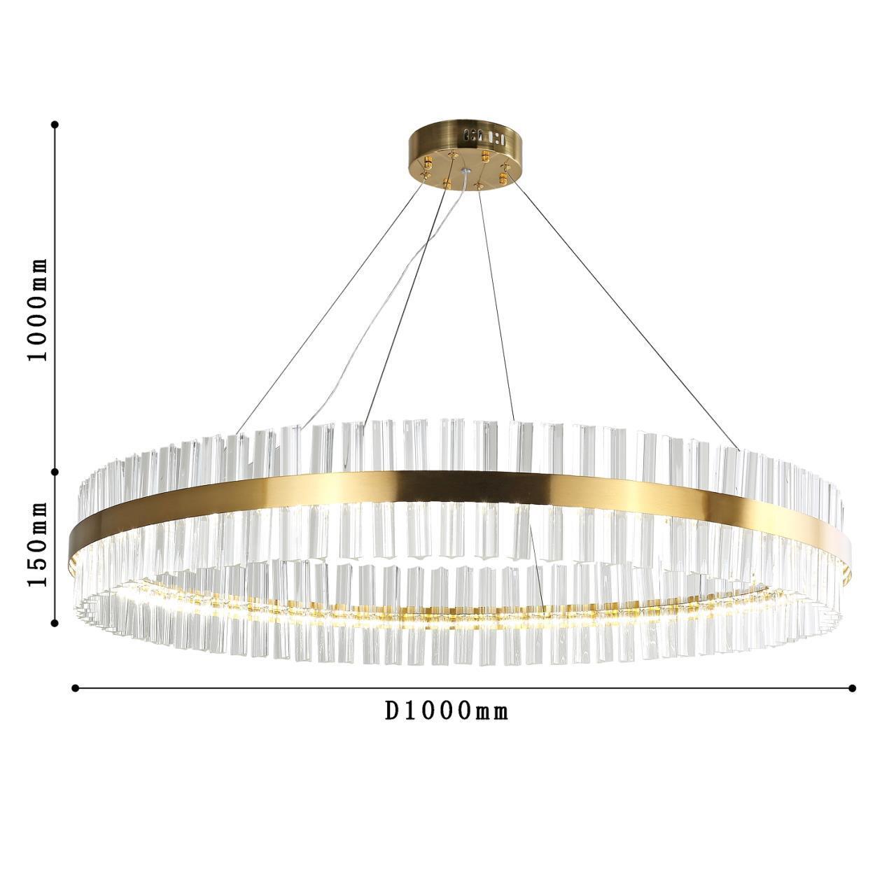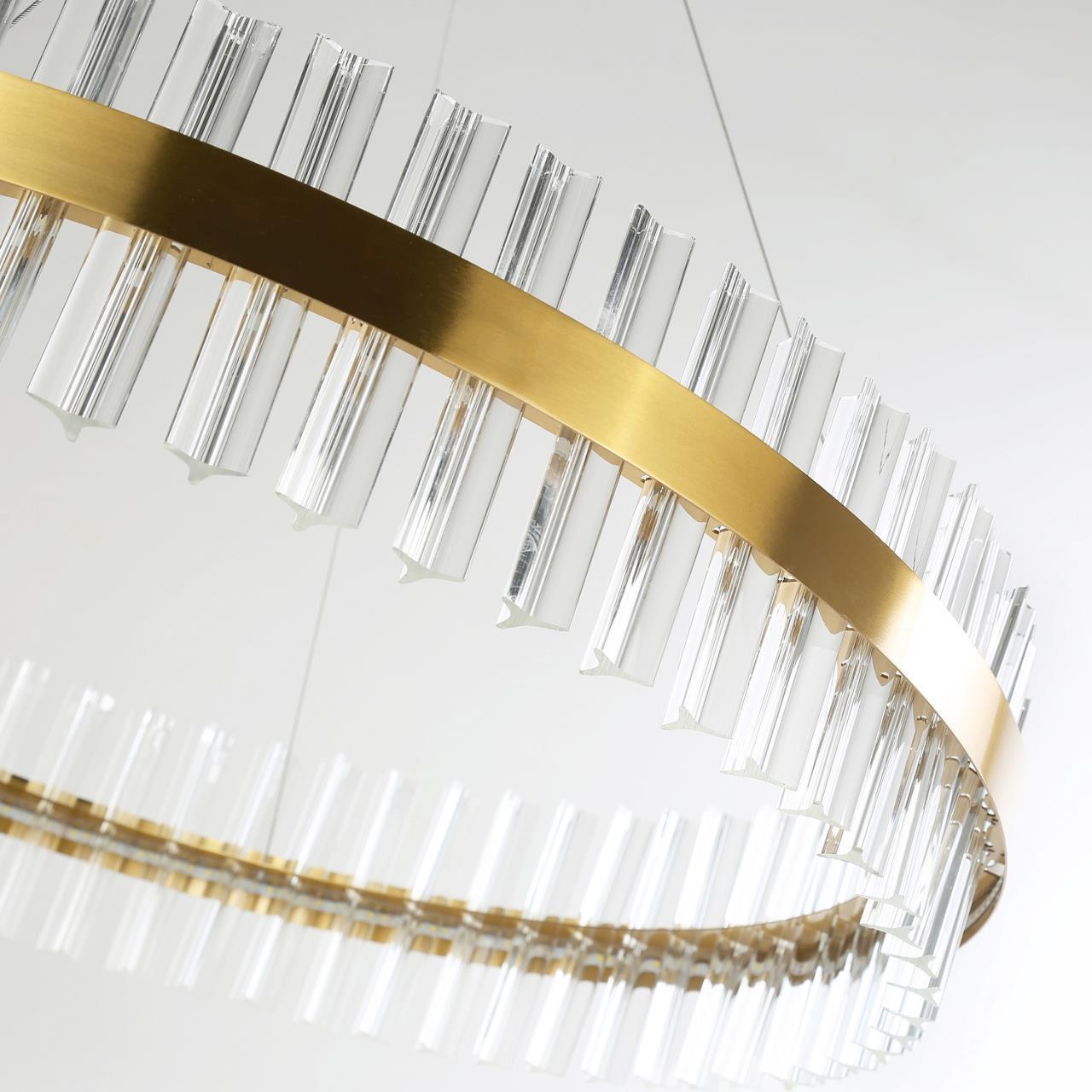 Каркас в виде металлических обручей в цвете гальваническое золото, декор из хрусталя, оснащена двумя встроенными led модулями.