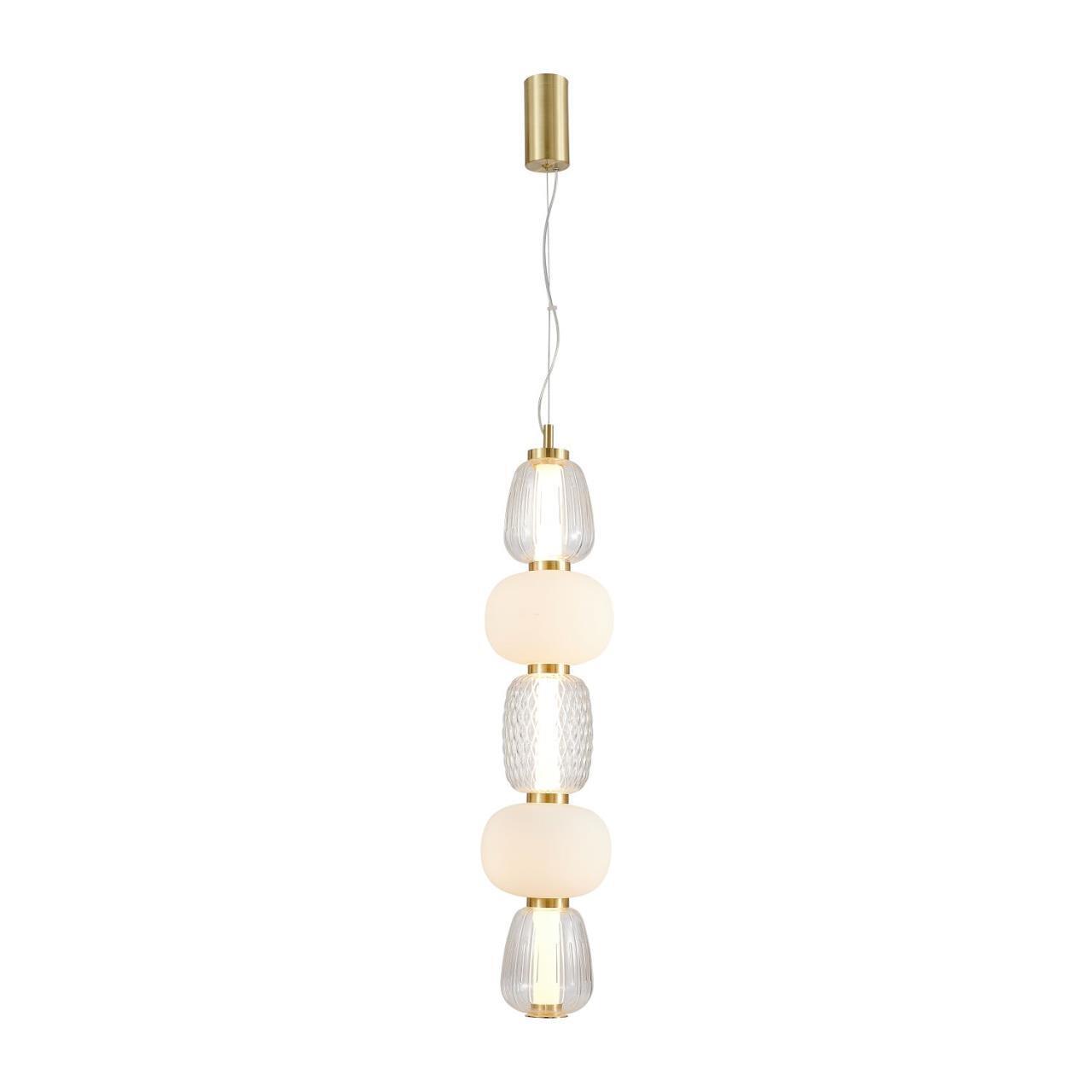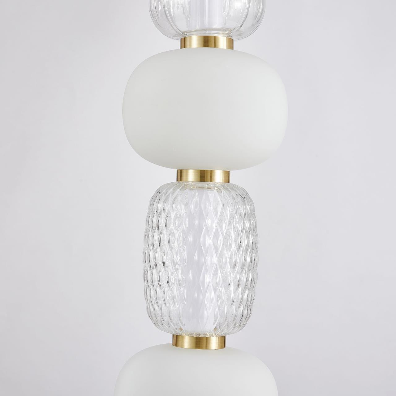 Металлический каркас цвета золота, плафоны в виде бусин разнообразных форм из выдувного стекла двух видов прозрачного и цвета опала.