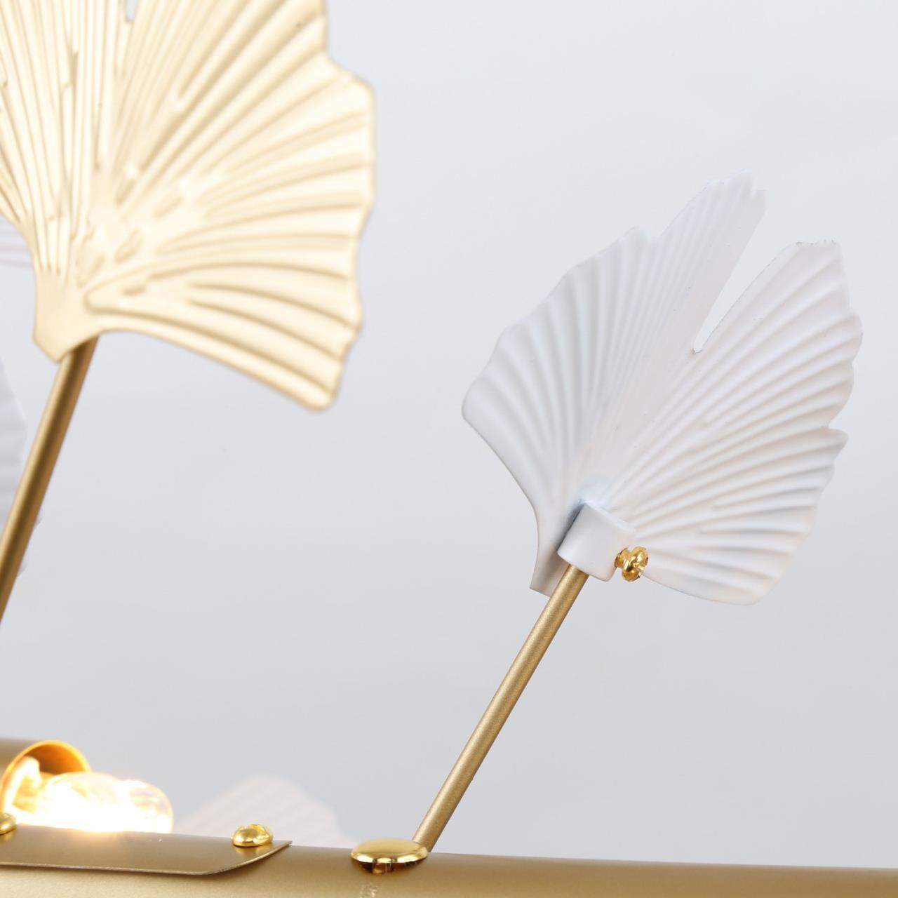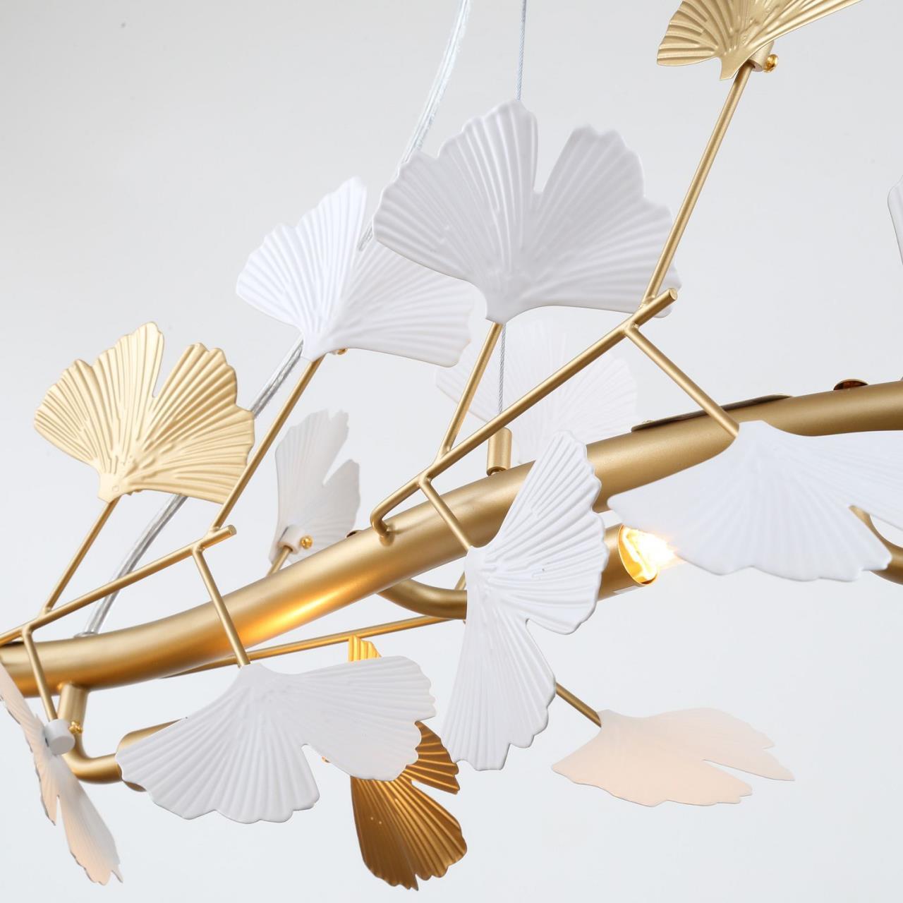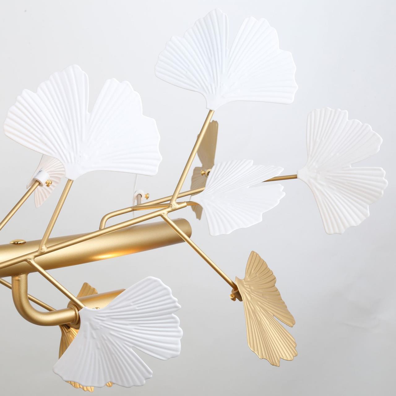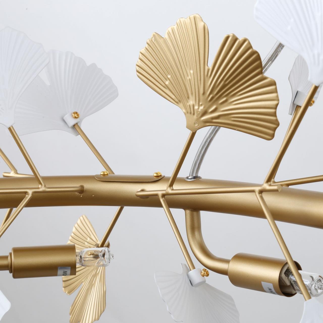 Металлический каркас цвета окрашенное золото, декор в виде листьев Гинкоа в белом и золотом цвете, сменные лампы.