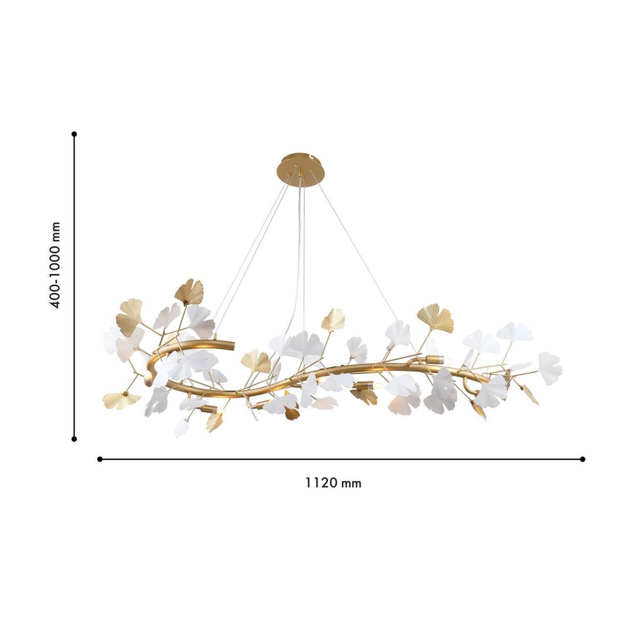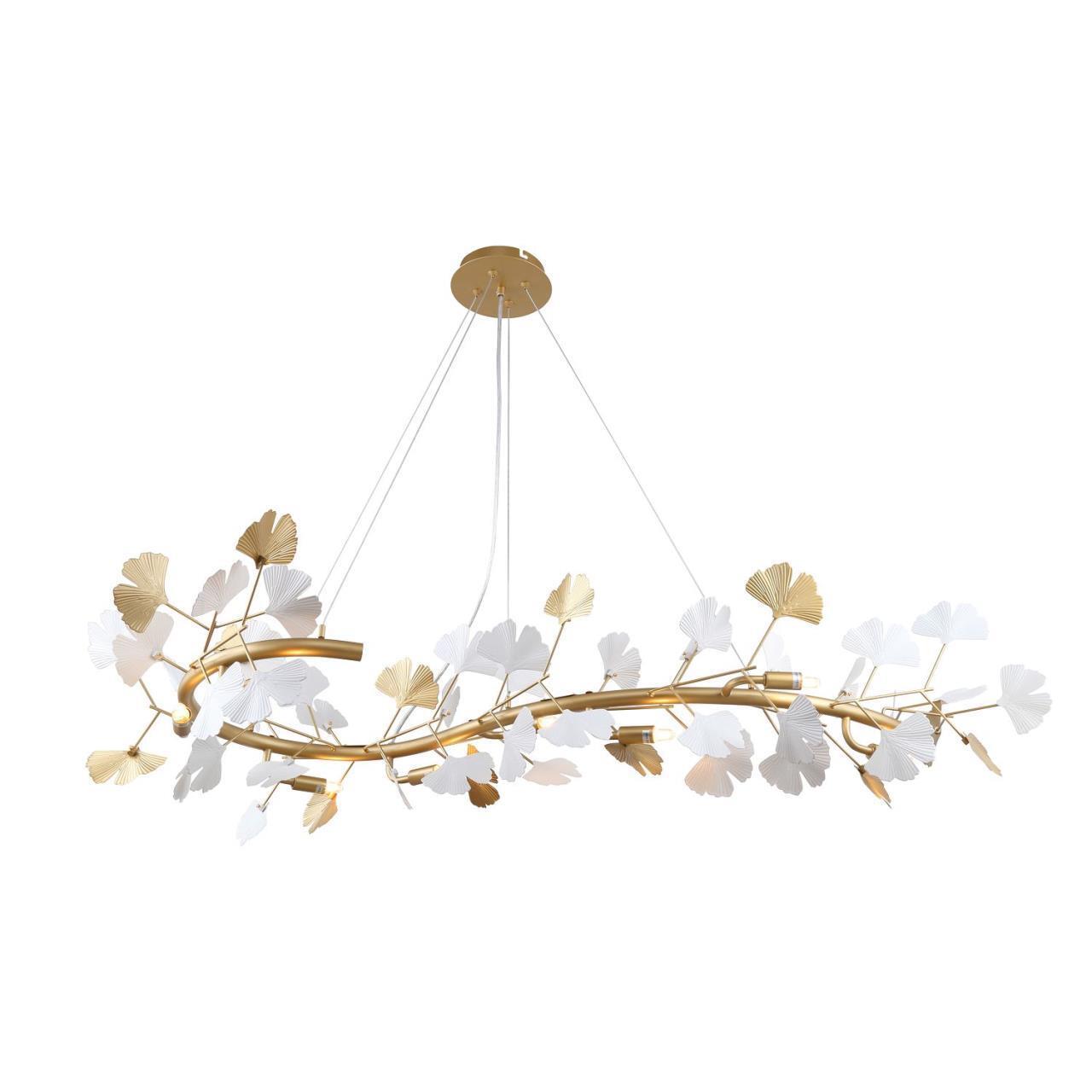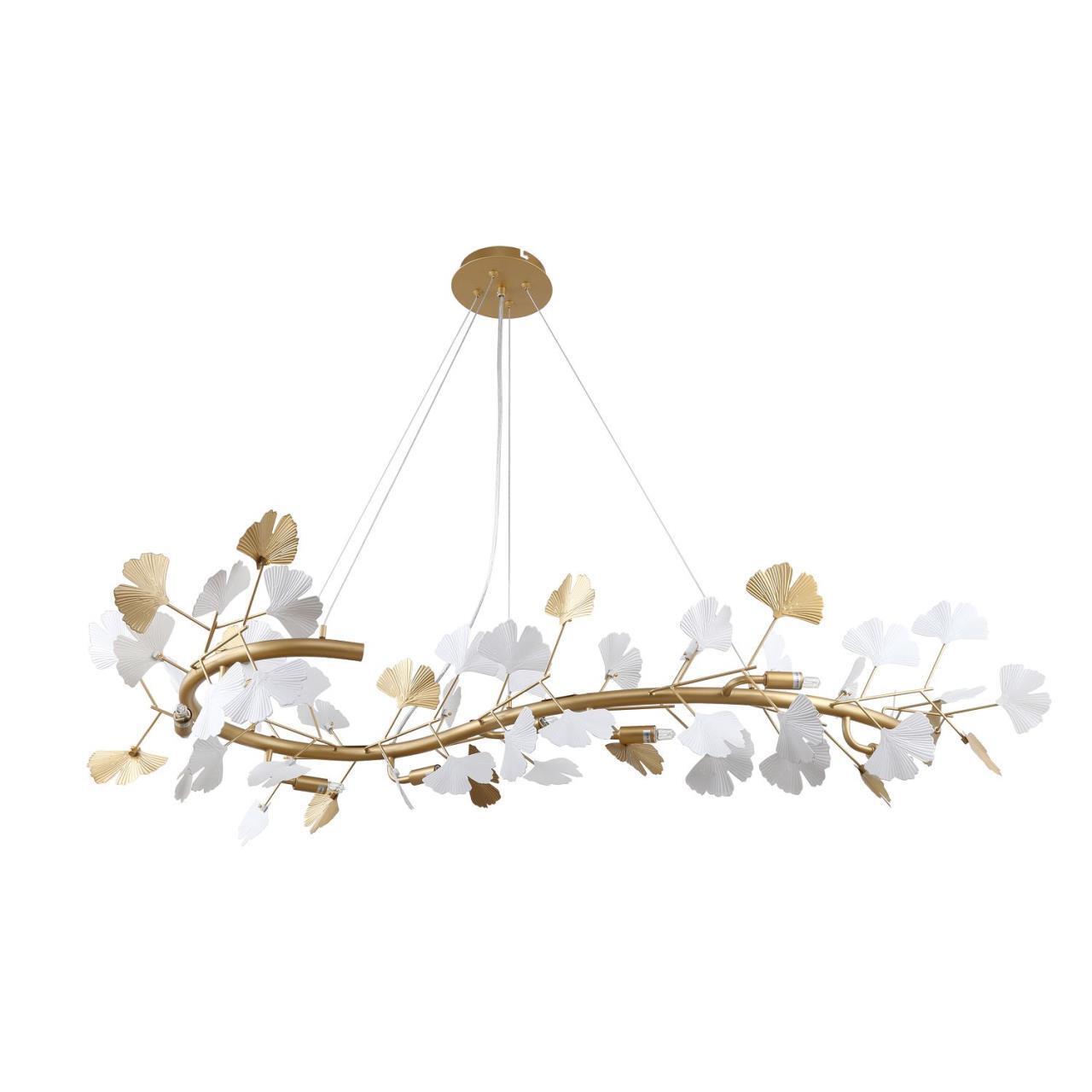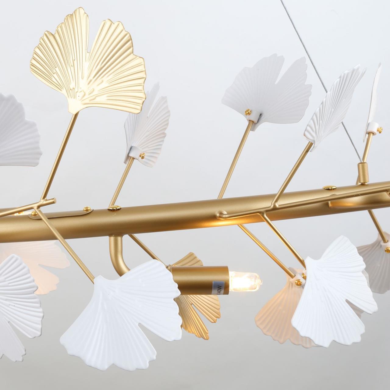 Металлический каркас цвета окрашенное золото, декор в виде листьев Гинкоа в белом и золотом цвете, сменные лампы.