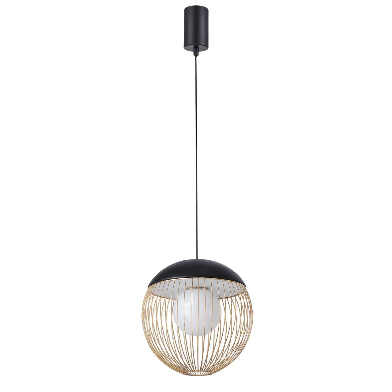 Подвес диаметром 30 см, стеклянный выдувной плафон заключен в проволочный каркас из тонких, спаянных между собой металлических трубочек, каркас в черном цвете с золотым, модуль LED, регулируемая высота.