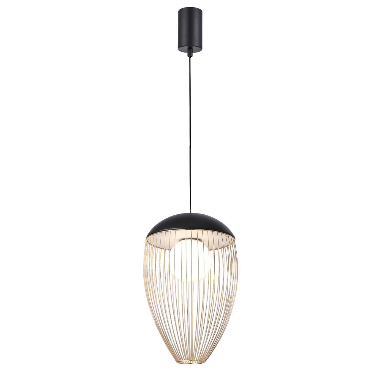 Стеклянный выдувной плафон заключен в проволочный каркас из тонких, спаянных между собой металлических трубочек, каркас в черном цвете с золотым, модуль LED, регулируемая высота.