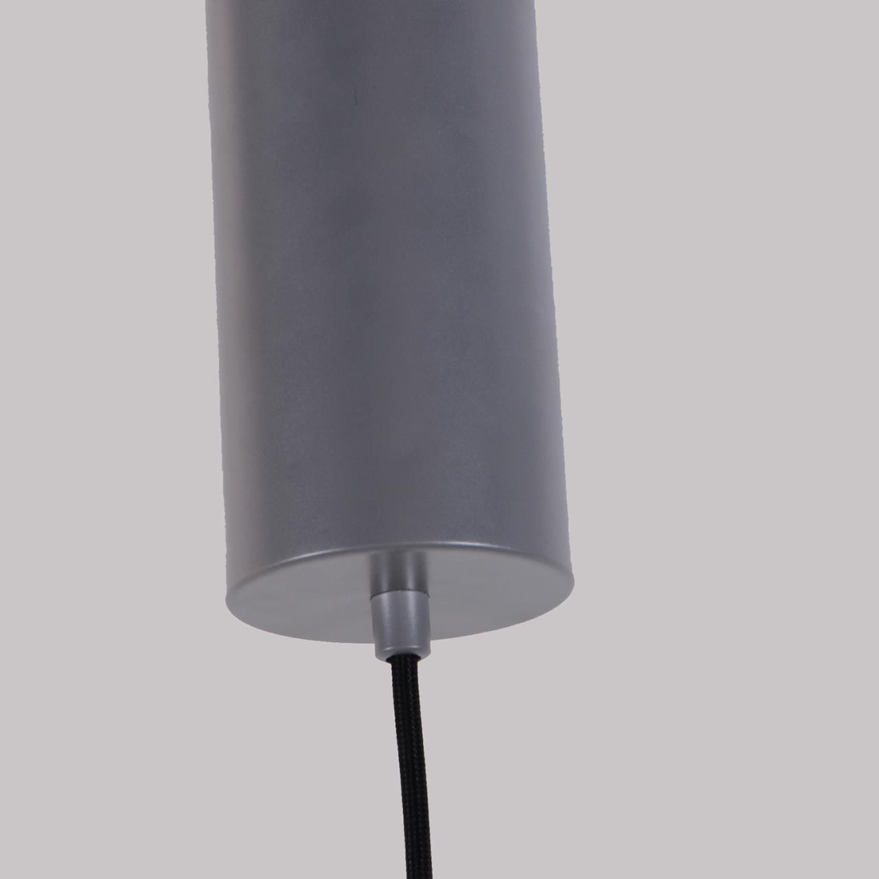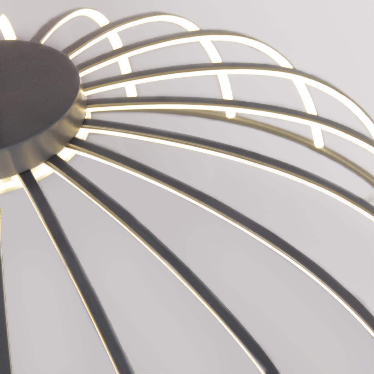 Металлический каркас в темносером цвете. Источником света являются расходящиеся из центра лучи, выполненные из тонких металлических трубок в лентой LED, регулируемая высота.