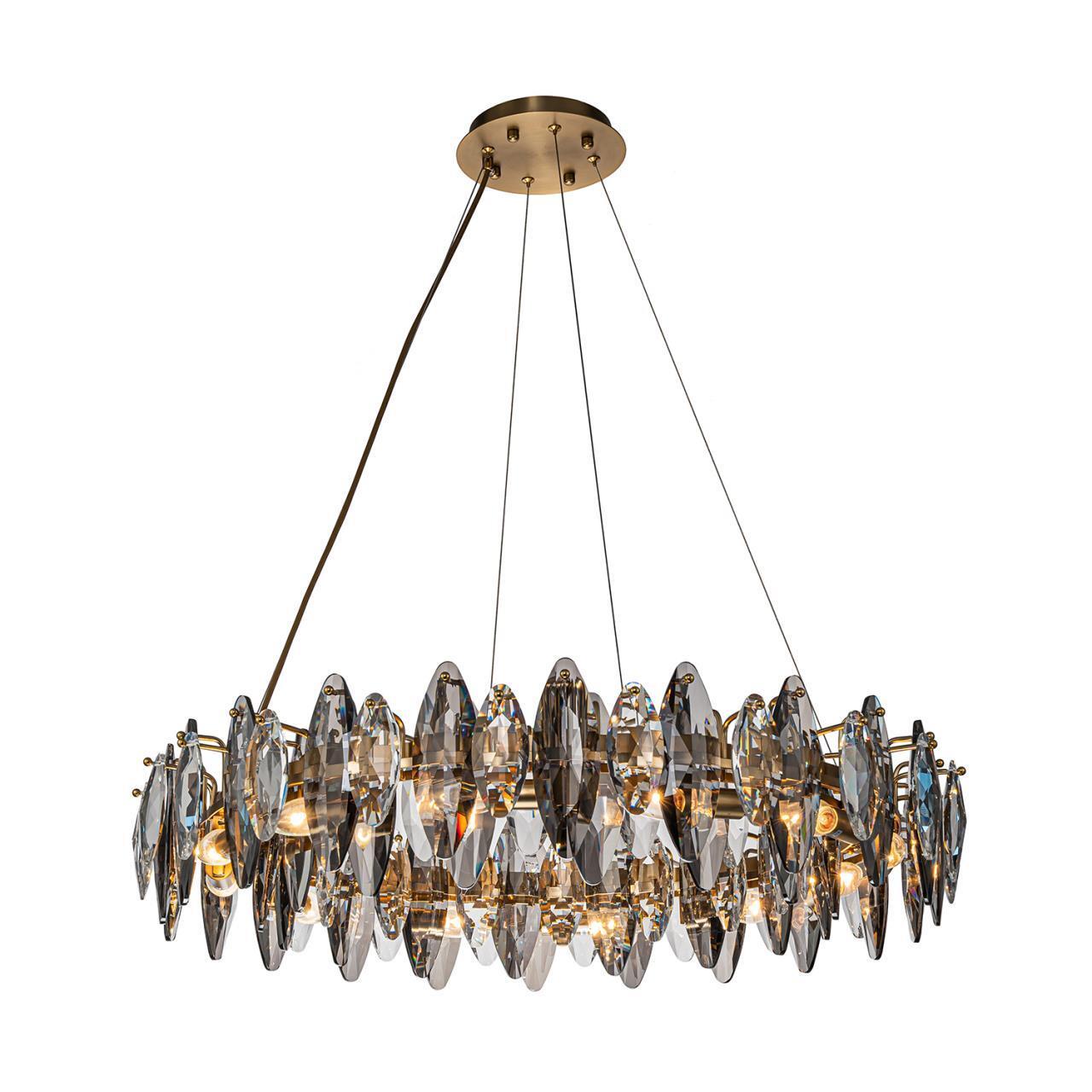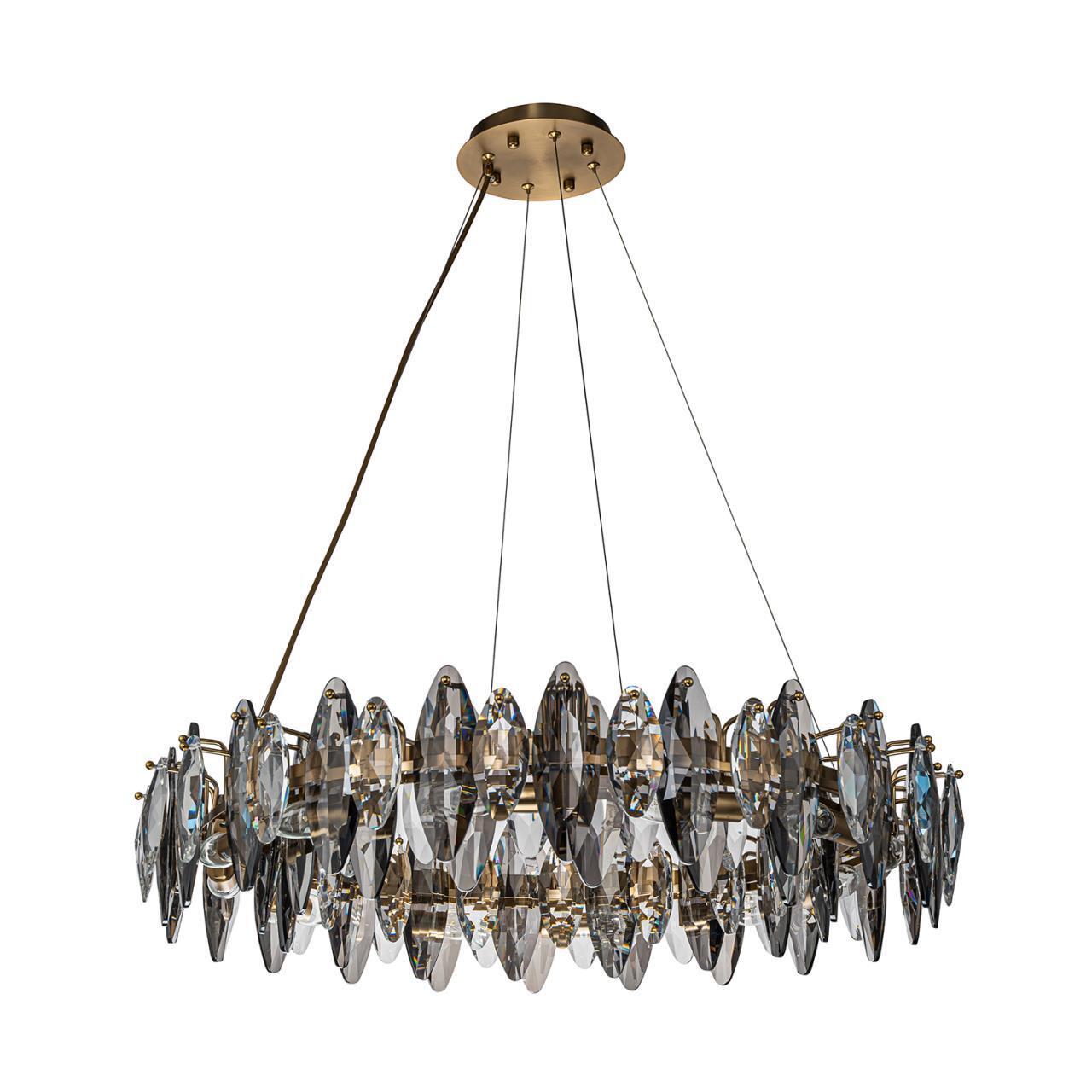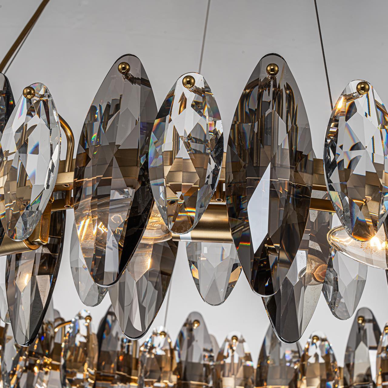 Подвесная кольцевая люстра диаметром 80 см, каркас в бронзовом цвете, лепестки прозрачного и дымчатосерого хрусталя разного размера, регулируемая высота.