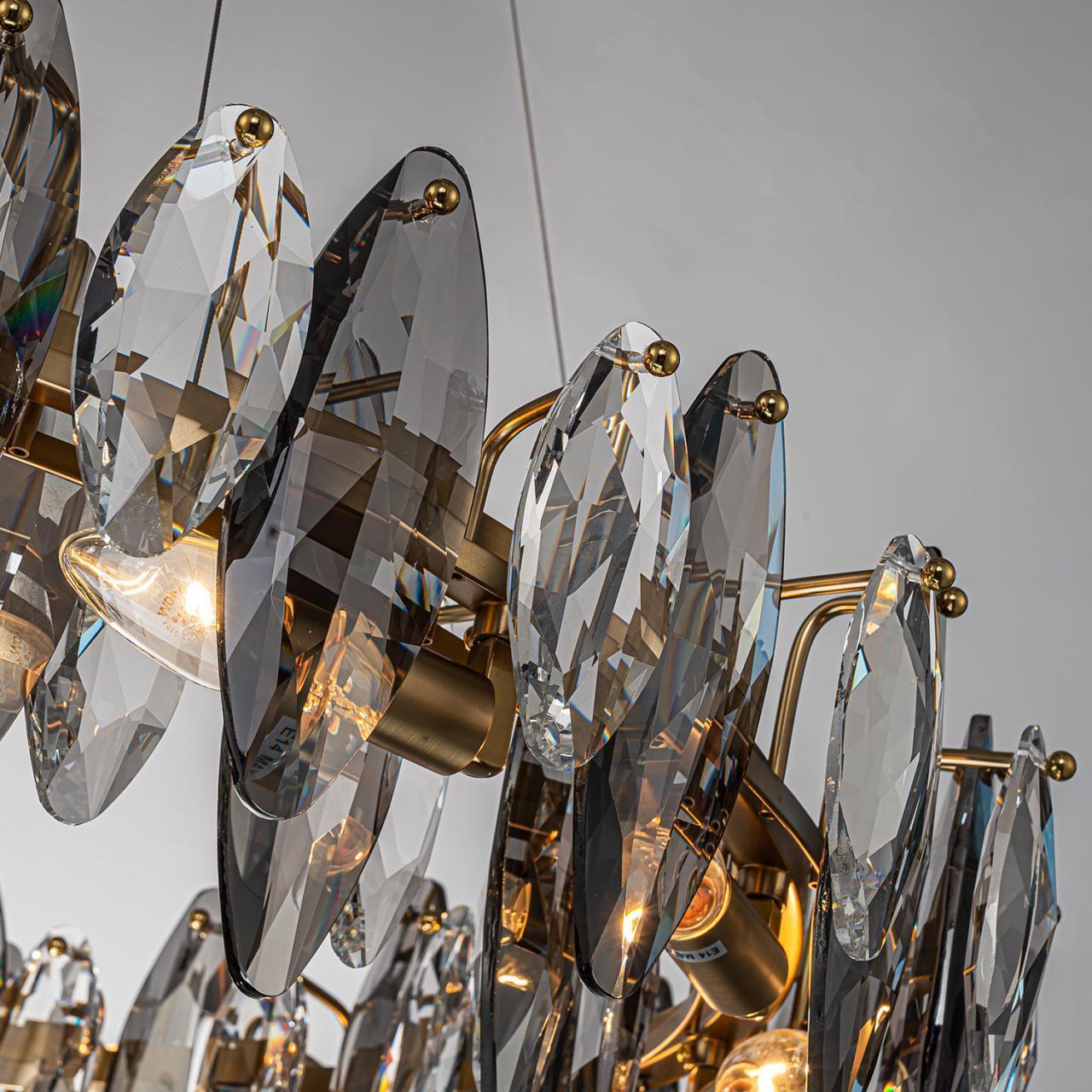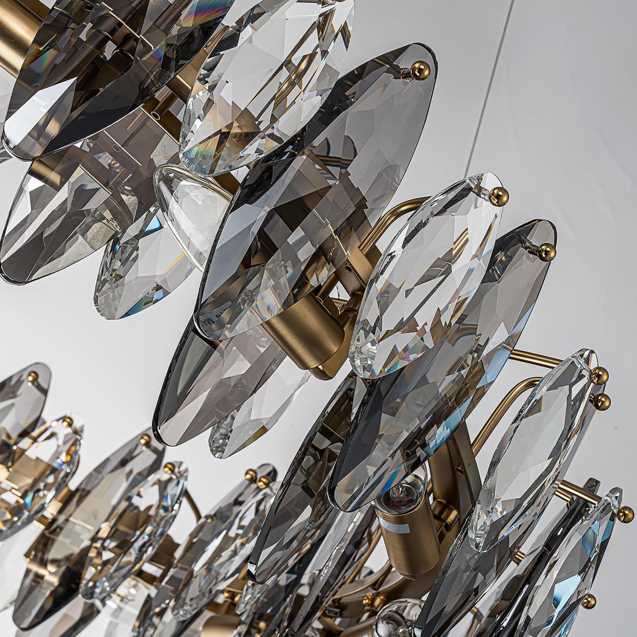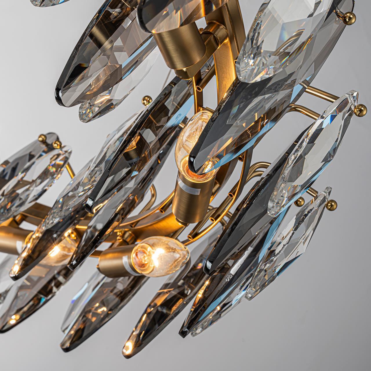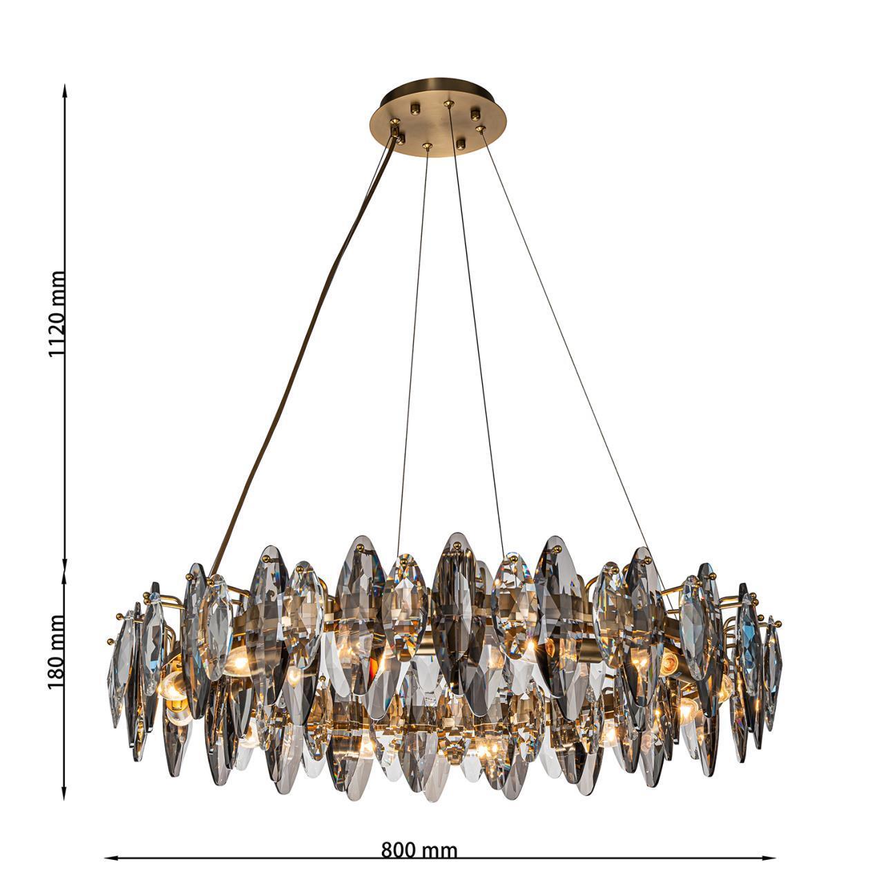 Подвесная кольцевая люстра диаметром 80 см, каркас в бронзовом цвете, лепестки прозрачного и дымчатосерого хрусталя разного размера, регулируемая высота.