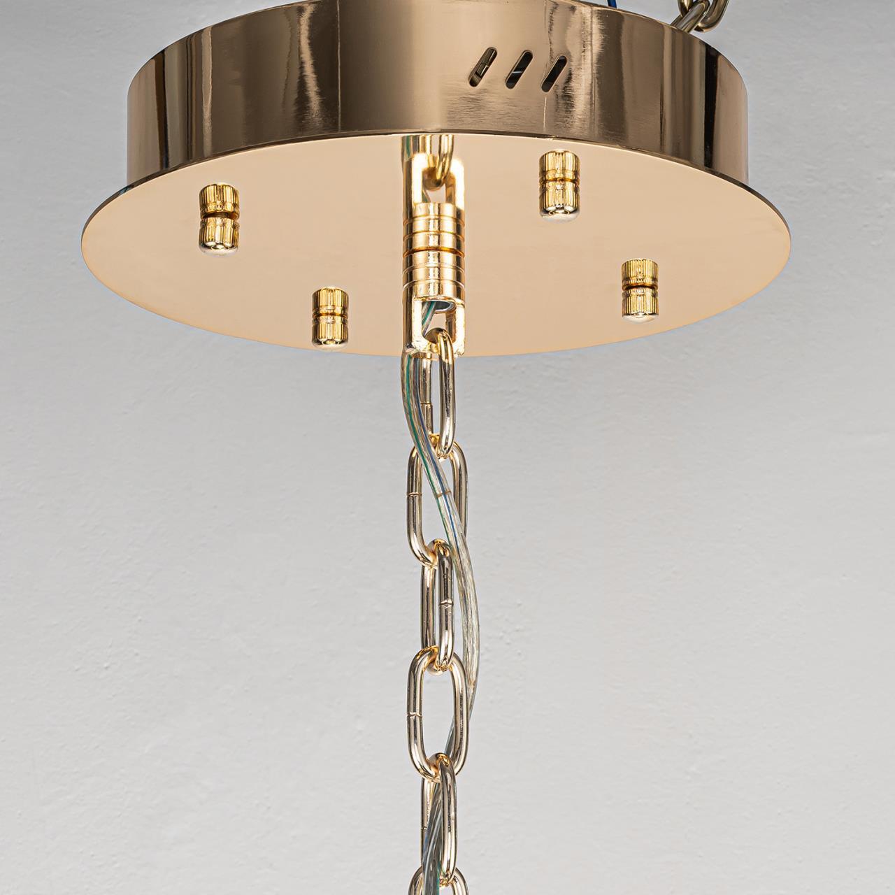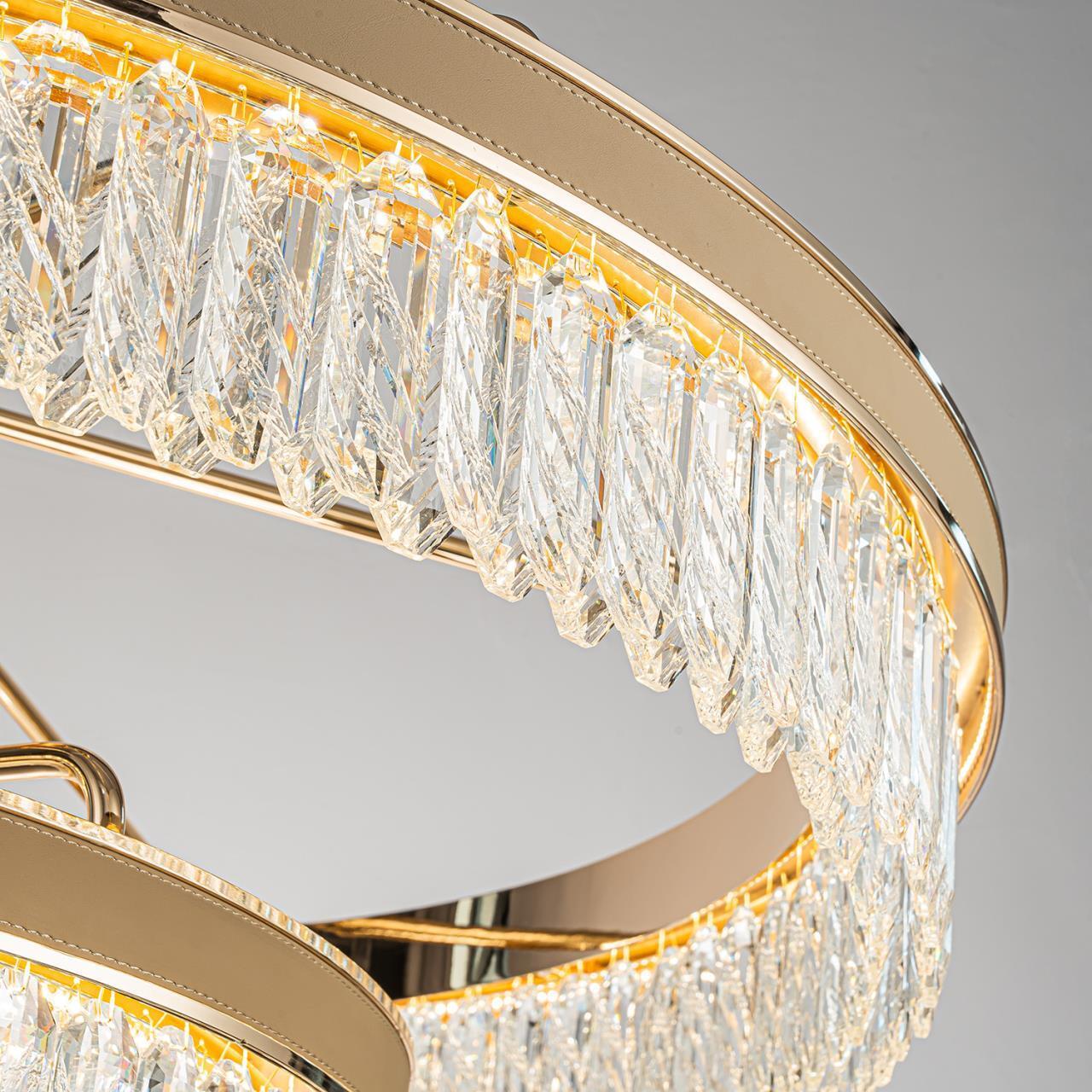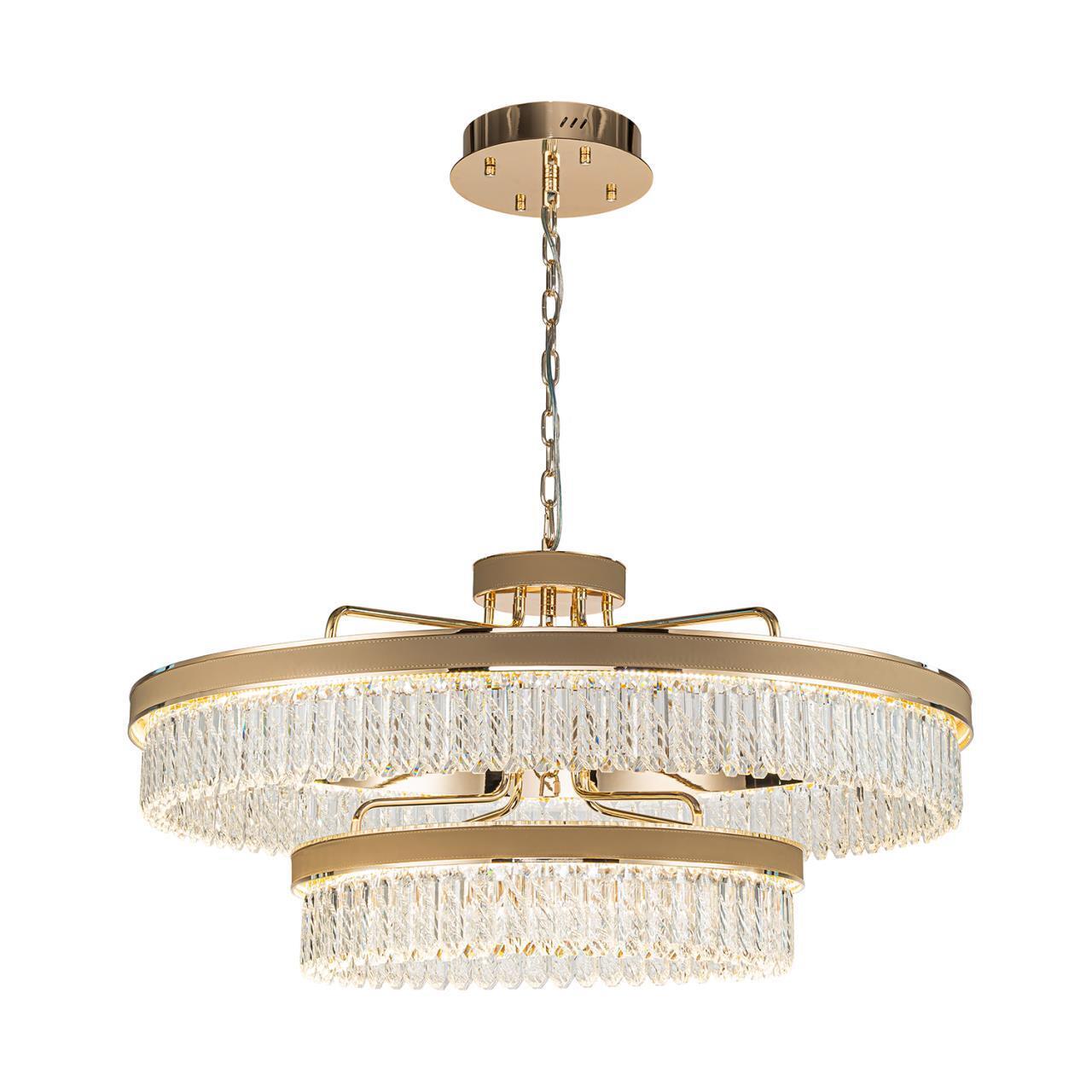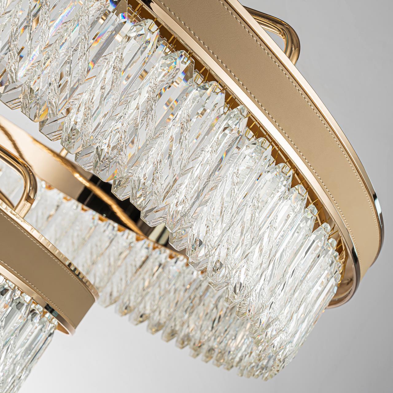 Металлический каркас, каркас золотого цвета, декоративные вставки из экокожи бежевого цвета, хрустальные подвески вытянутой формы с диагональным узором, регулируемая высота.