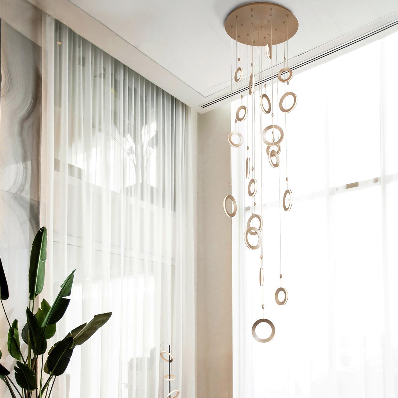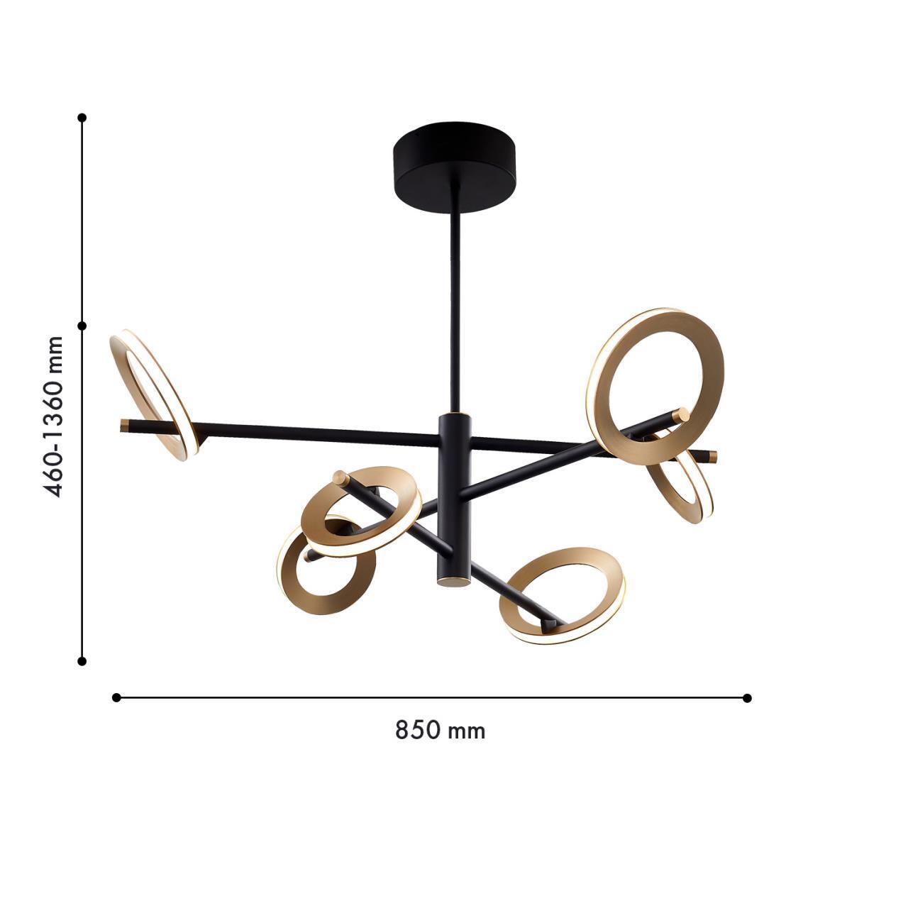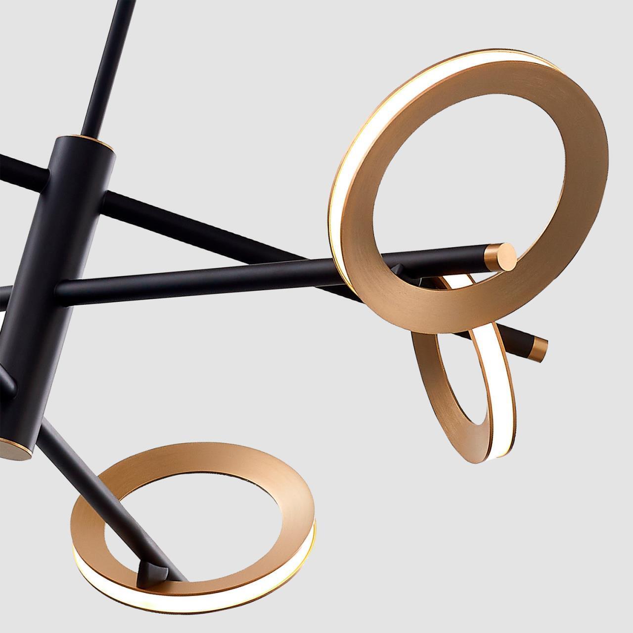 Металлический каркас черного цвета, объемные кольца цвета матовое золото, закреплены под разным углом к каркасу светильника, светятся по периметру благодаря встроенной ленте LED, регулируемая высота.