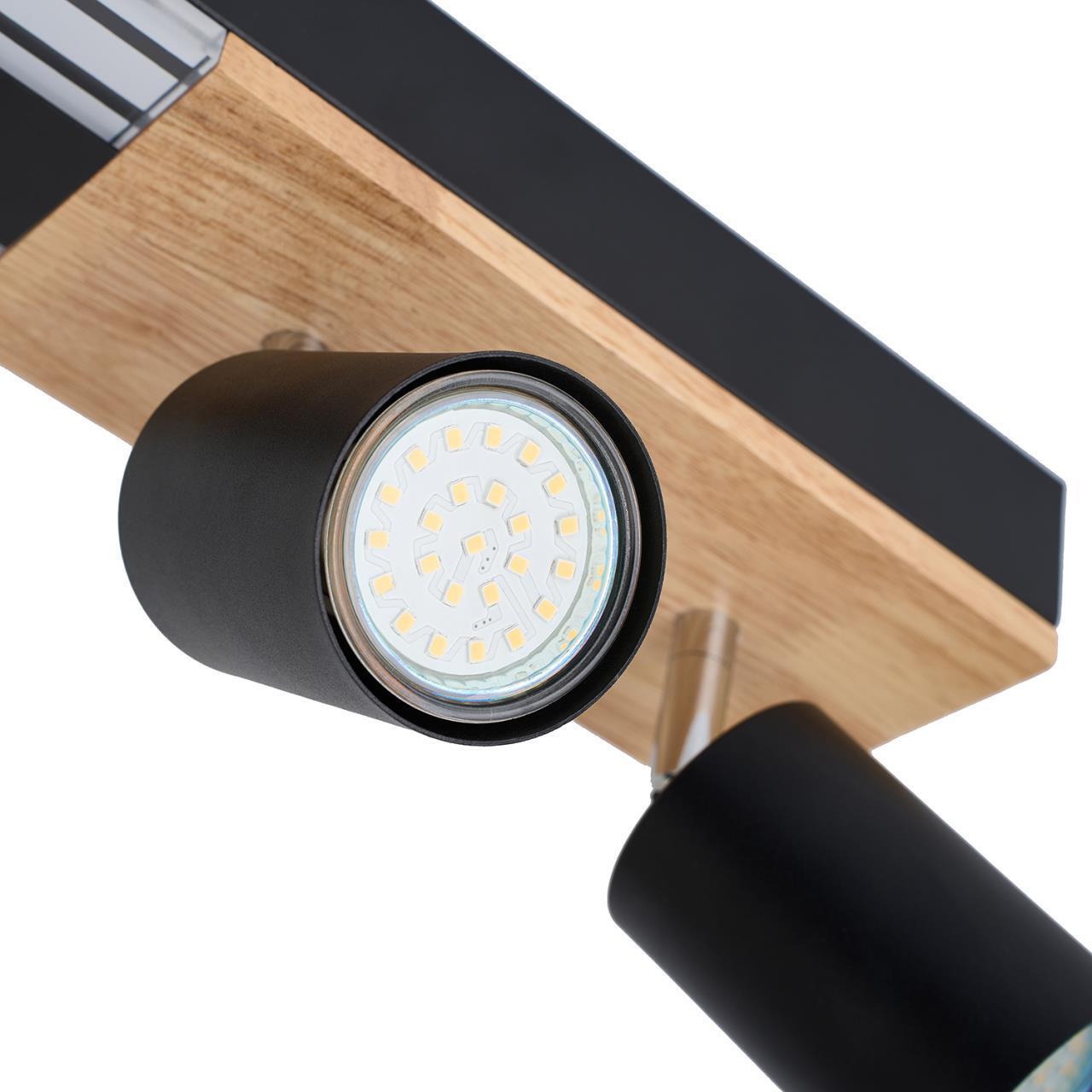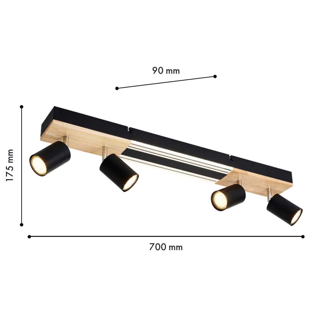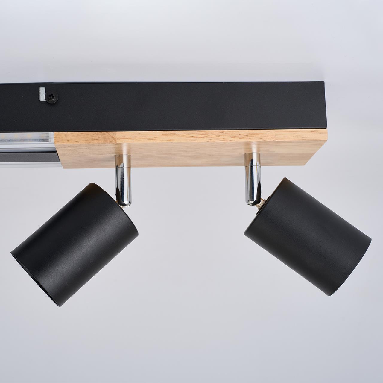 Металлический каркас черного цвета, декоративная вставка из МДФ с фактурой дерева на основании светильника, матовый черный каркас, встроенный LEDмодуль, поворотные споты черного цвета.