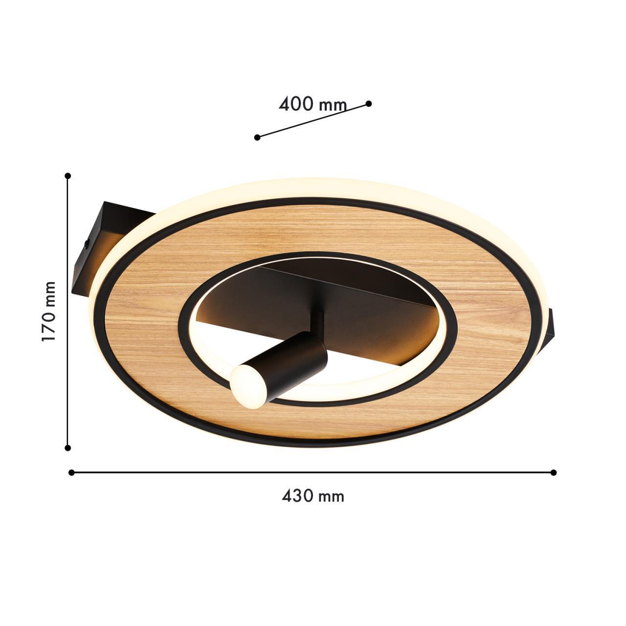 Металлический каркас черного цвета, декоративная вставка из МДФ с фактурой дерева на основании светильника, поворотный спот черного цвета, встроенный источник света по периметру кольца и внутри плафона, регулируемая мощность и температуру света, пульт в комплекте.