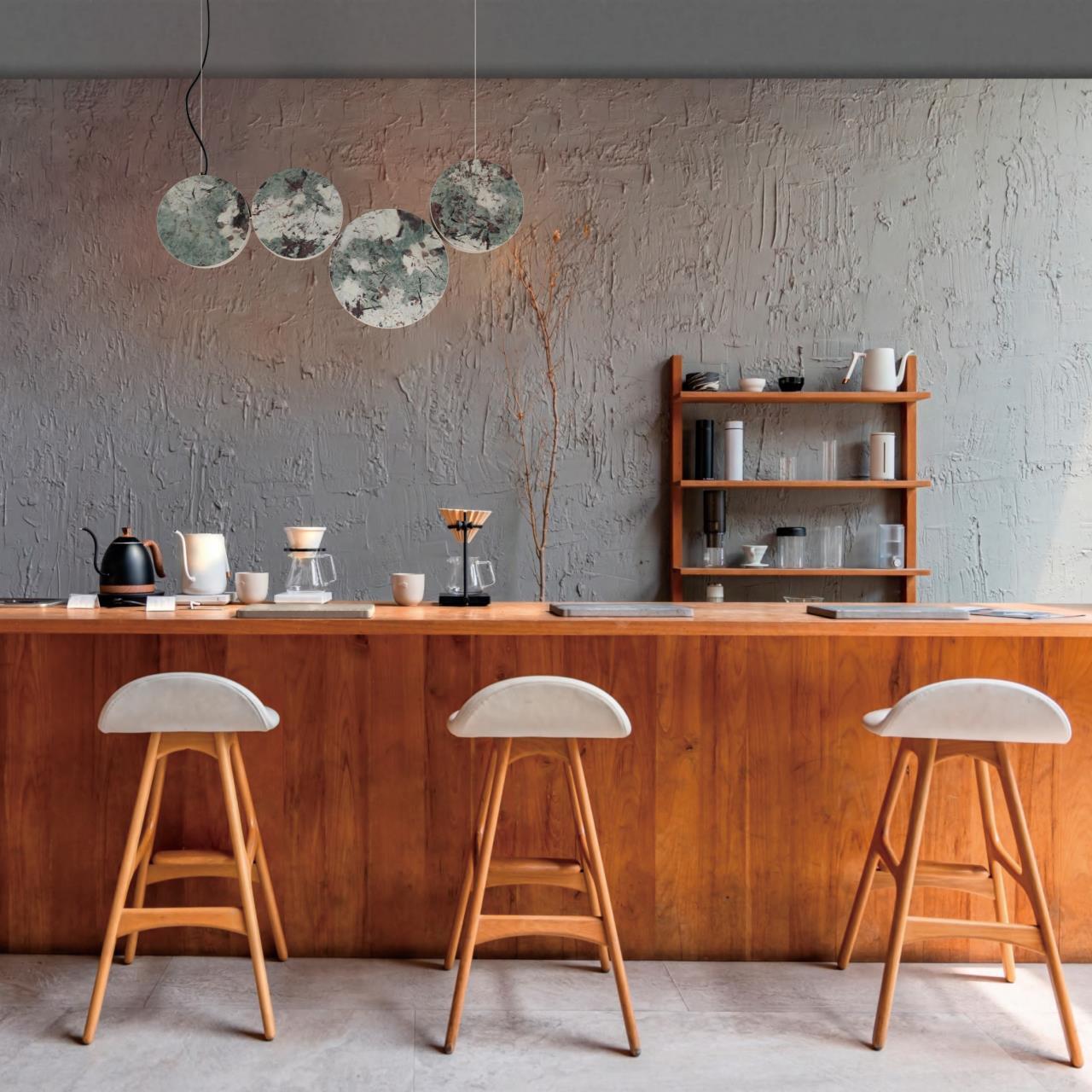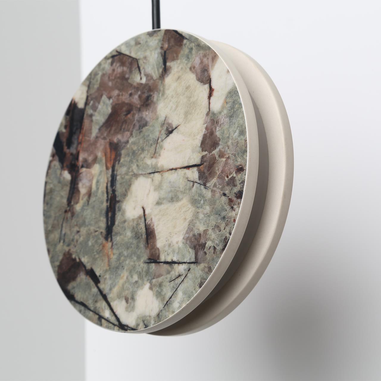 Двусторонний плафон из искусственного мрамора серозеленого оттенка в форме диска, светящегося по контуру, чаша крепления золотого цвета.