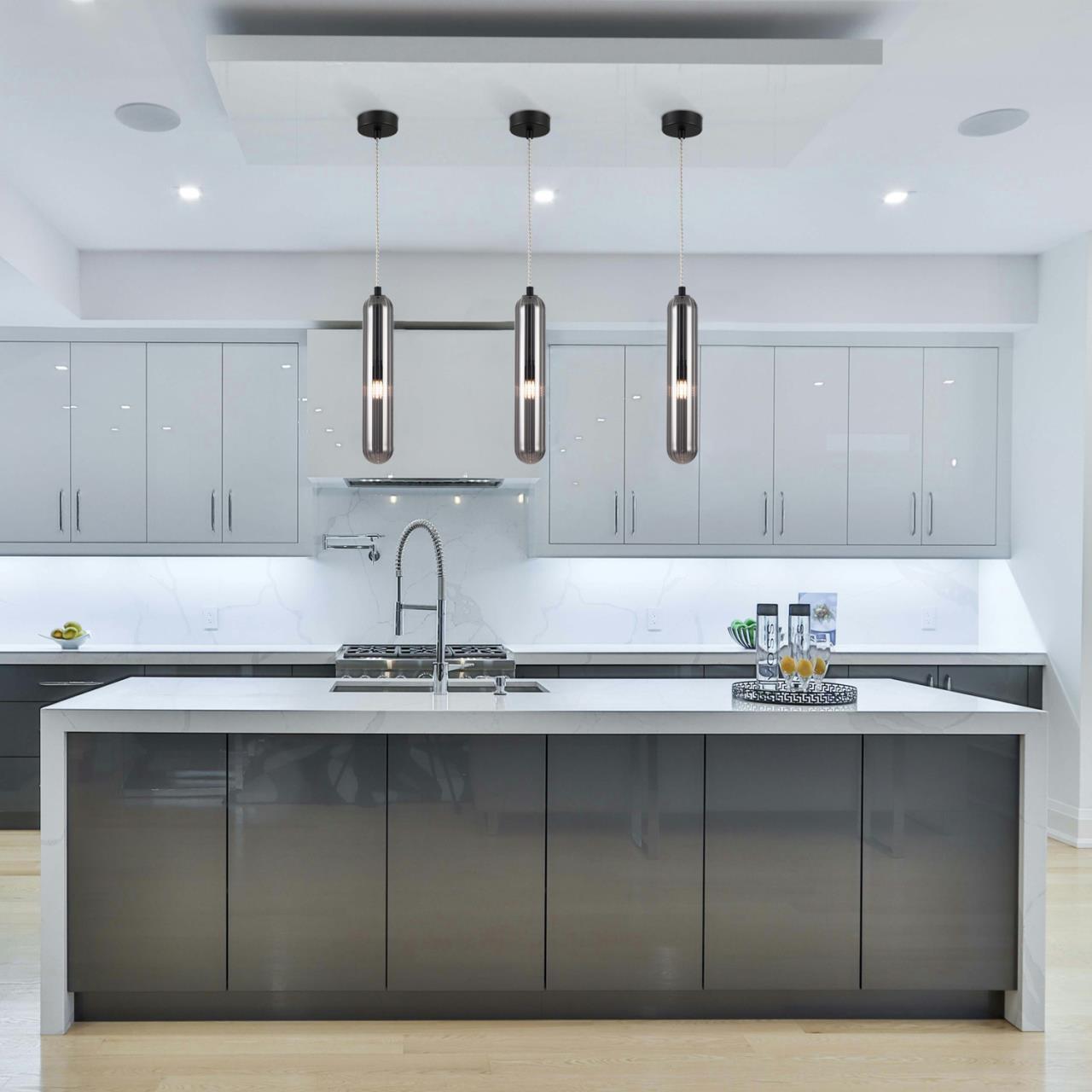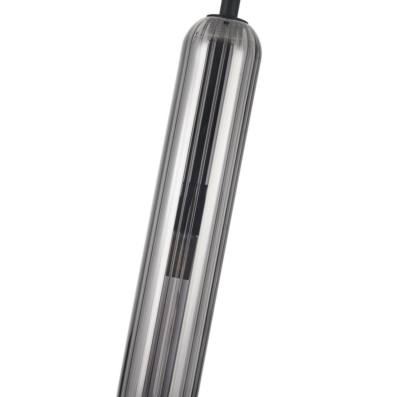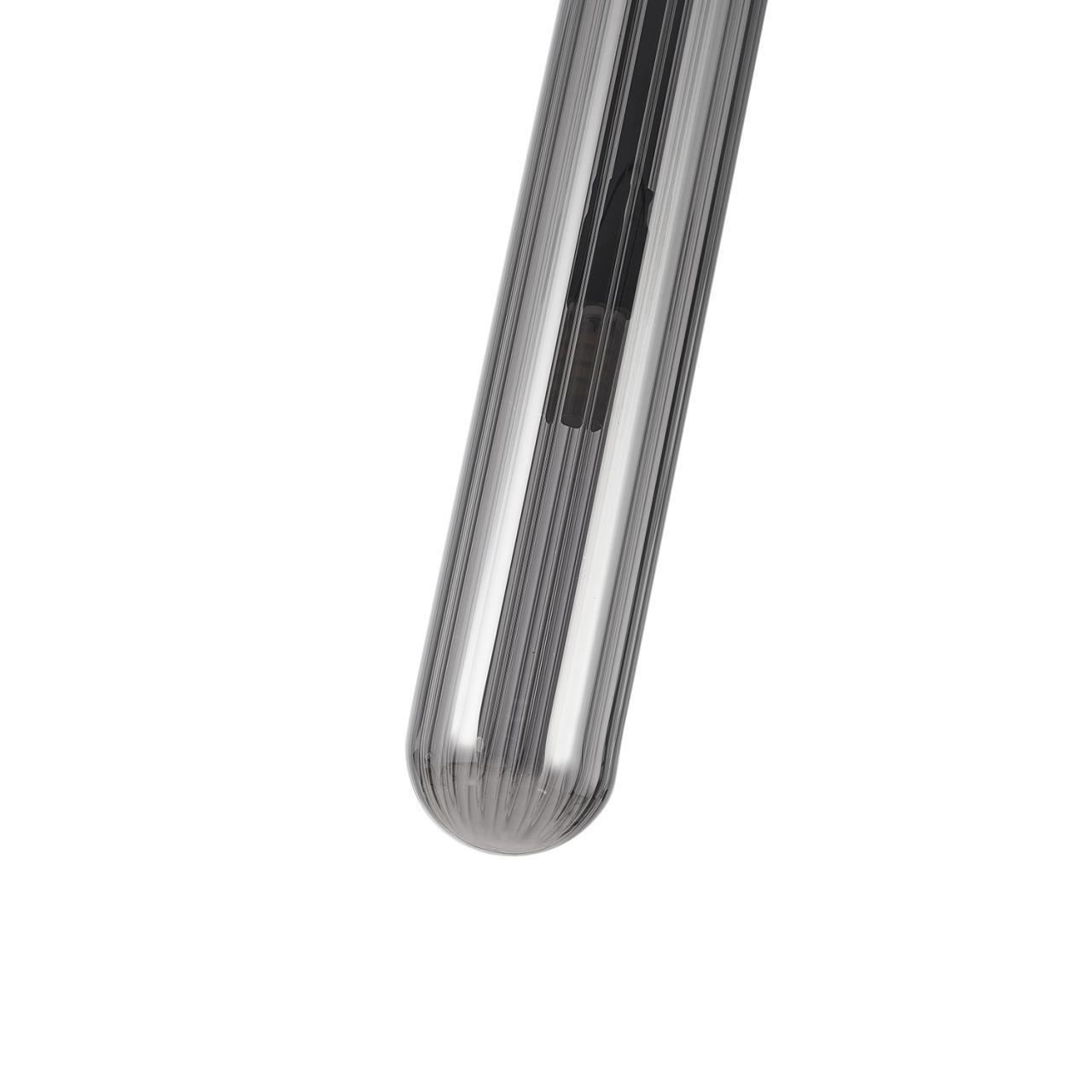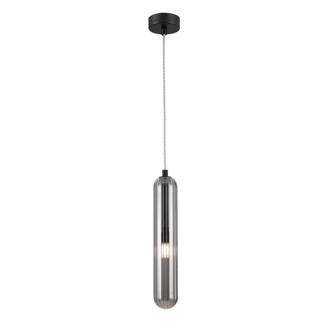 Металлический каркас черного матового цвета, дымчатосерый удлиненный стеклянный плафон, сменная лампа G9.