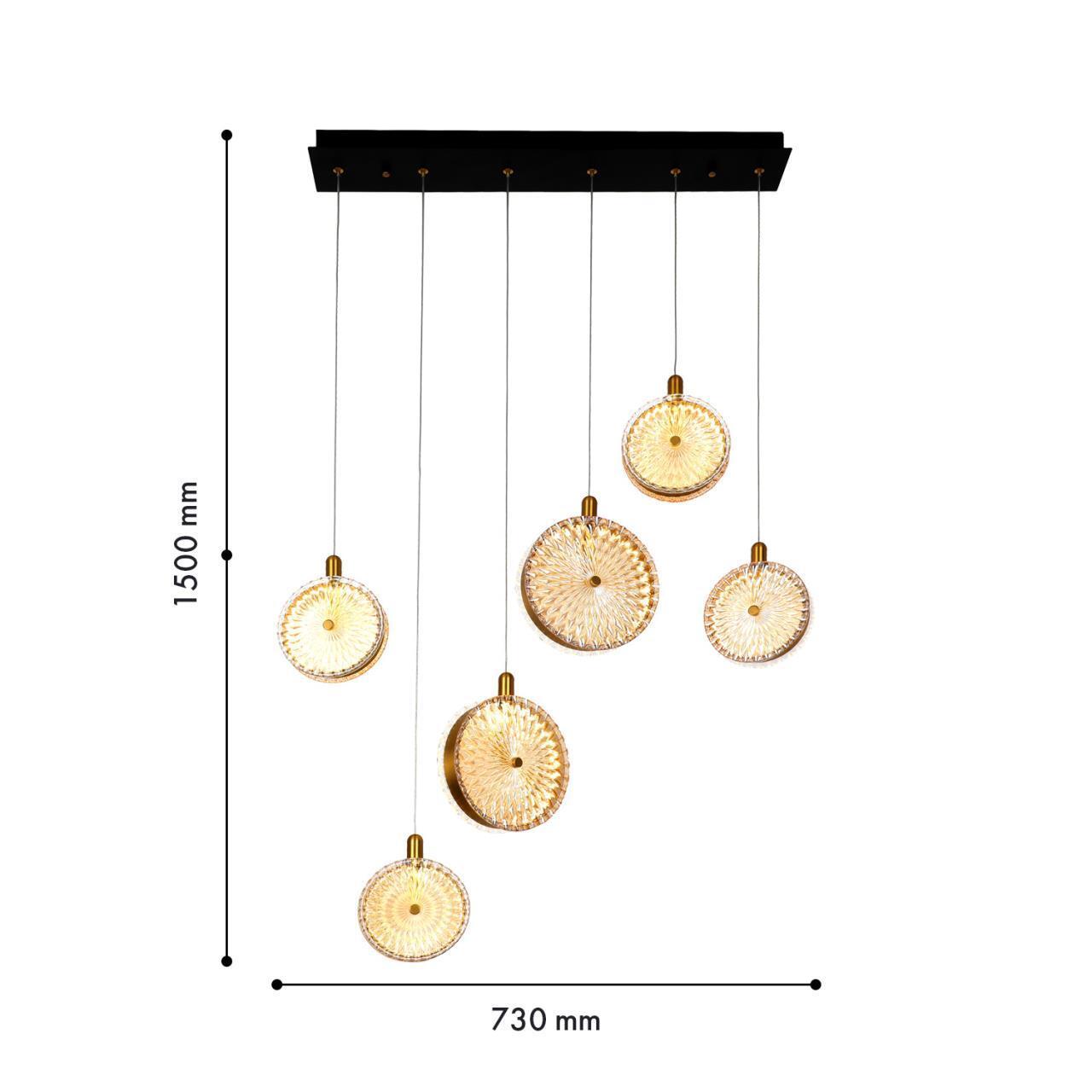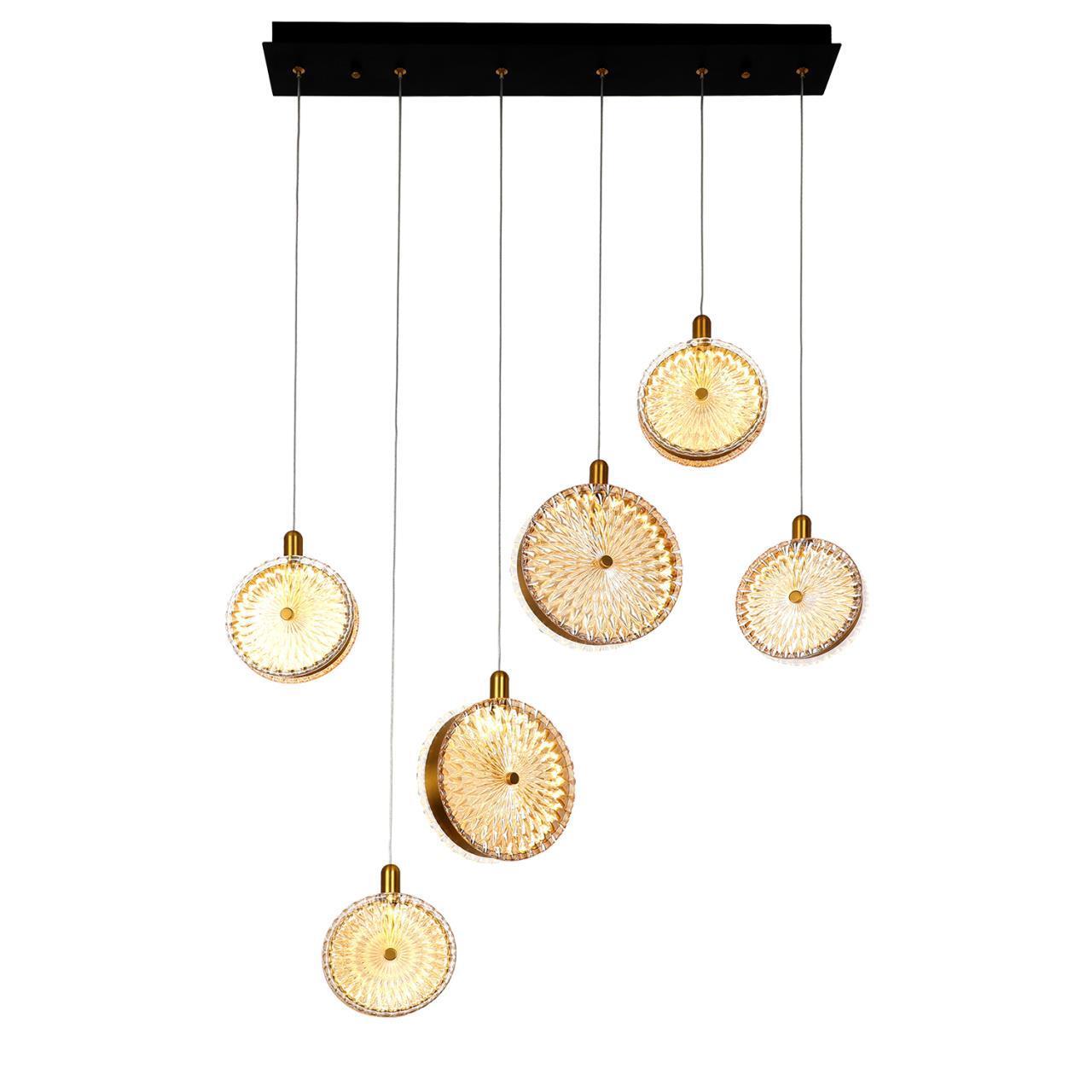 Потолочная люстра с черным каркасом, из шести плафонов разного размера, каждый из которых состоит из двух узорных стеклянных дисков прозрачного и янтарного цвета, внутри которых расположен LEDмодуль, регулируемая высота.