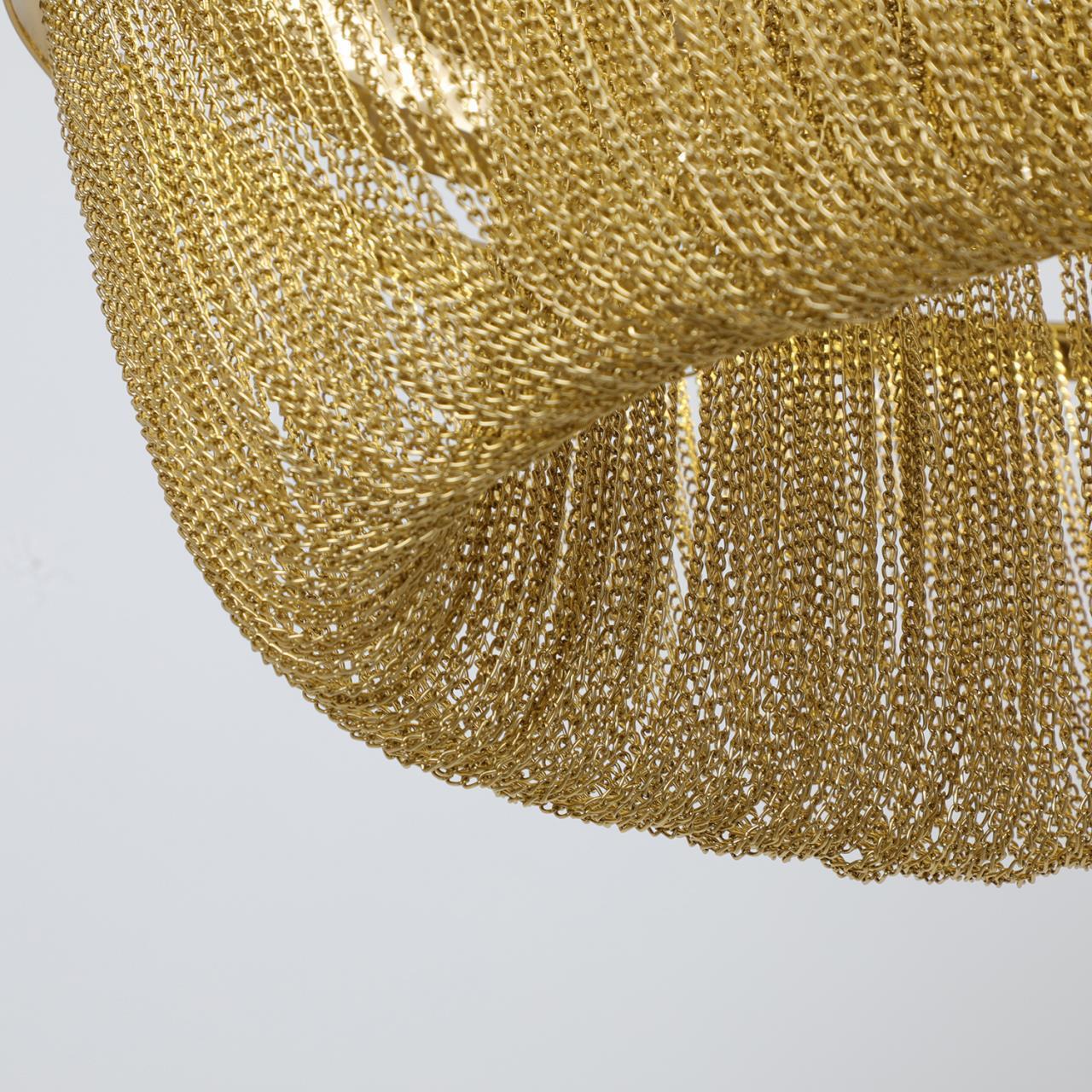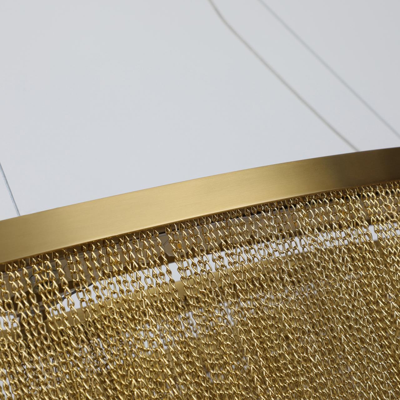 Плафон люстры выполнен из полотна цепочек, каркас в цвете латунь, внутри встроенная лента LED по периметру люстры, регулируемая высота.