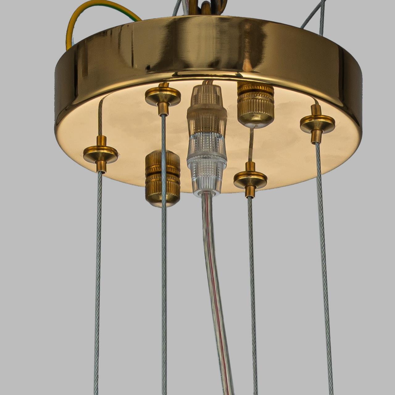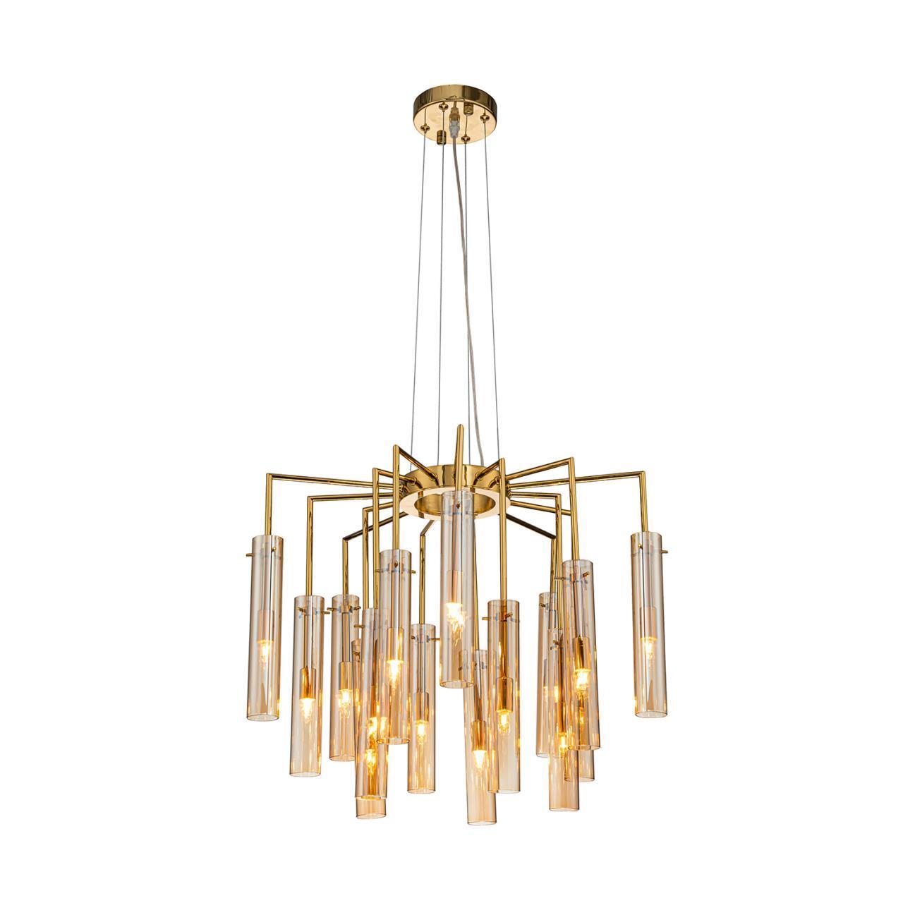 Каскадная люстра, каркас в цвете золото, состоит из металлических трубок, изогнутых от центрального кольца под прямым углом, на конце каждой трубки расположен тонкий длинный плафон из стекла янтарного цвета. сменная лампа G9, регулируемая высота.