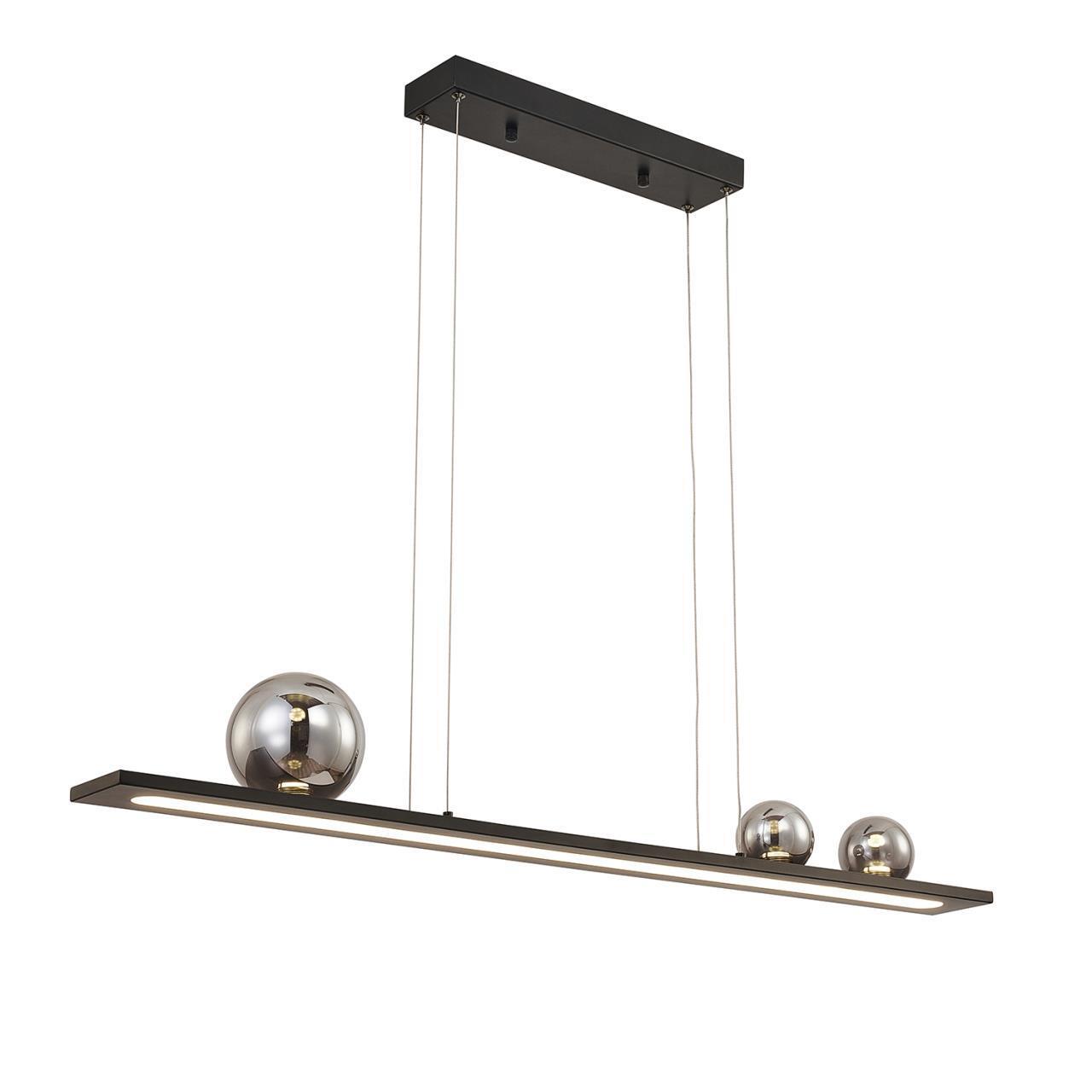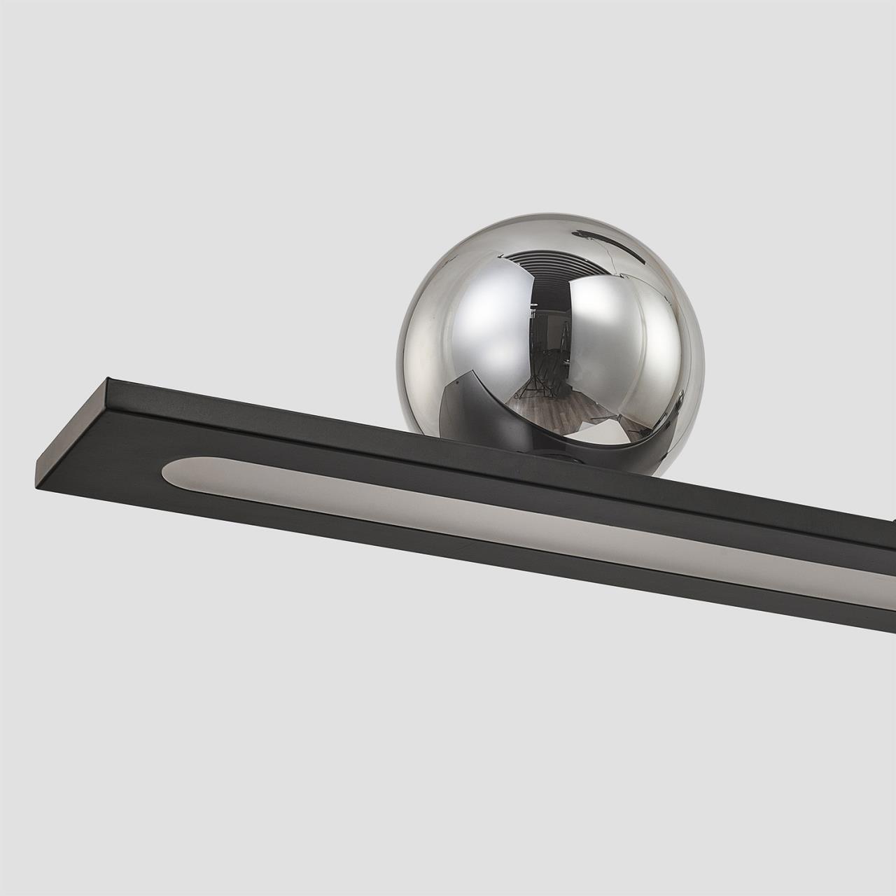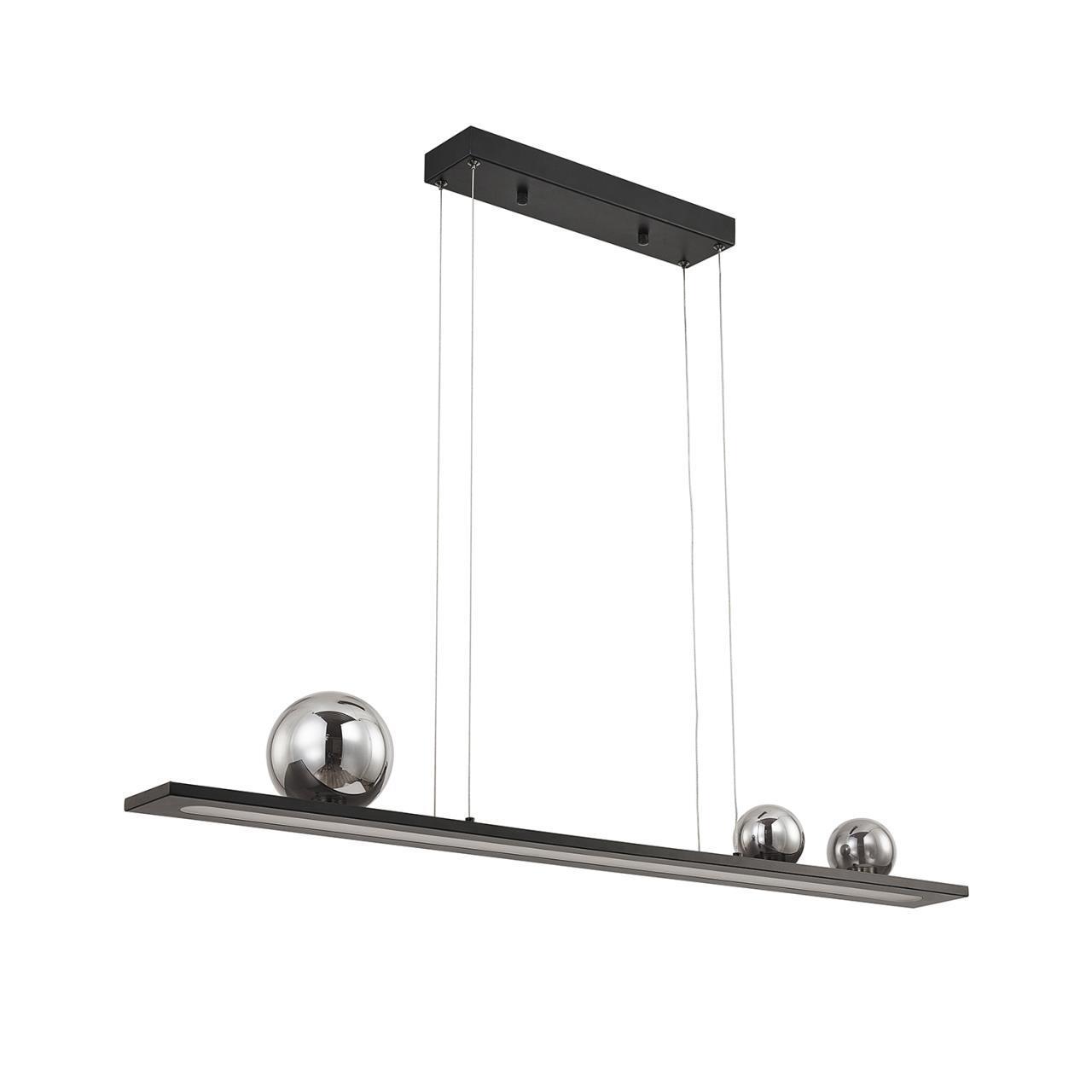 Подвес удлиненной прямоугольной формы с каркасом в черном цвете. Основной источник света LED направлен вниз, декоративные зеркальносерые плафоны из стекла, ассиметрично расположены в верхней части и также оснащены встроенными модулями LED.