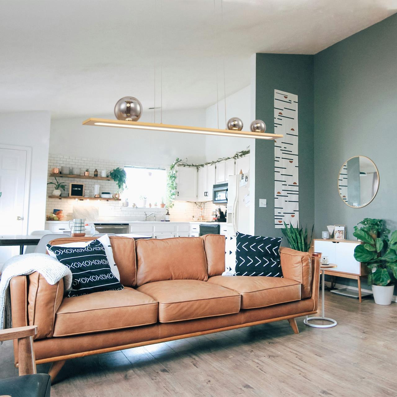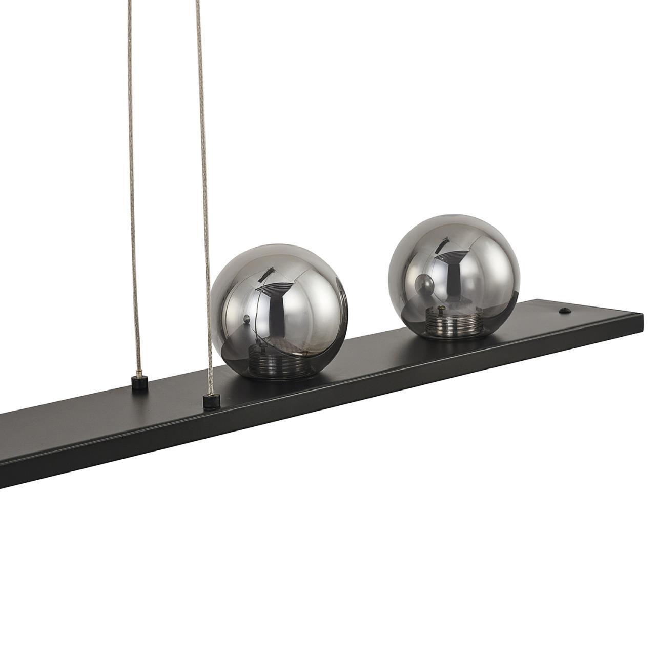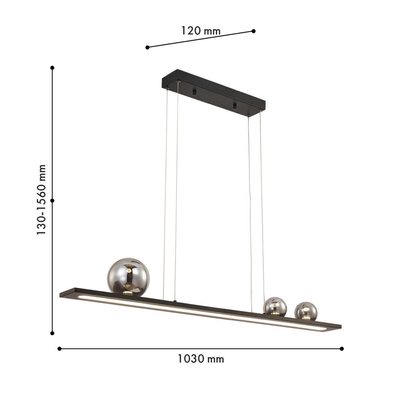 Подвес удлиненной прямоугольной формы с каркасом в черном цвете. Основной источник света LED направлен вниз, декоративные зеркальносерые плафоны из стекла, ассиметрично расположены в верхней части и также оснащены встроенными модулями LED.