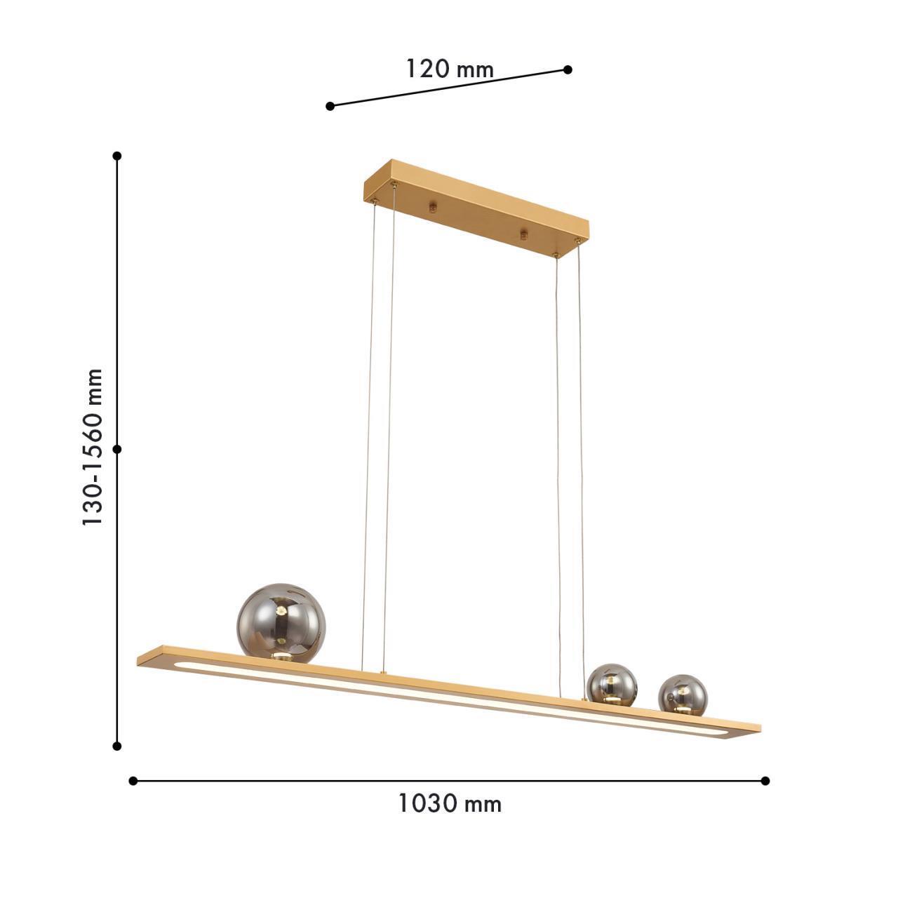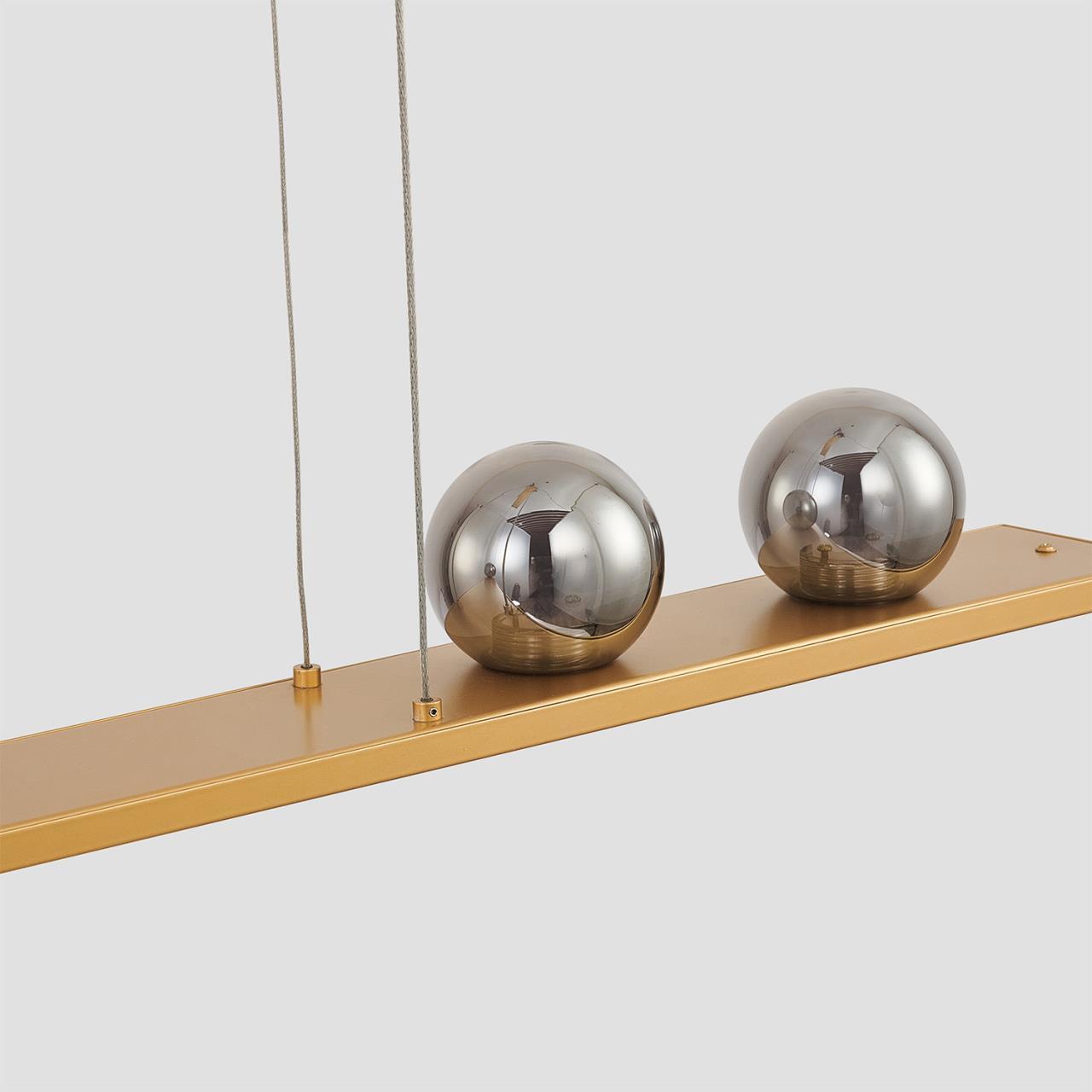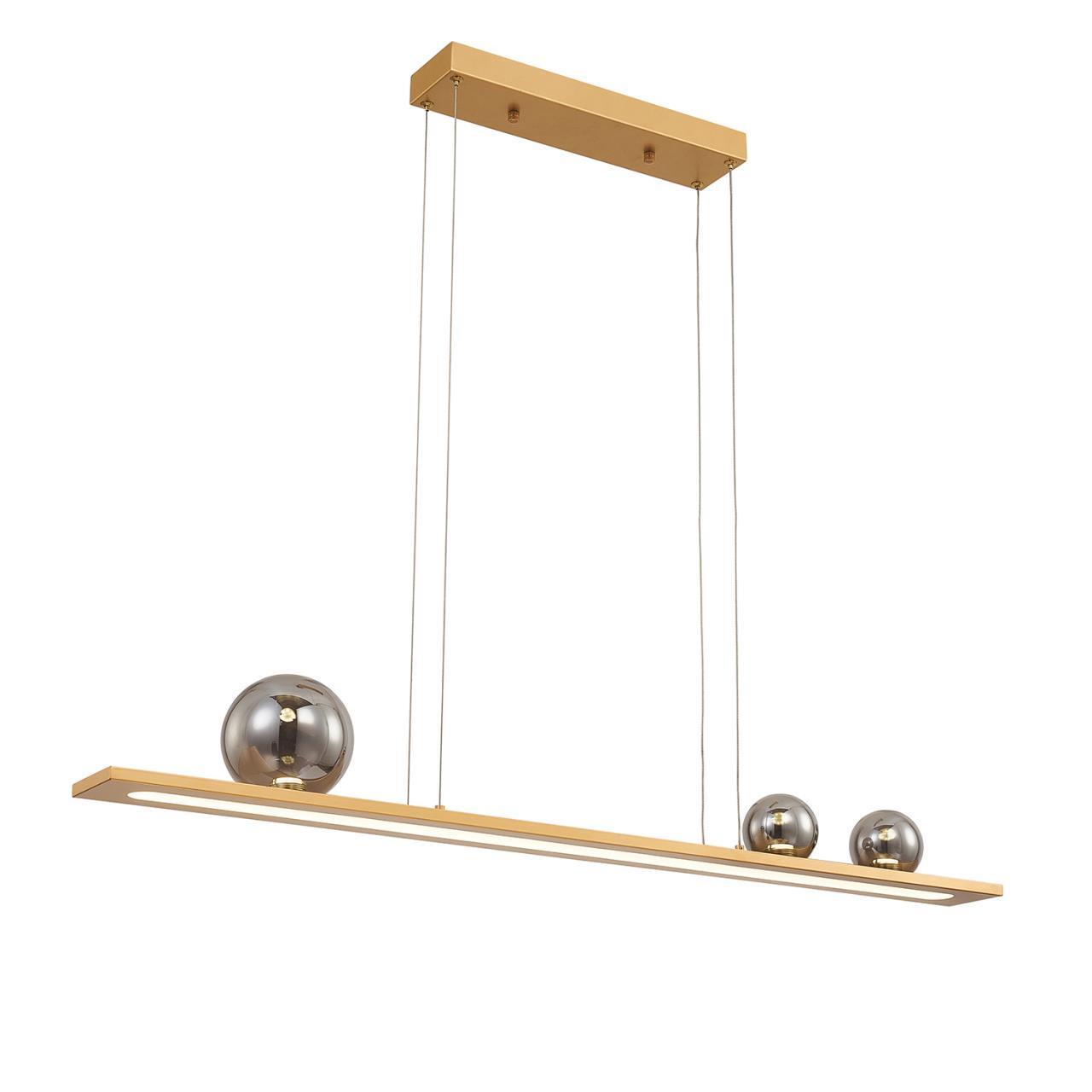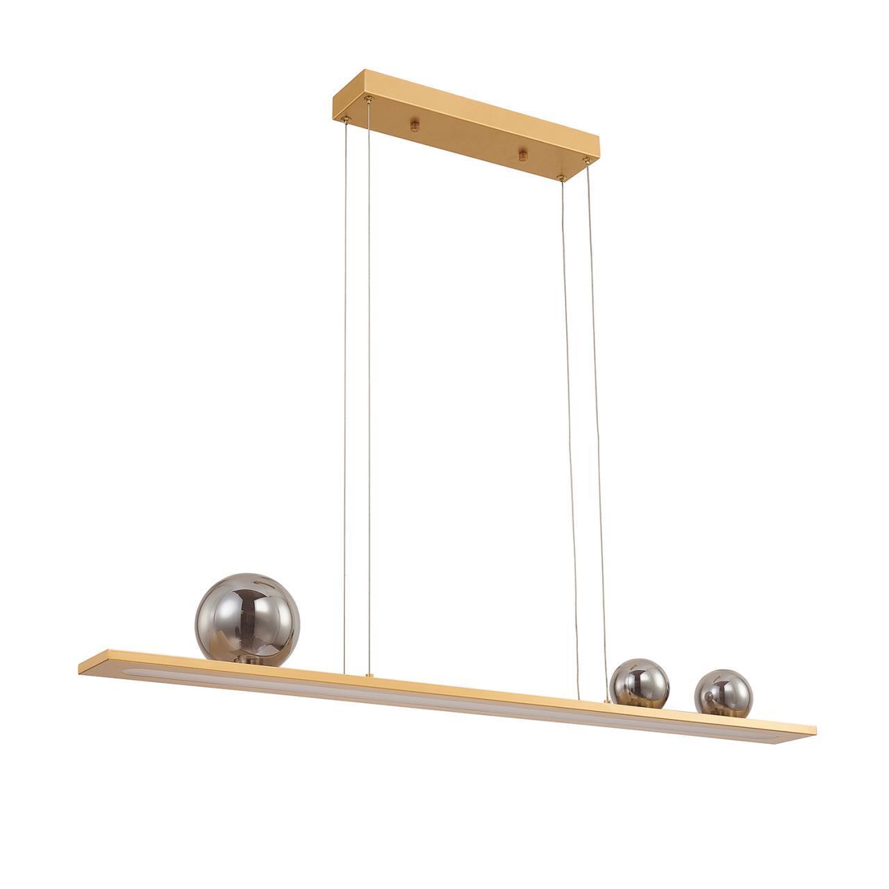 Подвес удлиненной прямоугольной формы в цвете золото. Основной источник света LED направлен вниз, декоративные зеркальносерые плафоны из стекла, ассиметрично расположены в верхней части и также оснащены встроенными модулями LED.