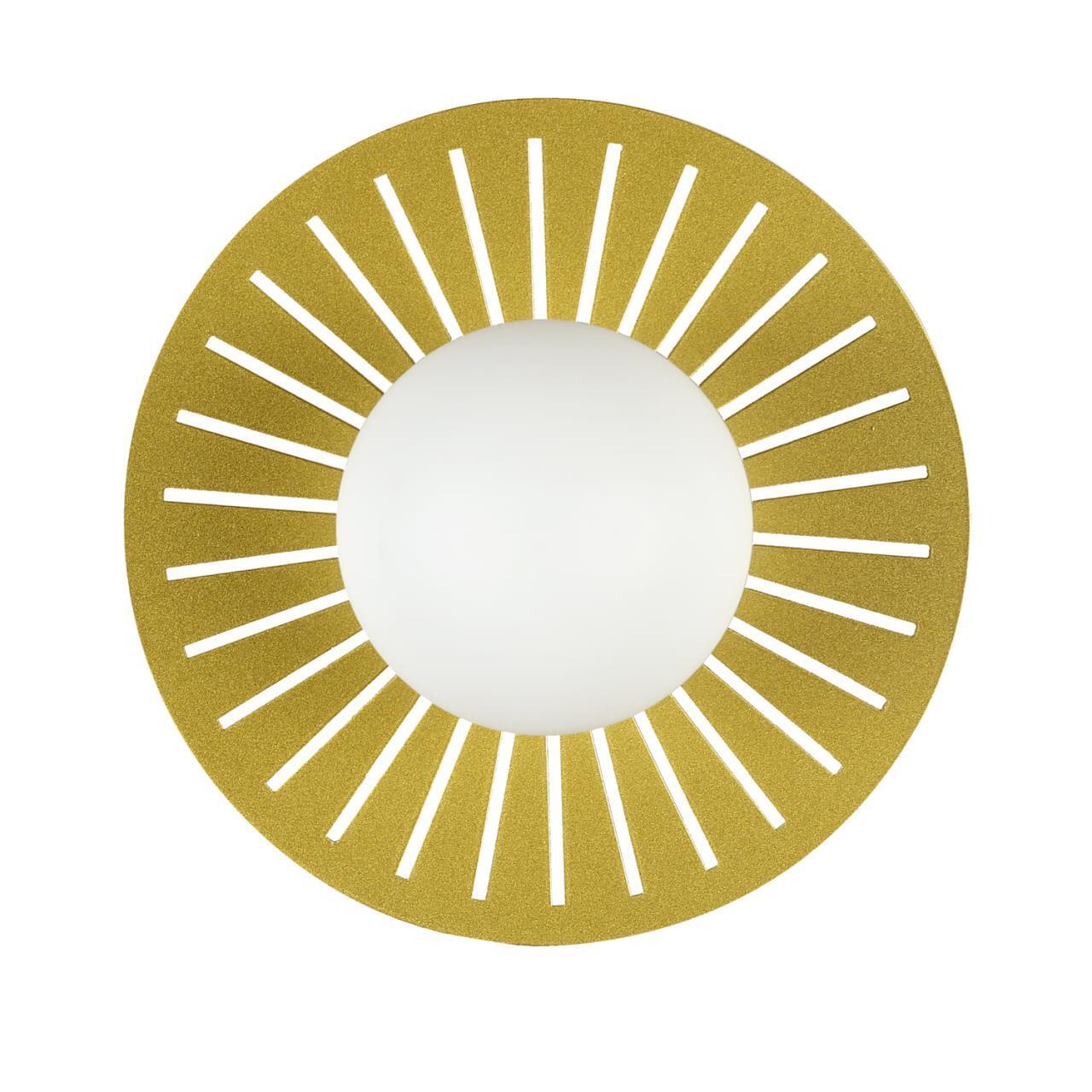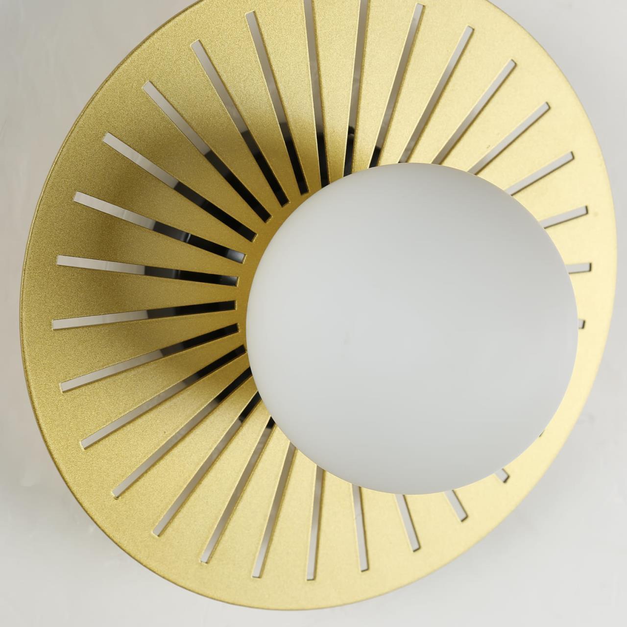 Металлический каркас черного цвета в сочетании с золотым, белое выдувное стекло.