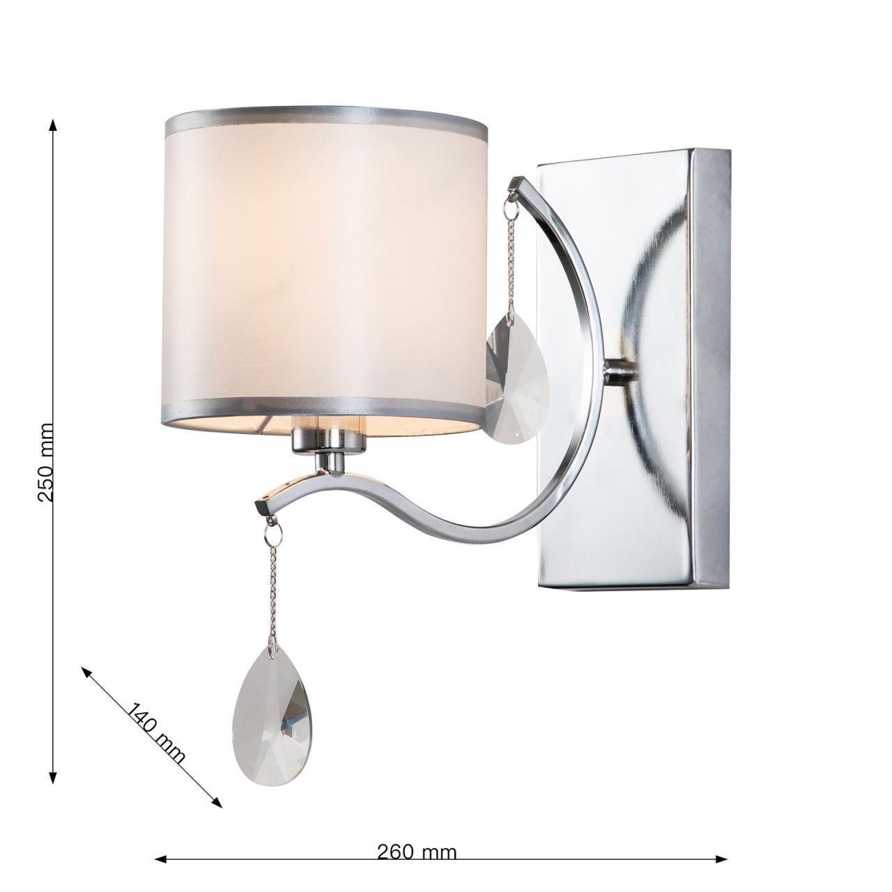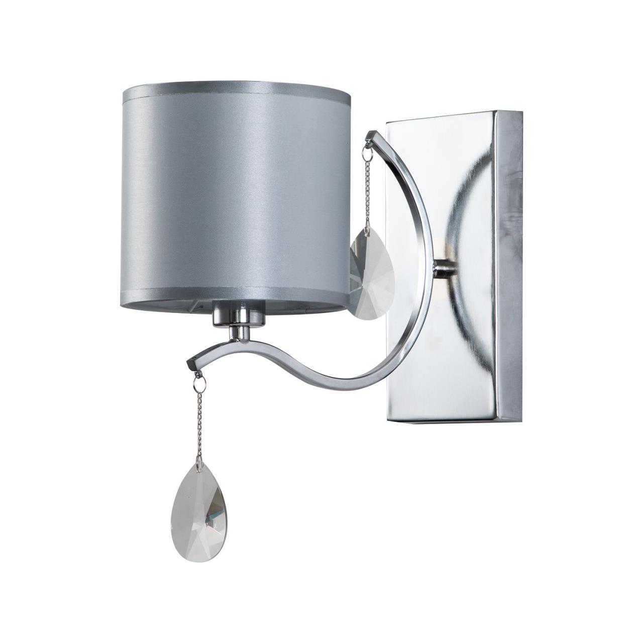 Каркас цвета хром, плафон из светло-серой ткани, декоративный элемент в виде подвесок с хрусталем