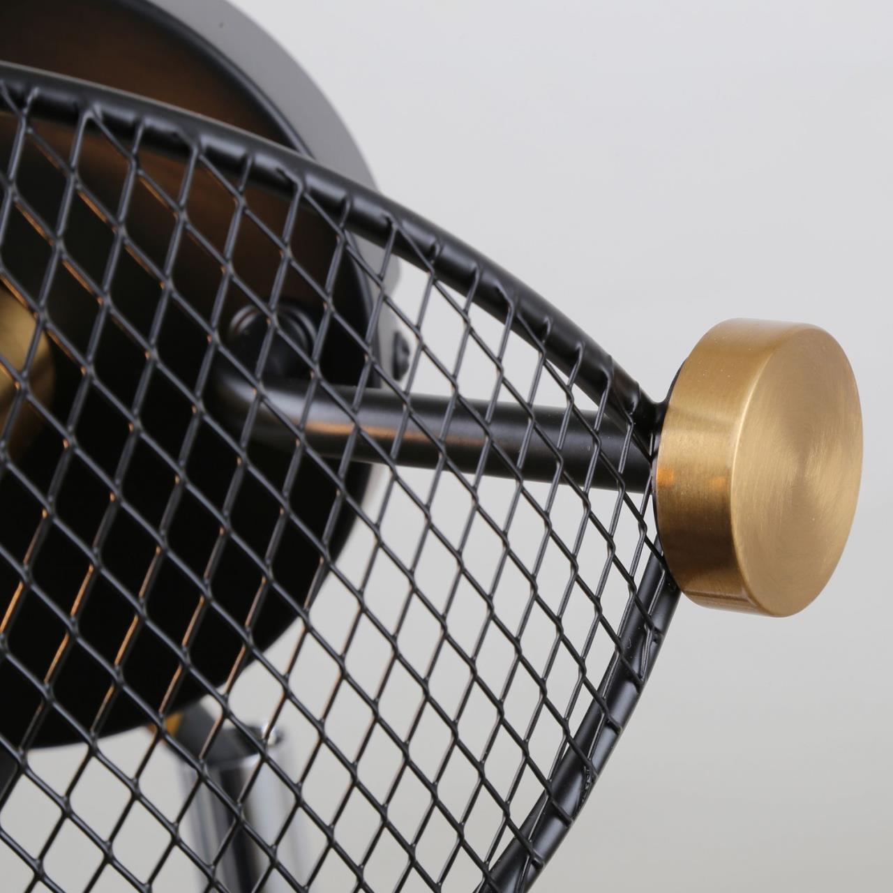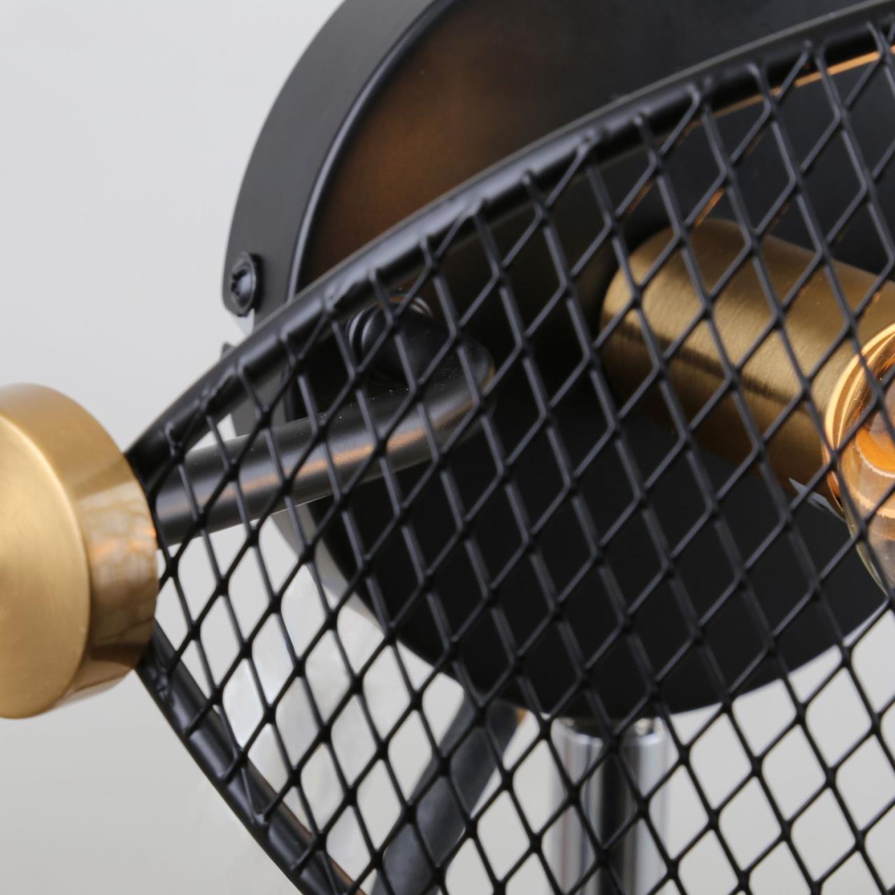 Металлический каркас черного цвета в сочетании с декоративными элементами латунного цвета, декоративные элементы из перфорированного металла черного цвета, сменная лампа.