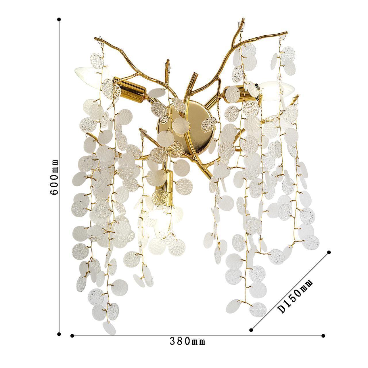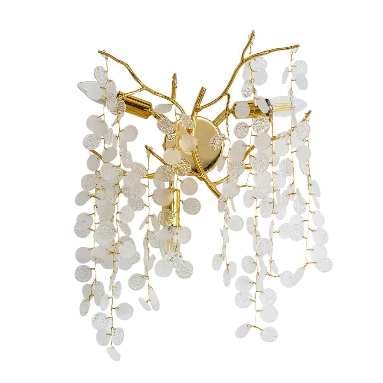 Металлический каркас покрыт золотом гальваническим способом, декор из прозрачного и белого матового стекла, лампы E14 можно менять.