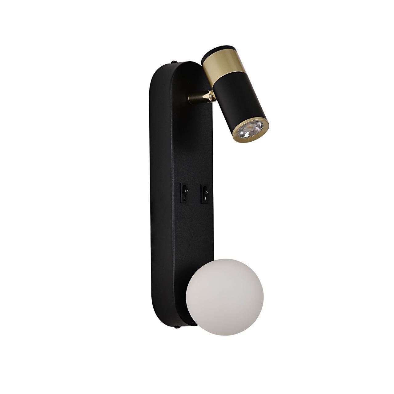 Металлический каркас черного матового цвета, вставки золотого матового цвета, плафон из белого акрила, два источника света, оснащен выключателем.