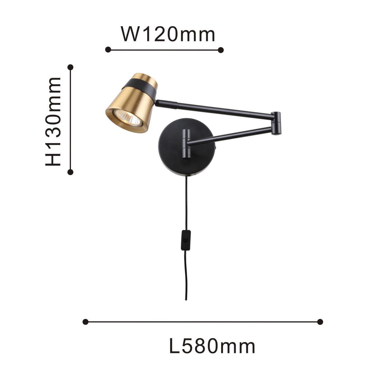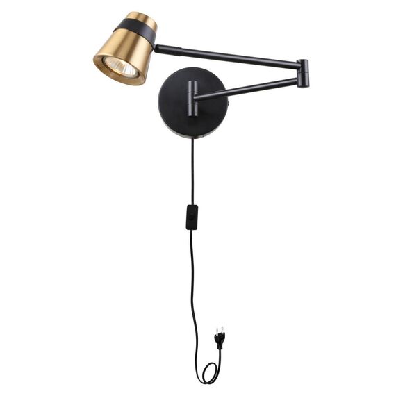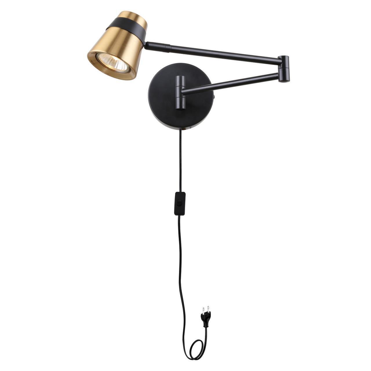 Металлический каркас черного цвета, металлический плафон золотого цвета, угол поворота штанги на 180 градусов, угол поворота плафона 45 градусов вверх или вниз. Оснащен проводом с выключателем..