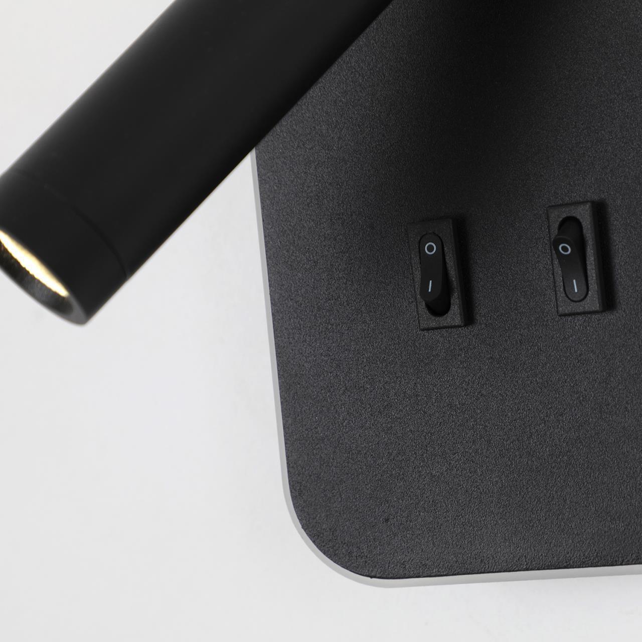 Каркас в матовом черном цвете, поворотный плафон, выключатели в виде кнопок на корпусе, LEDмодули, угол поворота 90° и 350°.