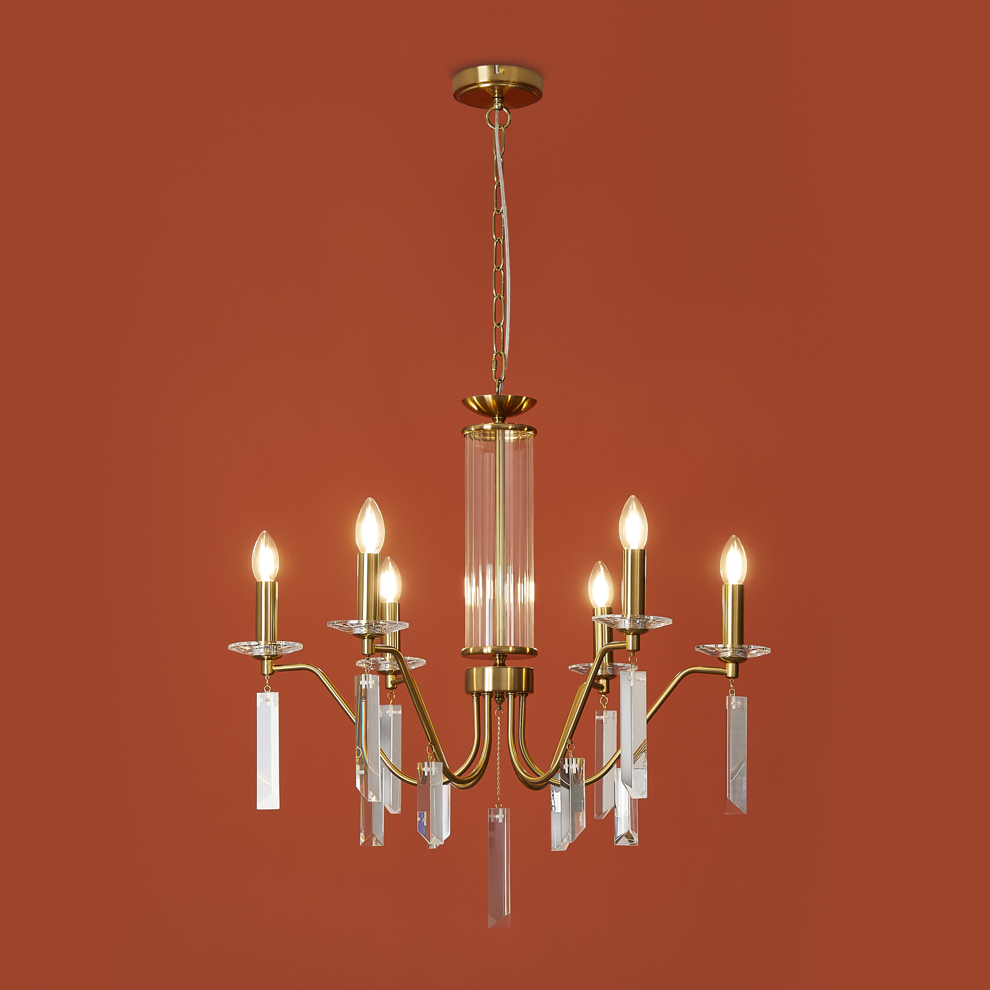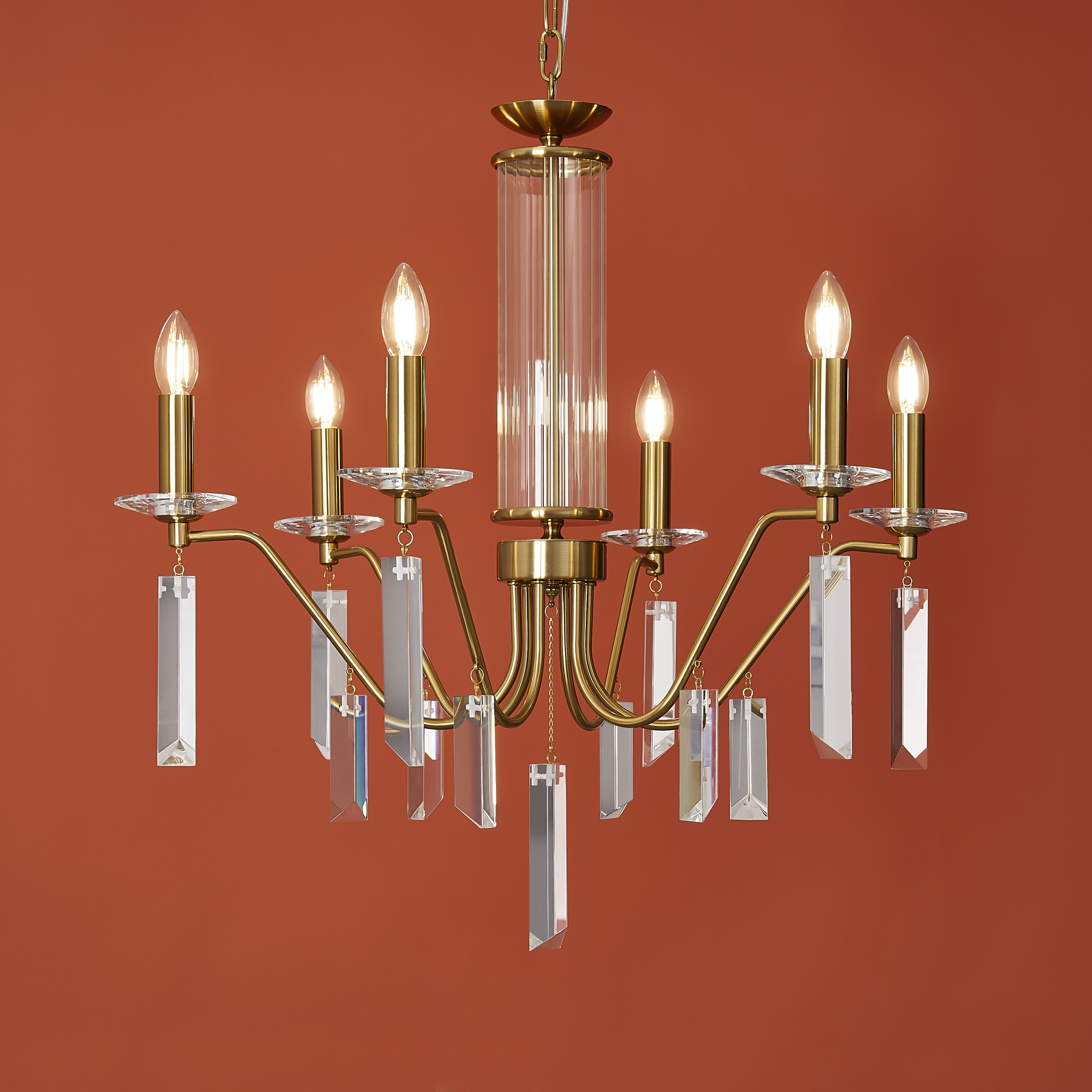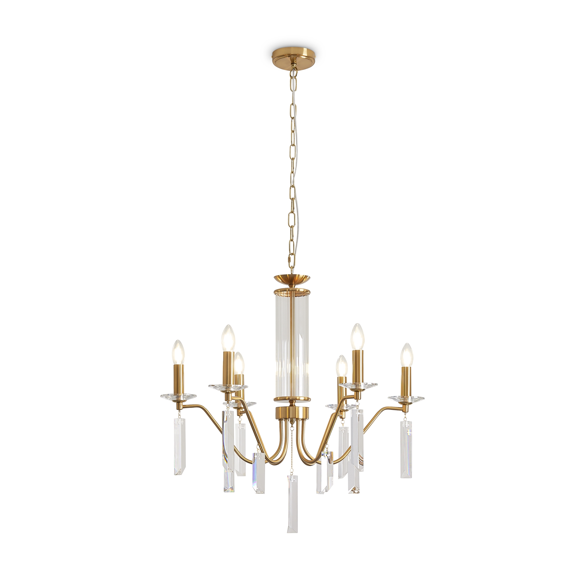 Материал арматуры — металл, цвет — никель или латунь. Подвесные светильники с цоколем E14. Доступны с пятью или шестью источниками света. Грани хрустальных подвесов создают эффект перелива радуги. Центральный декор из стеклянных трубок. Подходит для классических интерьеров.