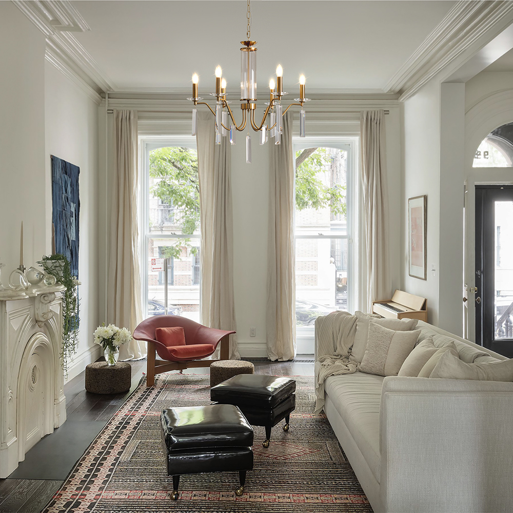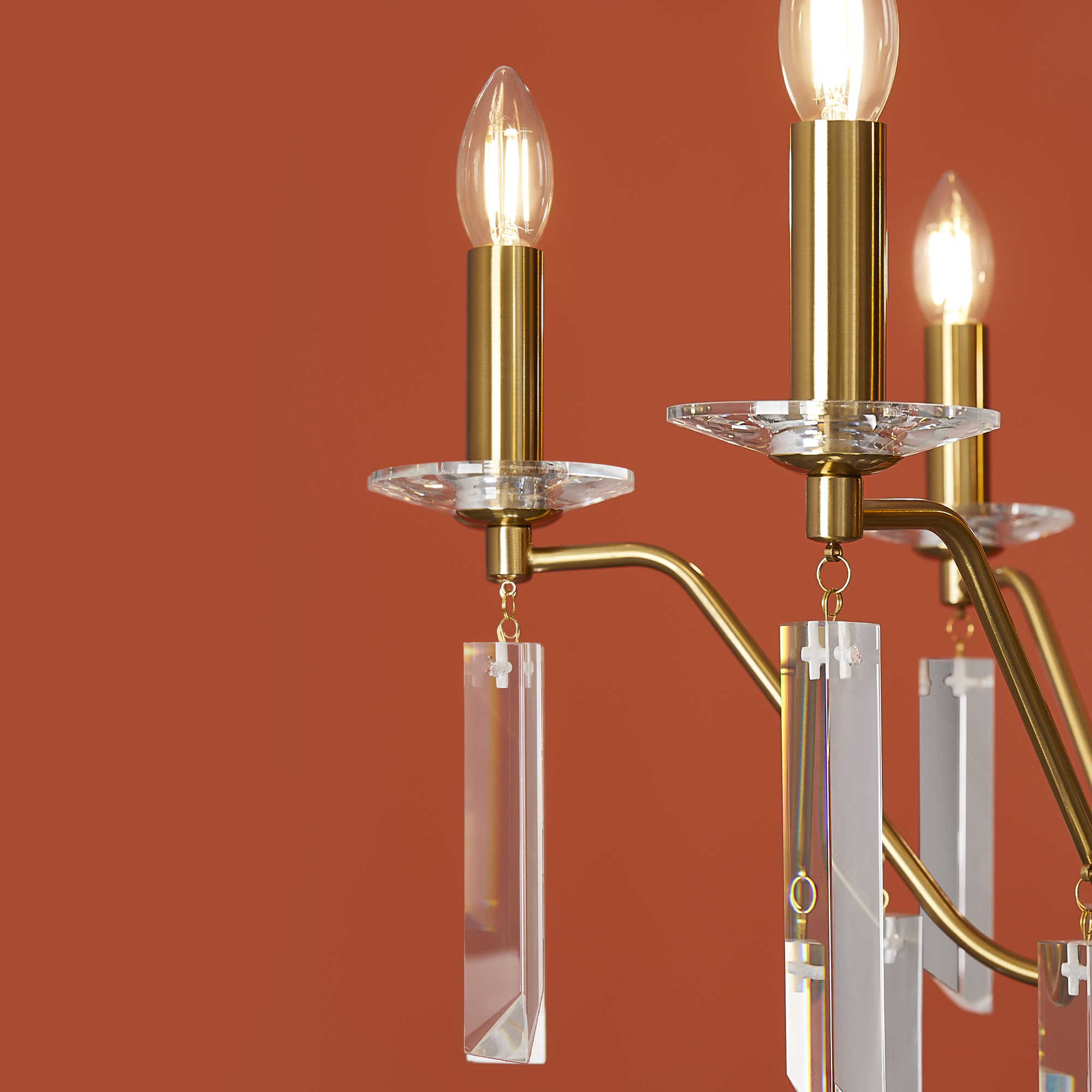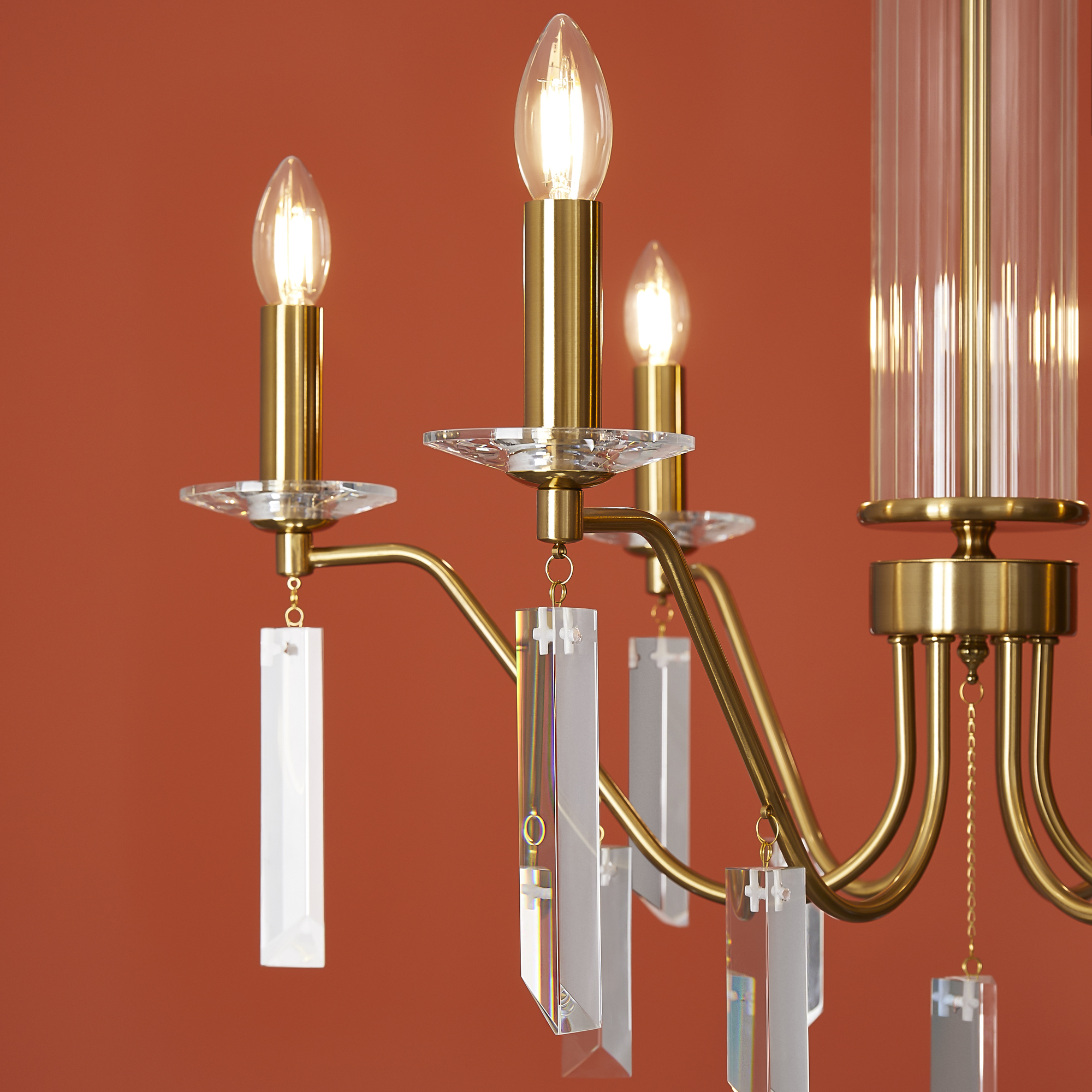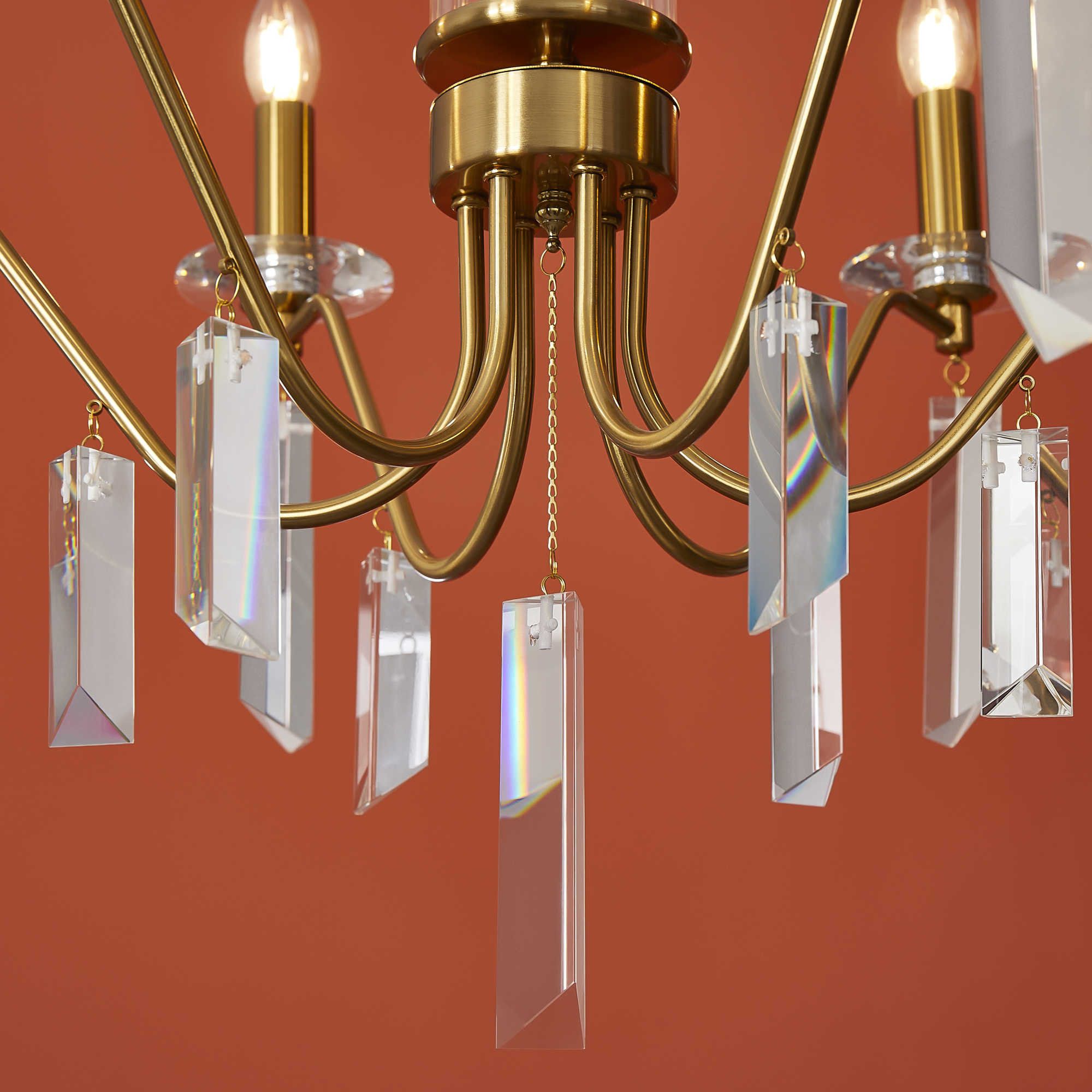 Материал арматуры — металл, цвет — никель или латунь. Подвесные светильники с цоколем E14. Доступны с пятью или шестью источниками света. Грани хрустальных подвесов создают эффект перелива радуги. Центральный декор из стеклянных трубок. Подходит для классических интерьеров.