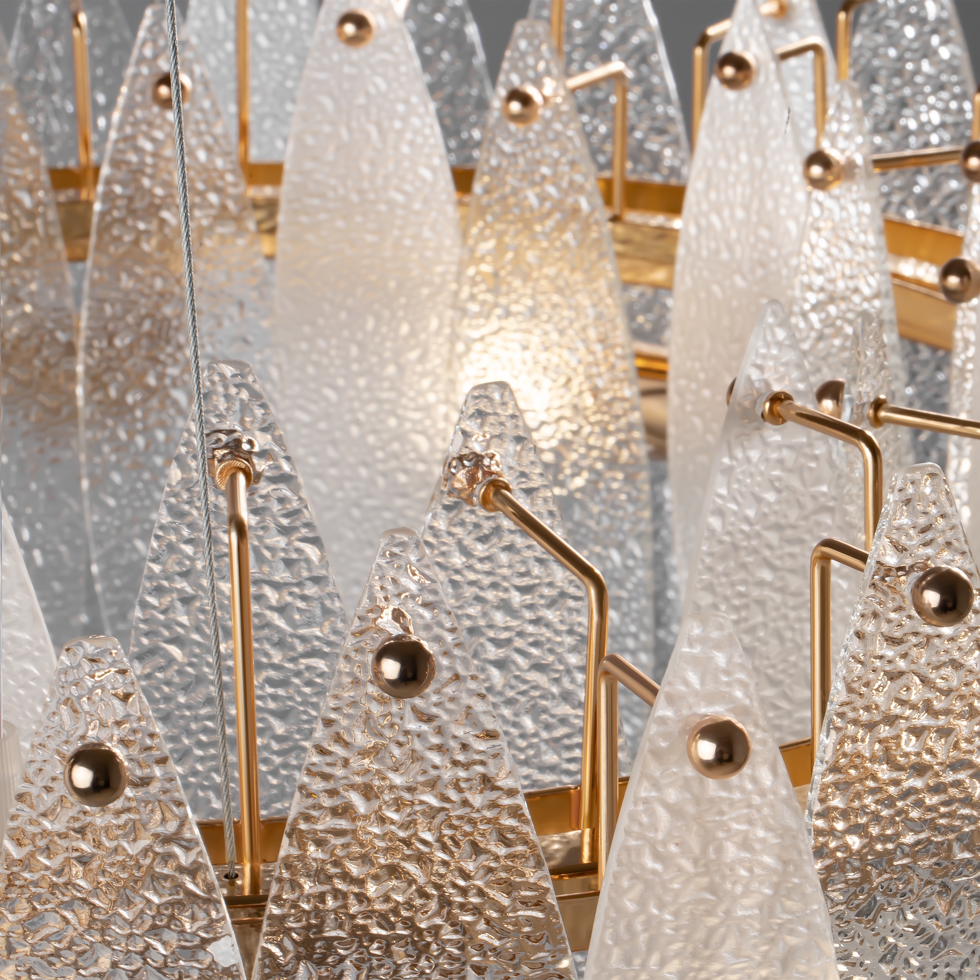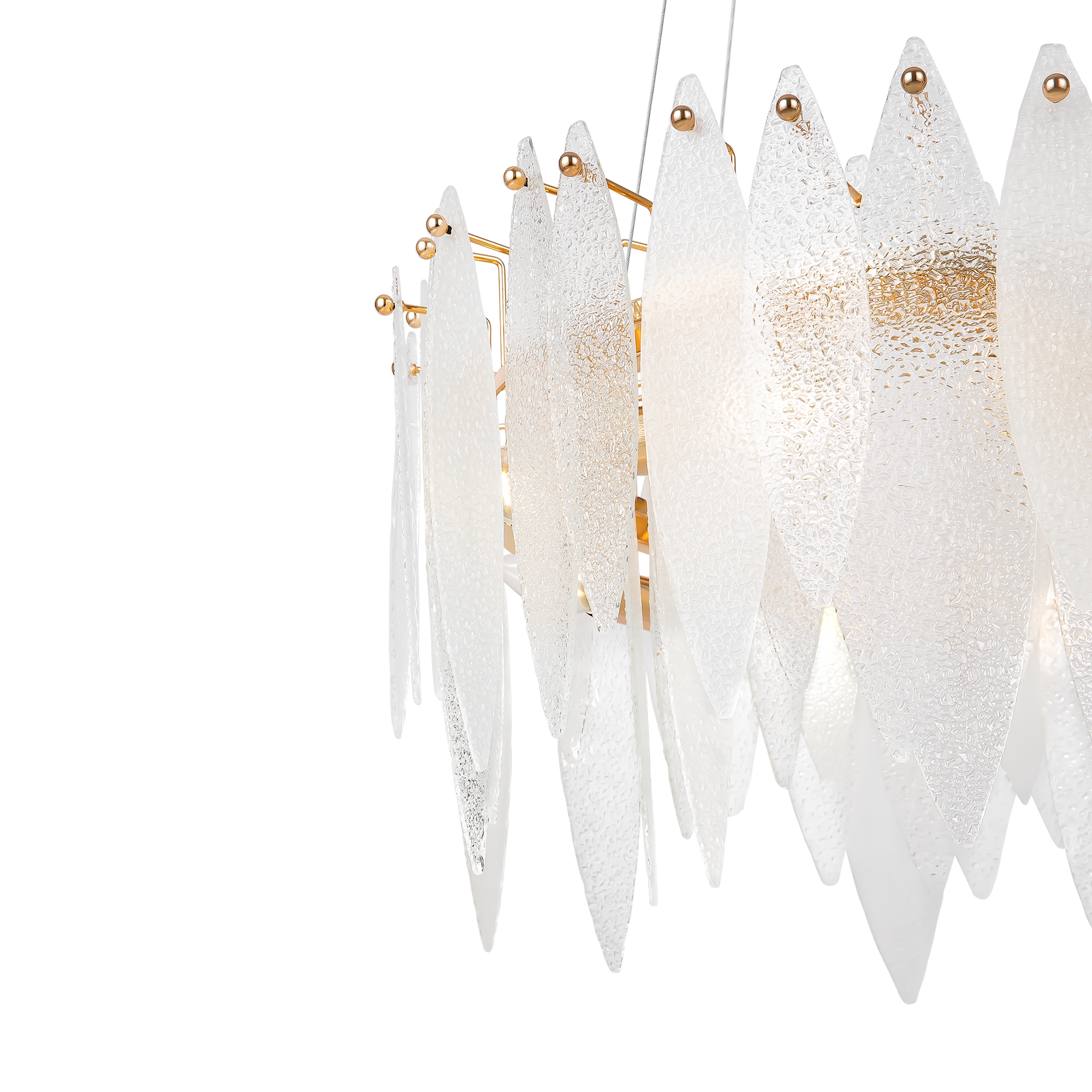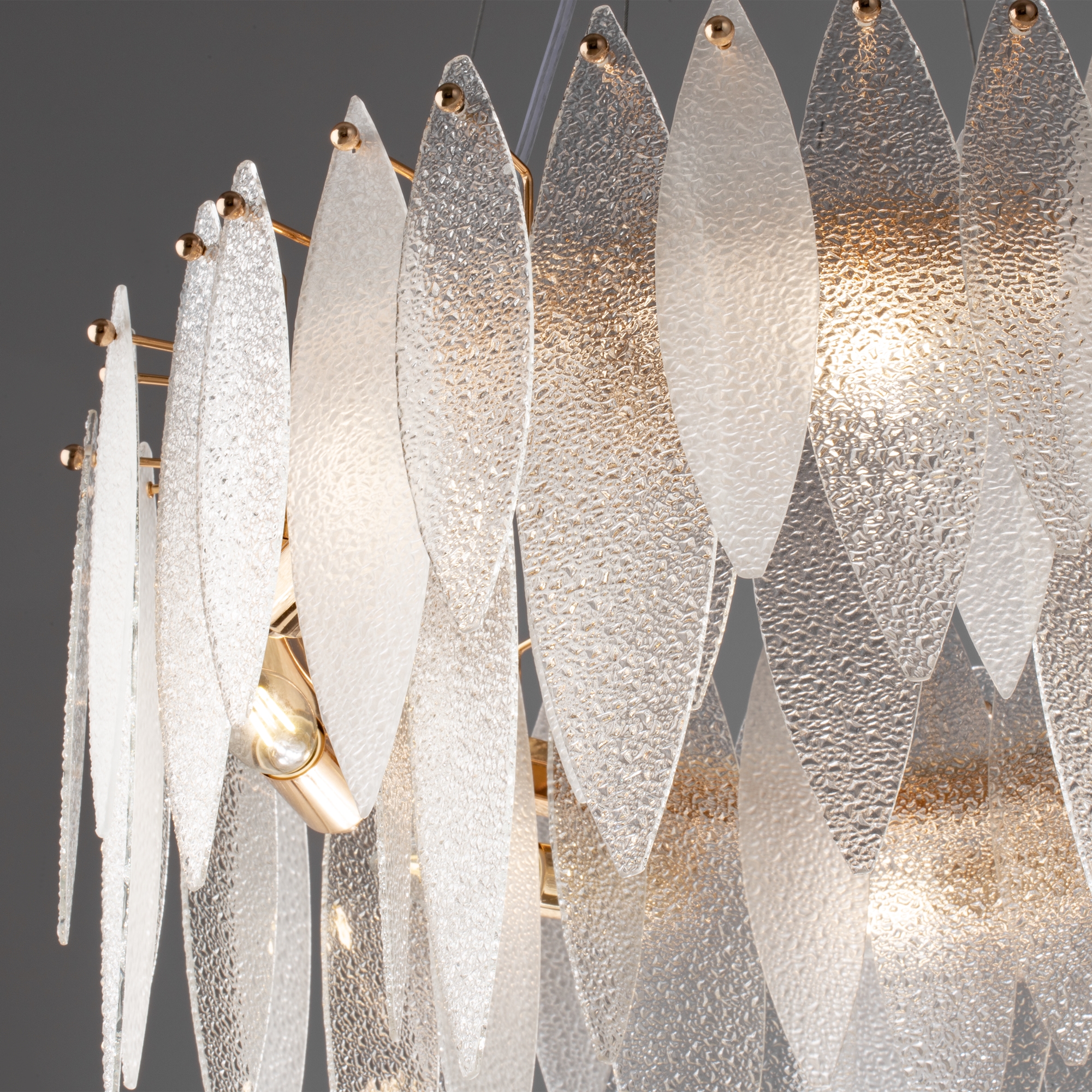 Металлическая арматура, цвет – французское золото. Декоративные элементы выполнены из прозрачного стекла в форме пестрых лепестков ледяной фактуры. Источник света – лампы с цоколем Е14, которые скрыты за декоративными подвесками, размещенными на металлической окружности. Высота подвесов регулируется.