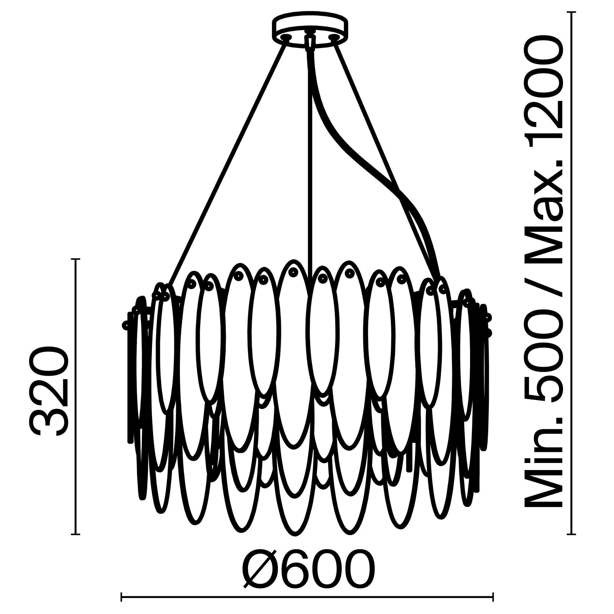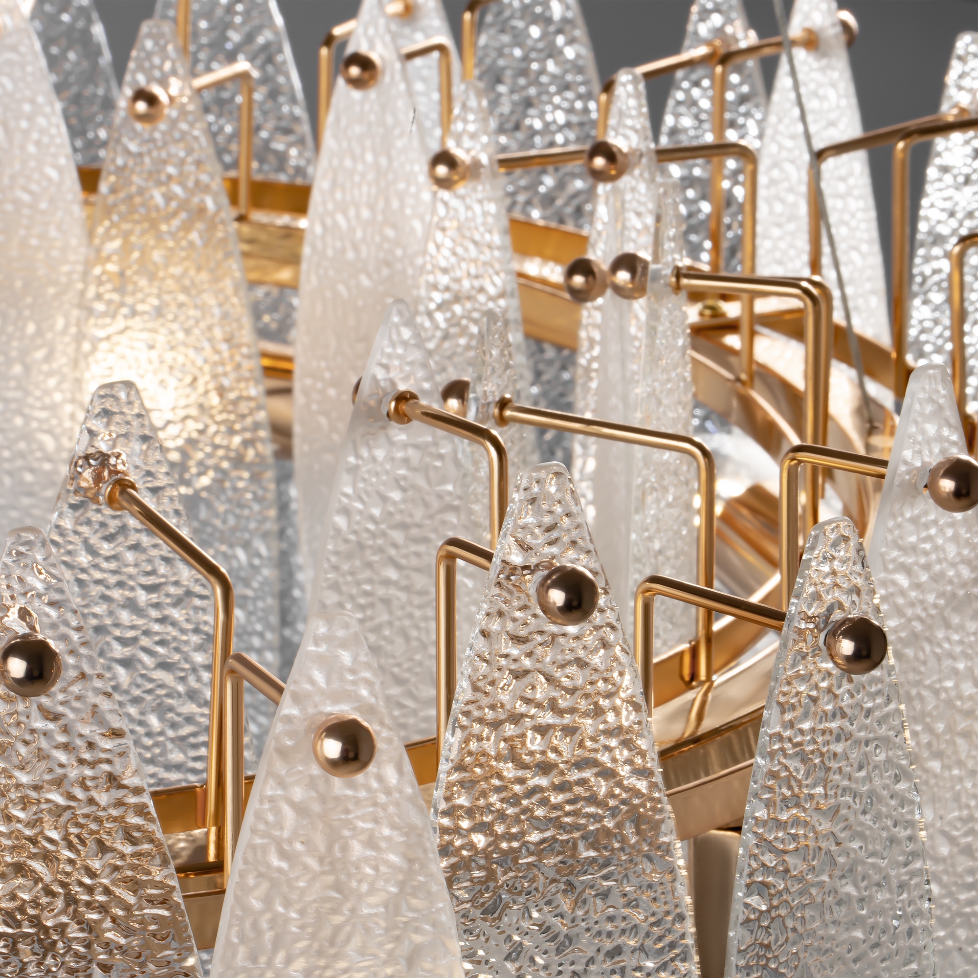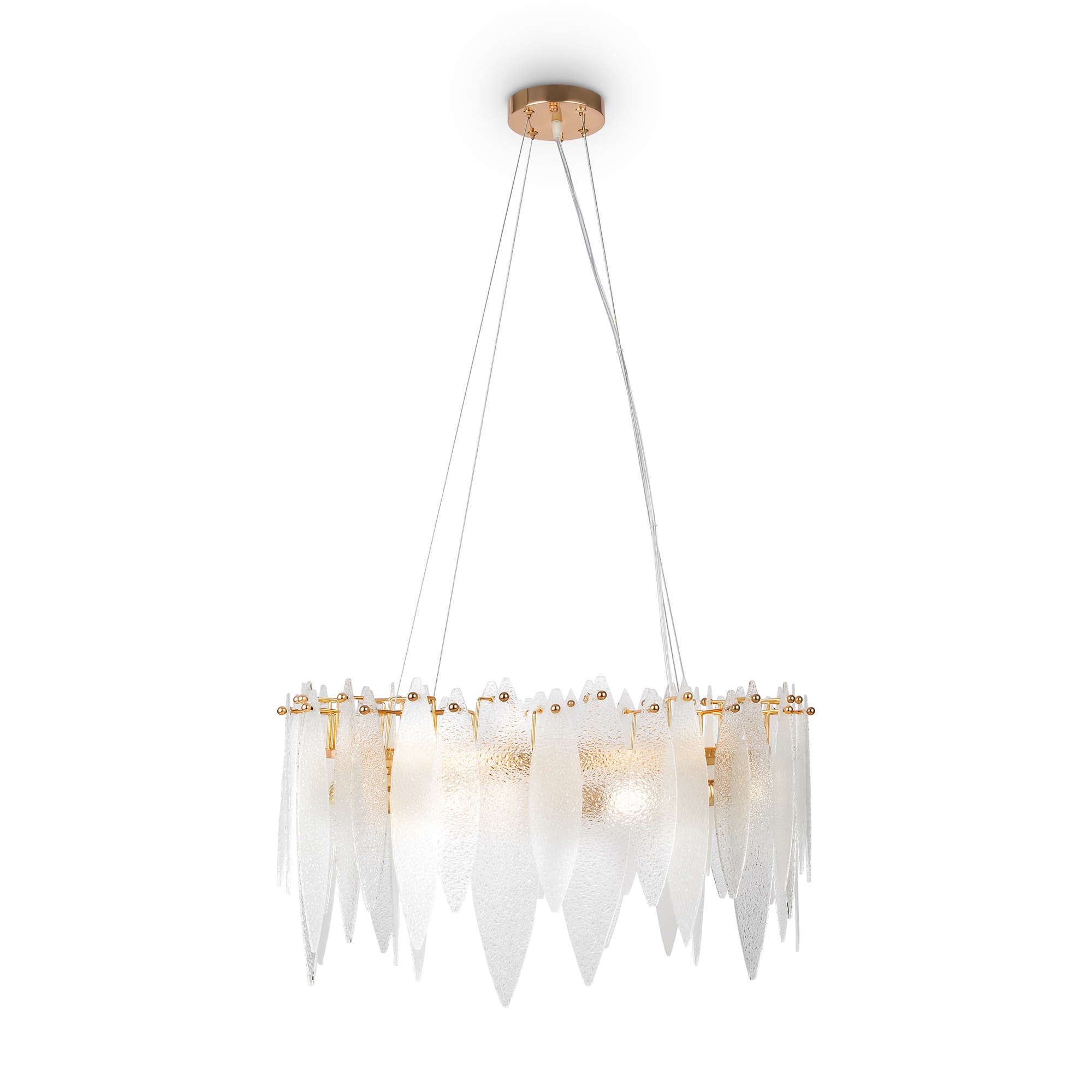Металлическая арматура, цвет – французское золото. Декоративные элементы выполнены из прозрачного стекла в форме пестрых лепестков ледяной фактуры. Источник света – лампы с цоколем Е14, которые скрыты за декоративными подвесками, размещенными на металлической окружности. Высота подвесов регулируется.