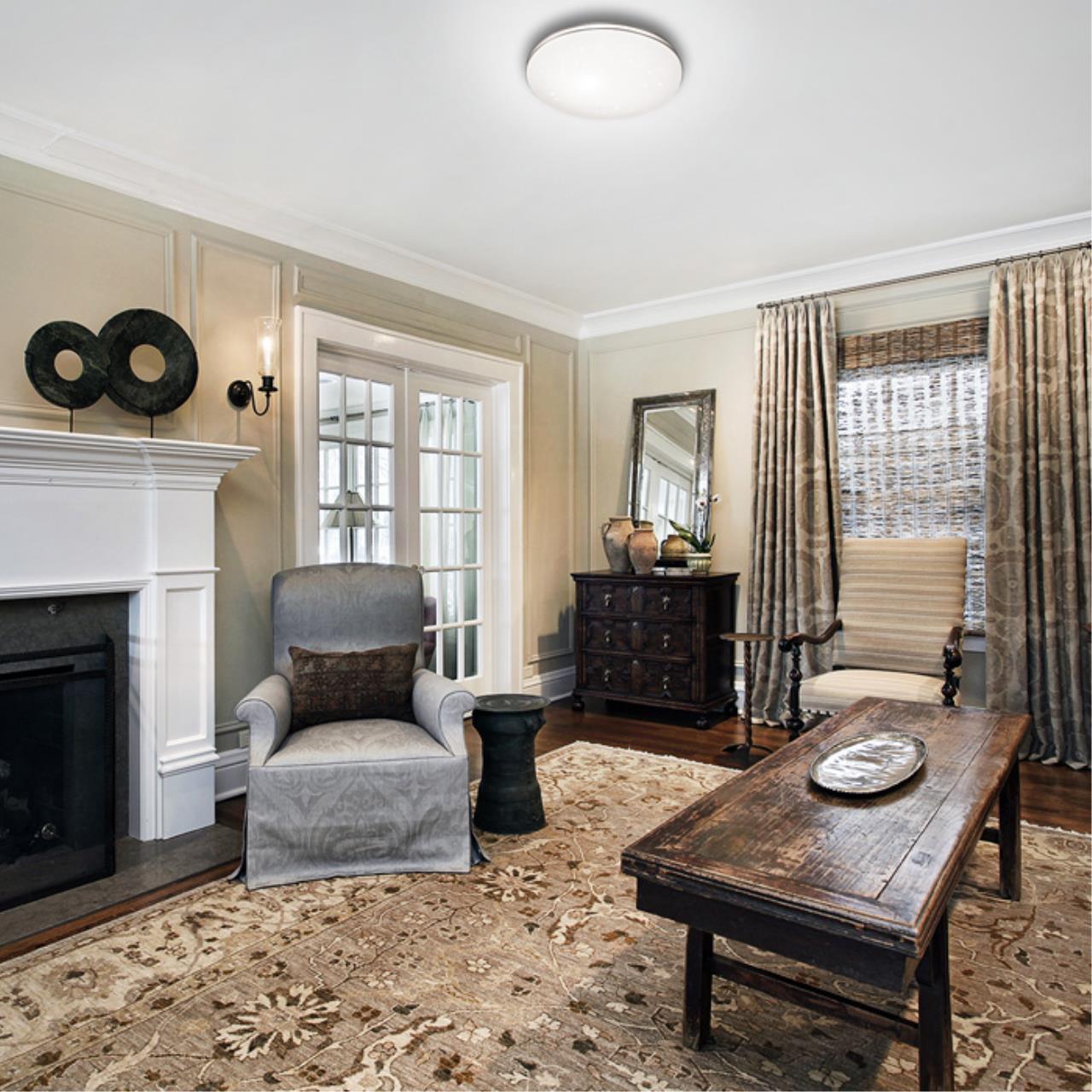 Светильник 2051/CL линии LEKA состоит из металлического основания (базы) и пластикового рассеивателя. Материал рассеивателя - высококачественный акрил белого цвета с глянцевой поверхностью, обеспечивающий светильнику равномерное рассеивание и хорошее светопропускание. Форма плафона: круглая, декорирована ободом цвета хром и прозрачными точками, придающими включенному светильнику красивый эффект "звездного мерцания" и переливания. Степень защиты IP43 позволяет использовать светильник в определенных зонах влажных помещений. В комплект входит заменяемый LED модуль с линзами, мощностью 30Вт, которая соответствует лампе накаливания 270Вт. Источник света имеет комфортную цветовую температуру 4000К (белый свет).