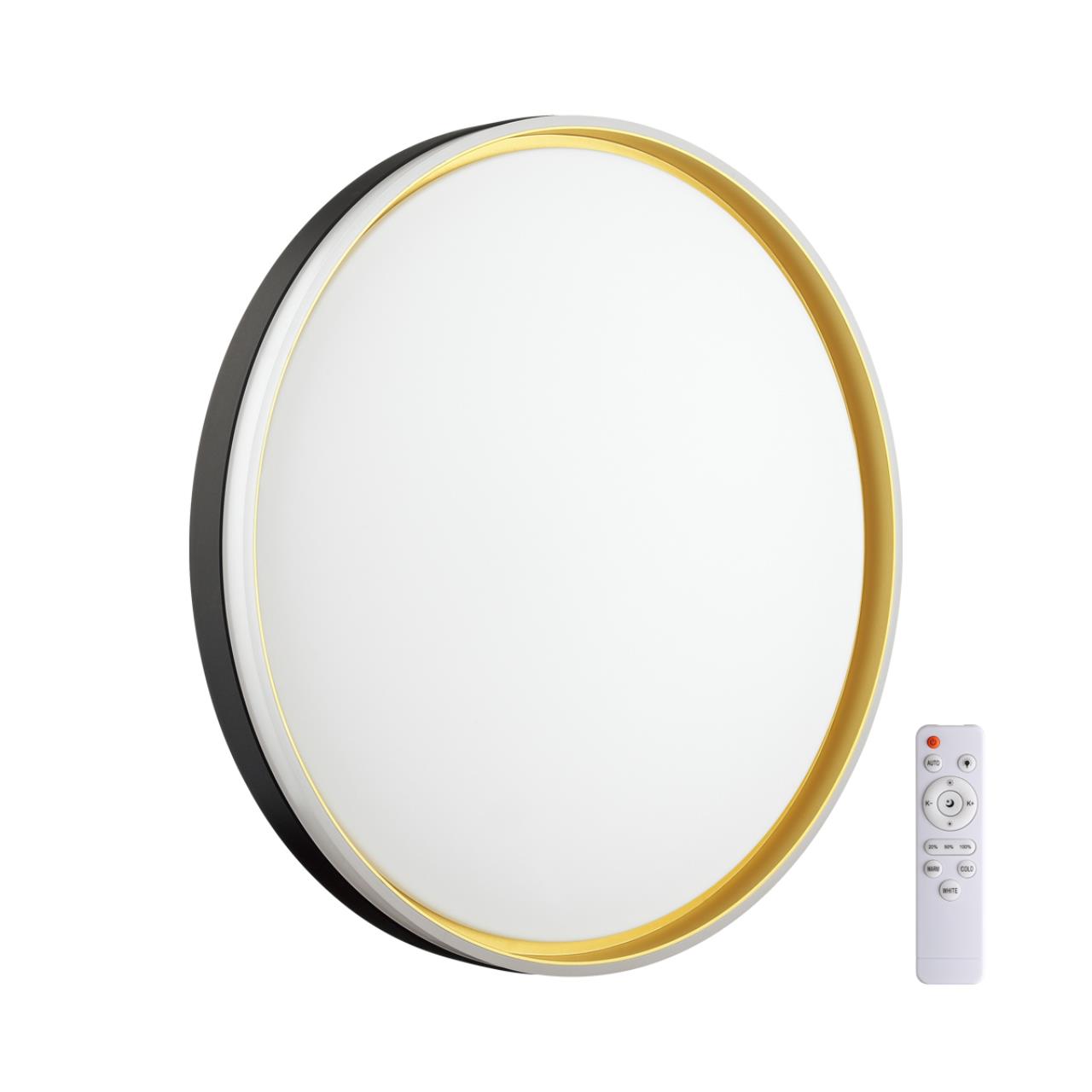 Светильник 7619/DL линии SAVI состоит из металлического основания (базы) и пластикового рассеивателя. Материал рассеивателя - качественный акрил белого цвета с матовой поверхностью, без текстуры. Пластик обеспечивает светильнику равномерное рассеивание и хорошее светопропускание. Форма плафона: круглая, декорирована ободом из пластика черного и золотистого цветов. Степень защиты IP43 позволяет использовать светильник в определенных зонах влажных помещений. В комплект входит заменяемый LED модуль с линзами, мощностью 48Вт, которая соответствует лампе накаливания 430Вт. А также пульт ДУ, с помощью которого осуществляется плавное изменение цветовой температуры 3000-6300К, изменение яркости, переход в режим переключения теплого/белого/холодного/ночного света. Светильник имеет функцию "память".