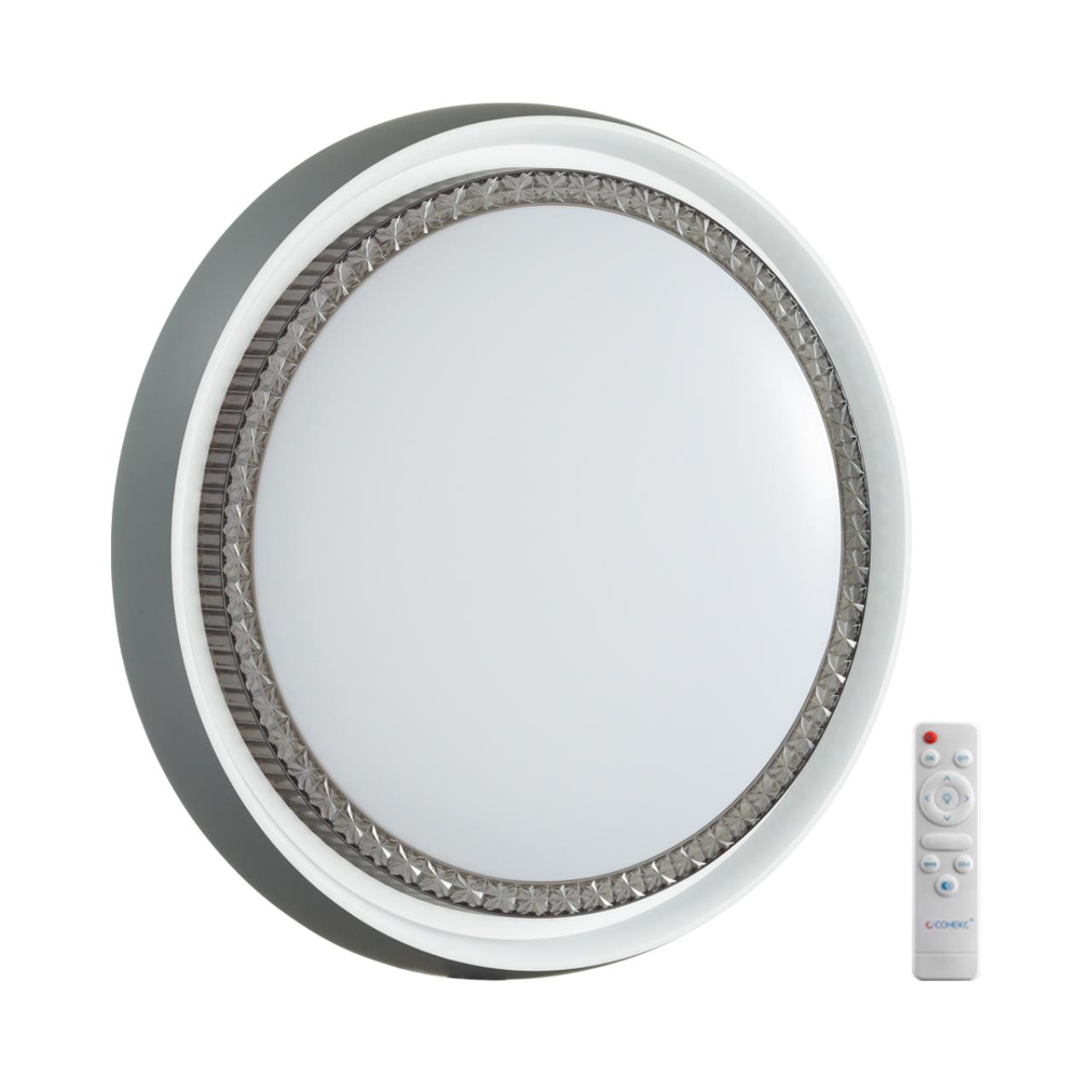 Светильник 7644/DL линии RAHIG состоит из металлического основания (базы) и пластикового рассеивателя. Материал рассеивателя - высококачественный пластик марки PMMA 2.0 белого цвета с матовой поверхностью. Пластик обеспечивает светильнику равномерное рассеивание и хорошее светопропускание. Материал обода - пластик серого цвета с внешней стороны, белого цвета с внутренней стороны.Форма плафона: круглая, декорирована вставкой"под хрусталь" из прозрачного пластика дымчатого цвета. Степень защиты IP43 позволяет использовать светильник в определенных зонах влажных помещений. В комплект входит заменяемый LED модуль с линзами, мощностью 70Вт, которая соответствует лампе накаливания 610Вт. А также пульт ДУ (с креплением на стену), с помощью которого осуществляется плавное изменение цветовой температуры 3000-6000К, изменение яркости, переход в режим переключения теплого/белого/холодного/ночного света. Светильник имеет функцию "память".