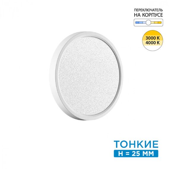 Корпус светильника серии OMEGA WHITE изготовлен из высококачественного противоударного ABS пластика белого цвета. Светильник имеет небольшую высоту всего 25мм, тонкий незаметный ободок и рассеиватель с россыпью серебряных искр, которые создают потрясающий декоративный эффект. Модель OMEGA оснащена переключателем цветовой температуры на тыльной стороне. Температура устанавливается перед монтажом в соответствии с вашими предпочтениями. Накладной светильник имеет удобную систему поверхностного монтажа - монтажную платформу.