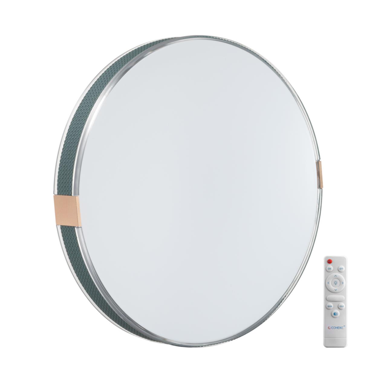 Светильник 7677/EL линии OTIGA BLUE состоит из металлического основания (базы) и пластикового рассеивателя. Материал рассеивателя - высококачественный пластик марки PMMA 2.0 белого цвета с матовой поверхностью, без текстуры. Пластик обеспечивает светильнику равномерное рассеивание и хорошее светопропускание. Форма плафона: круглая, с ободом из прозрачного пластика, декорированного фактурной эко кожей серо-голубого цвета. Обод украшен металлическими клипсами, цвет золото. Степень защиты IP43 позволяет использовать светильник в определенных зонах влажных помещений. В комплект входит заменяемый LED модуль с линзами, мощностью 70Вт, которая соответствует лампе накаливания 610Вт. А также пульт ДУ (с креплением на стену), с помощью которого осуществляется плавное изменение цветовой температуры 3000-6000К, изменение яркости, переход в режим переключения теплого/белого/холодного/ночного света. Светильник имеет функцию "память".