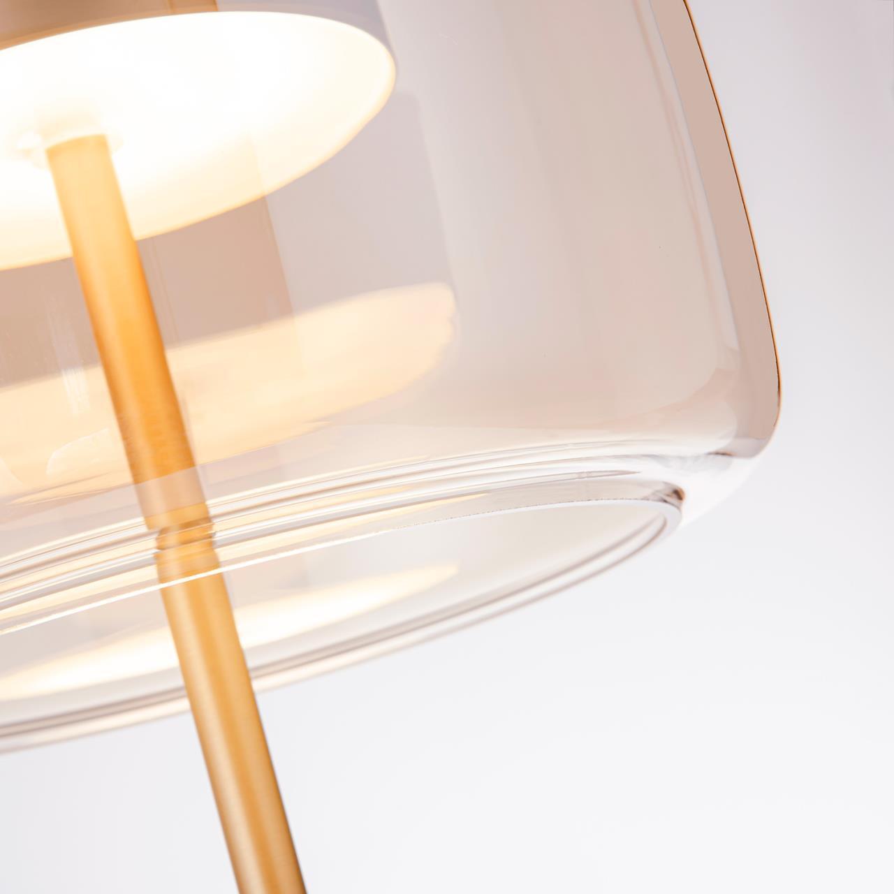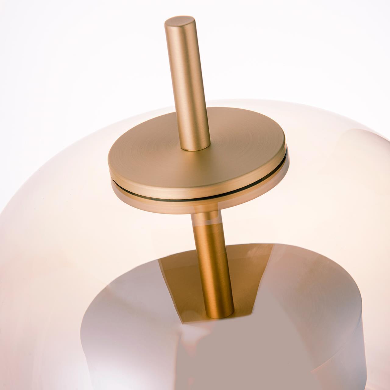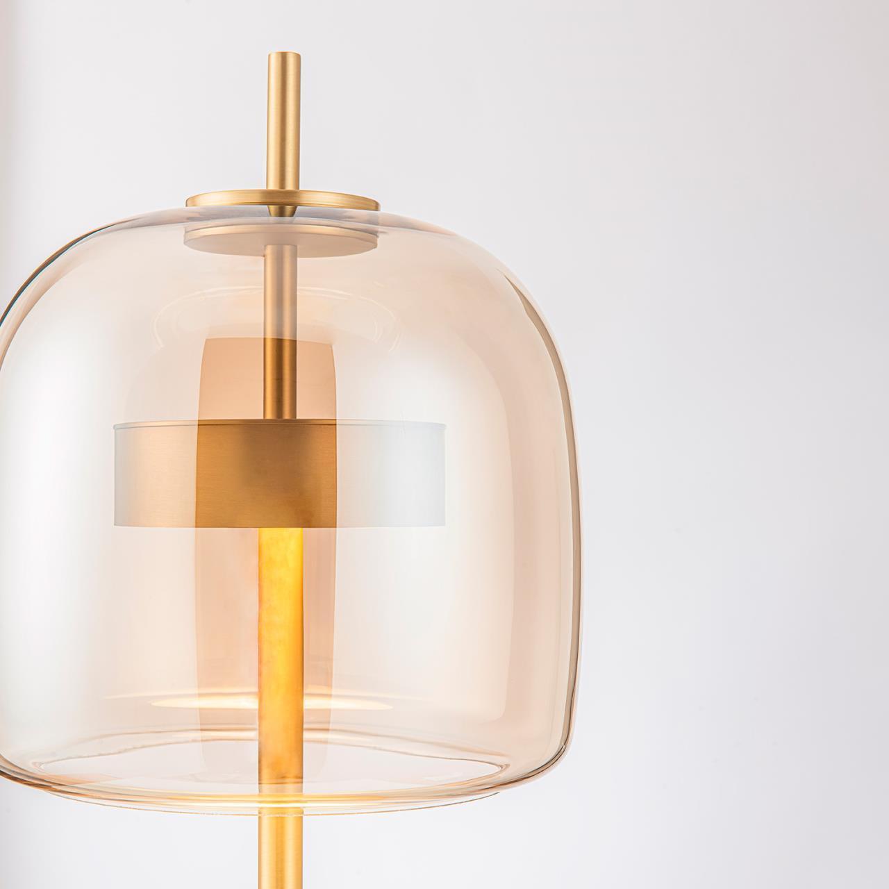 Торшер с каркасом в цвете золото, плафон из янтарного выдувного стекла со встроенным модулем LED.